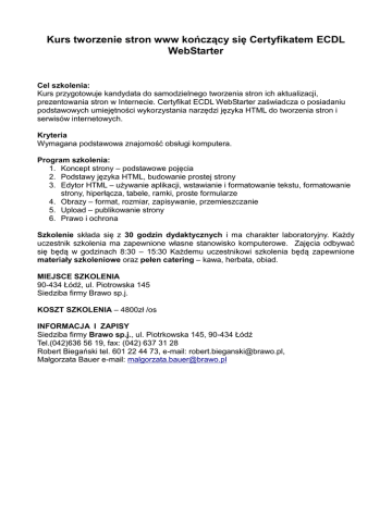 Kurs tworzenie stron www kończący się Certyfikatem ECDL WebStarter Cel szkolenia: Kurs przygotowuje kandydata do samodzielnego tworzenia stron ich aktualizacji, prezentowania stron w Internecie. Certyfikat ECDL WebStarter zaświadcza o posiadaniu podstawowych umiejętności wykorzystania narzędzi języka HTML do tworzenia stron i serwisów internetowych. Kryteria Wymagana podstawowa znajomość obsługi komputera. Program szkolenia: 1. Koncept strony – podstawowe pojęcia 2. Podstawy języka HTML, budowanie prostej strony 3. Edytor HTML – używanie aplikacji, wstawianie i formatowanie tekstu, formatowanie strony, hiperłącza, tabele, ramki, proste formularze 4. Obrazy – format, rozmiar, zapisywanie, przemieszczanie 5. Upload – publikowanie strony 6. Prawo i ochrona Szkolenie składa się z 30 godzin dydaktycznych i ma charakter laboratoryjny. Każdy uczestnik szkolenia ma zapewnione własne stanowisko komputerowe. Zajęcia odbywać się będą w godzinach 8:30 – 15:30 Każdemu uczestnikowi szkolenia będą zapewnione materiały szkoleniowe oraz pełen catering – kawa, herbata, obiad. MIEJSCE SZKOLENIA 90-434 Łódź, ul. Piotrowska 145 Siedziba firmy Brawo sp.j. KOSZT SZKOLENIA – 4800zł /os INFORMACJA I ZAPISY Siedziba firmy Brawo sp.j., ul. Piotrkowska 145, 90-434 Łódź Tel.(042)636 56 19, fax: (042) 637 31 28 Robert Biegański tel. 601 22 44 73, e-mail: [email protected], Małgorzata Bauer e-mail: [email protected]