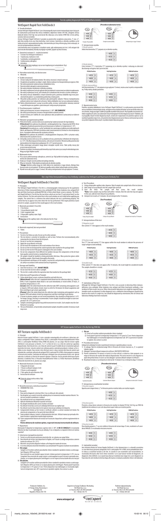 Test do szybkiej diagnostyki FIV/FeLV/Dirofilaria immitis VetExpert Rapid Test FeliCheck-3 [Procedura wykonania testu] • Zasada działania Zestaw VetExpert Rapid FeliCheck-3 jest chromatograficznym testem immunologicznym służącym S S S S C 2 1 C T S C C2 21C1 2 1 C C T TC T S S S C C T TC T S S S S C C2 21C1 2 1 C C T TC T S S S C C2 21C1 2 1 C 2 1 FHW Ab FeLV Ag S C C T TC T C C2 21C1 2 1 C C T TC T S S S C C2 21C1 2 1 C C T TC T S S S C 2 1 CC 2T 1 C T S S S Urządzenie jest podatne na wilgoć i ciepło. Należy wykonać test bezpośrednio po wyjęciu z folii. Nie należy ponownie wykorzystywać składników testu. Rozcieńczalnik zakraplać w pozycji pionowej. Nie należy dotykać membrany w okienku wyników. Nie należy wykonywać testu po upływie daty przydatności zaznaczonej na etykiecie opakowania. Nie należy wykonywać testu, jeśli osłonka jest uszkodzona lub zerwane szczelne zamknięcie Nie należy mieszać składników z innych numerów partii, ponieważ składniki tego testu przeszły kontrolę jakości i są standardową jednostką w danej partii. 9) Wszystkie próby powinno się traktować jako potencjalnie zakaźne. Podczas manipulowania próbami należy nosić rękawiczki ochronne. Należy dokładnie myć ręce po wykonaniu badania. 10)Należy dekontaminować i usunąć wszystkie próby, zestawy i potencjalnie zakażony materiał w sposób bezpieczny zgodnie z państwowymi i miejscowymi przepisami. C 2 1 CC 2T 1 S C 2 1 • Przechowywanie i stabilność 1) Należy przechowywać zestaw w temperaturze 2~30°C. NIE ZAMRAŻAĆ. 2) Nie należy przechowywać zestawu w bezpośrednim nasłonecznieniu 3) Zestaw testowy jest stabilny do czasu upłynięcia daty przydatności zaznaczonej na etykiecie opakowania. • Pobranie i przygotowanie próbek 1) Pełna krew kotów, surowica lub osocze powinny być wykorzystywane do tego badania. [Pełna krew] Krew pobrana do próbówki z antykoagulantem (np. z heparyną lub EDTA). Krew >24godzin od pobrania powinna być przechowywana w lodówce w temperaturze 2~8°C. [Surowica] Krew pobrana na „suchą” probówkę (nie zawierającą środków przeciwkrzepliwych takich, jak heparyna, EDTA lub cytrynianu sodu), pozostawiona na 30 minut w celu skrzepnięcia krwi, a następnie odwirowana dla uzyskania surowicy. [Osocze] Krew pobrana do probówki z antykoagulantem (heparyna, EDTA i cytrynian sodu), odwirowana dla uzyskania osocza. 2) Jeśli próby surowicy lub osocza nie są zbadane od razu, powinny być schłodzone do temperatury 2~8°C. Dla dłuższego przechowywania, zalecane jest mrożenie. Mrożone próby powinny być wprowadzone do temperatury pokojowej (18~25°C) przed użyciem. 3) Próby zawierające precypitat mogą dawać niespójne wyniki testu. Takie próby muszą być oczyszczane przed oceną. 4) Powinno się unikać stosowania prób hemolitycznych lub zanieczyszczonych mikrobiologicznie. Mogą wystąpić błędne wyniki. S T S S S S C C2 21C1 2 1 C C T TC T S S S C C2 21C1 2 1 C C 2 1 S C C T TC T S S S C C2 21C1 2 1 C C T TC T S S S C C2 21C1 2 1 C C T TC T S S S T C 2 1 C T S C C T TC T C 2 1 S S S C C2 21C1 2 1 C C T TC T S S S C C2 21C1 2 1 C C T TC T S S S C C2 21C1 2 1 S C 2 1 C T S C 2 1 C T S C 2 1 2) Wynik dodatni Linia testowa (“T”) i kontrolna (“C”) pojawiają się w okienku wyniku i wskazują na obecność docelowego antygenu lub/i przeciwciała. S S S C 2 1 CC 2T 1 C T S C 2 1 CC 2T 1 S C C2 21C1 2 1 C FeLV Ag Positive S S C 2 1 CC 2T 1 C T S C 2 1 CC 2T 1 T S S C 2 1 C T S C 2 1 C C2 21C1 2 1 C 2 1 T CC 2T 1 C T C C 2 1 C T S C FHW Ab FeLV Ag FIV Ab FHW Ab FeLV Ag FIV Ab T C 2 1 C T S S S T S CC 2T 1 C T S C 2 1 CC 2T 1 C T S C 2 1 CC 2T 1 C S S S T S FHW Ab Positive C 2 1 C T C 2 C 1 C T S T S S CC 2T 1 C 2 C 1 T S C 2 1 CC 2T 1 C T S C 2 1 CC 2T 1 S C T S C 2 1 C T S C 2 1 C T S C 2 1 S S 3) Wynik nieprawidłowy Jeśli linia kontrolna (“C”) nie pojawia się po upływie 15 minut, można uznać wynik za nieprawidłowy. Próby należy zbadać ponownie. C 2 1 C T S CC 2T 1 C T S C 2 1 CC 2T 1 C T S C 2 1 CC 2T 1 C 2 1 C FHW Ab FeLV Ag FIV Ab FHW Ab FeLV Ag FIV Ab C S S FIV Ab Positive CC 2T 1 C T C 2 1 C T S S S FHW Ab FeLV Ag S S CC 2T 1 C T S S C C T TC FIV Ab S S T T S S C C2 21C1 2 1 C C T TC T FHW Ab FeLV Ag FHW Ab FeLV Ag FIV Ab FHW Ab FeLV Ag FIV Ab C 2 1 CC 2T 1 C C 2 1 C FIV Ab C C2 21C1 2 1 S S C C2 21C1 2 1 C C T TC T T FIV Ab S S S FIV Ab T C C 2 1 C T Interpretacja w ciągu 15 minut S FHW Ab FeLV Ag FIV Ab FHW Ab FeLV Ag FIV Ab FHW Ab FeLV Ag FIV Ab C C T TC S S S FHW Ab FeLV Ag FIV Ab FHW Ab FeLV Ag FIV Ab FHW Ab FeLV Ag FIV Ab S S C C2 21C1 2 1 C C T TC T FHW Ab FeLV Ag FIV Ab FHW Ab FeLV Ag FIV Ab FHW Ab FeLV Ag FIV Ab CC 2T 1 C T C 2 1 CC 2T 1 C T S C 2 1 C T C C2 21C1 2 1 Interpretacja wyniku 1) Wyniki ujemne Jedna linia kontrolna (“C”) pojawia się w okienku wyniku. FHW Ab FeLV Ag FIV Ab FHW Ab FeLV Ag FIV Ab T T FIV Ab C C T TC 3 krople rozcieńczalnika 1 kropla (10 µl) próbki • S S S 2 1T C C2 21C1C C C T TC T FHW Ab FeLV Ag C C2 21C1 2 1 S S C C2 21C1 2 1 C C T TC T FIV Ab S FeLV Ag S S S FHW Ab FeLV Ag FIV AbFHW Ab FHW Ab FeLV Ag FIV Ab FHW Ab FeLV Ag FIV Ab S S C C2 21C1 2 1 C C T TC T FHW Ab FeLV Ag C C2 21C1 2 1 C C T TC T FHW Ab FeLV Ag FIV Ab FHW Ab FeLV Ag FIV Ab FIV Ab FHW Ab FeLV Ag FIV Ab S FHW Ab FeLV Ag FHW Ab FeLV Ag FIV Ab FHW Ab FeLV Ag FIV Ab FHW Ab FeLV Ag FIV Ab S S FHW Ab FeLV Ag FIV Ab FHW Ab FeLV Ag FIV Ab FHW Ab FeLV Ag FIV Ab FHW Ab FeLV Ag FIV Ab 2) 3) 4) 5) 6) 7) 8) T FHW Ab FeLV Ag FIV Ab FHW Ab FeLV Ag FIV Ab FHW Ab FeLV Ag FIV Ab FHW Ab FeLV Ag FIV Ab C • • Środki ostrożności 1) Zestaw wyłącznie do badania kotów. Nie należy stosować u innych zwierząt. Potrzebne materiały, nie dostarczone 1)Minutnik. C C T TC FHW Ab FeLV Ag FIV Ab FHW Ab FeLV Ag FIV Ab FHW Ab FeLV Ag FIV Ab • Zawartość zestawu (5 – testów/zestawów) 1) 5 testów Test VetExpert FeliCheck-3 2) 1 buteleczka z buforem (3 ml) 3) 5 probówka z antykoagulantem 4) 