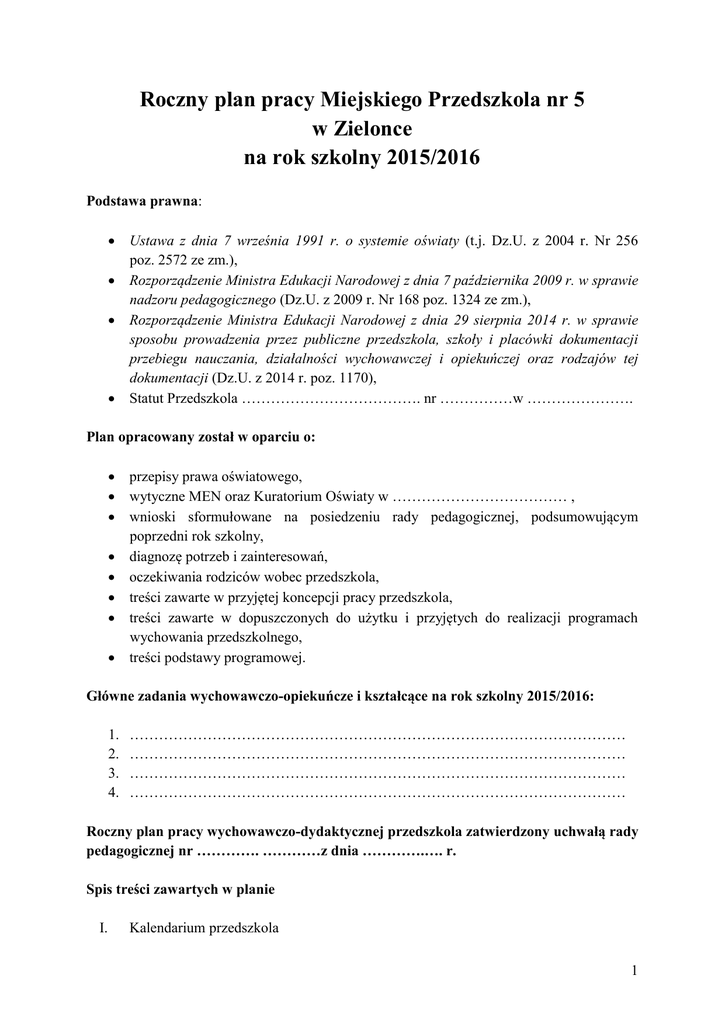 Roczny plan pracy Miejskiego Przedszkola nr 5 w Zielonce na rok szkolny 2015/2016 Podstawa prawna: Ustawa z dnia 7 września 1991 r. o systemie oświaty (t.j. Dz.U. z 2004 r. Nr 256 poz. 2572 ze zm.), Rozporządzenie Ministra Edukacji Narodowej z dnia 7 października 2009 r. w sprawie nadzoru pedagogicznego (Dz.U. z 2009 r. Nr 168 poz. 1324 ze zm.), Rozporządzenie Ministra Edukacji Narodowej z dnia 29 sierpnia 2014 r. w sprawie sposobu prowadzenia przez publiczne przedszkola, szkoły i placówki dokumentacji przebiegu nauczania, działalności wychowawczej i opiekuńczej oraz rodzajów tej dokumentacji (Dz.U. z 2014 r. poz. 1170), Statut Przedszkola ………………………………. nr ……………w …………………. Plan opracowany został w oparciu o: przepisy prawa oświatowego, wytyczne MEN oraz Kuratorium Oświaty w ……………………………… , wnioski sformułowane na posiedzeniu rady pedagogicznej, podsumowującym poprzedni rok szkolny, diagnozę potrzeb i zainteresowań, oczekiwania rodziców wobec przedszkola, treści zawarte w przyjętej koncepcji pracy przedszkola, treści zawarte w dopuszczonych do użytku i przyjętych do realizacji programach wychowania przedszkolnego, treści podstawy programowej. Główne zadania wychowawczo-opiekuńcze i kształcące na rok szkolny 2015/2016: 1. 2. 3. 4. ………………………………………………………………………………………… ………………………………………………………………………………………… ………………………………………………………………………………………… ………………………………………………………………………………………… Roczny plan pracy wychowawczo-dydaktycznej przedszkola zatwierdzony uchwałą rady pedagogicznej nr …………. …………z dnia ………….…. r. Spis treści zawartych w planie I. Kalendarium przedszkola 1 II. III. IV. V. VI. VII. VIII. I. Zestaw programów wychowania przedszkolnego przyjętych do realizacji Harmonogram imprez przedszkolnych Plan współpracy z rodzicami Plan współpracy ze szkołą podstawową Harmonogram wycieczek Harmonogram konkursów Harmonogram zebrań rady pedagogicznej Kalendarium przedszkola w roku szkolnym 2015/2016 Termin Zadanie 1 września 2015 r. Rozpoczęcie roku szkolnego 18 września 2015 r. Sprzątanie świata 25 września 2015 r. Zebrania z rodzicami 28 września 2015 r. Pasowanie na przedszkolaka 30 września 2015 r. Dzień Chłopaka 14 października 2015 r. Uroczystości związane z Dniem Edukacji Narodowej 1 listopada 2015 r. Wszystkich Świętych 11 listopada 2015 r. Narodowe Święto Niepodległości 20 listopada 2015 r. Zebrania z rodzicami 30 listopada 2015 r. Andrzejki 7 grudnia 2015 r. Mikołajki 21 grudnia 2015 r. Jasełka szkolne 22 grudnia 2015 r. Wigilia przedszkolna 23 grudnia 2015–3 stycznia 2016 r. Zimowa przerwa świąteczna 6 stycznia 2016 r. Dzień ustawowo wolny od pracy (Trzech Króli) 8 stycznia 2016 r. Bal karnawałowy 21 stycznia 2016 r. Uroczystości związane z Dniem Babci i Dniem Dziadka 29 stycznia 2016 r. Zebranie z rodzicami 1–14 lutego 2016 r. (zależnie od regionu) Ferie zimowe 15 lutego 2016 r. Walentynki 8 marca 2016 r. Uroczystości związane z Dniem Kobiet 21 marca 2016 r. Pierwszy Dzień Wiosny 24–29 marca 2016 r. Wiosenna przerwa świąteczna 2 15 kwietnia 2016 r. Zebrania z rodzicami 1 maja 2016 r. Święto Pracy 3 maja 2016 r. Święto Konstytucji 3 Maja 25 maja 2016 r. Szkolne uroczystości związane z Dniem Matki 26 maja 2016 r. Boże Ciało 1 czerwca 2016 r. Uroczystości związane z Dniem Dziecka 23 czerwca 2016 r. Szkolne uroczystości związane z Dniem Ojca 27 czerwca 2016 r. Posiedzenie podsumowujące rady pedagogicznej ………………….. Wakacyjny dyżur przedszkola Wykaz programów wychowania przedszkolnego przyjętych do realizacji w placówce w roku szkolnym 2015/2016 1.………………………………………………………………………………………………… ………………………………………………………………………………………………… 2.………………………………………………………………………………………………… ………………………………………………………………………………………………… 3.………………………………………………………………………………………………… ………………………………………………………………………………………………… ………………………………………………………………………………………………… ………………………………………………………………………………………………… ………………………………………………………………………………………………. II. III. Harmonogram imprez i uroczystości przedszkolnych Temat uroczystości i imprezy Termin Pasowanie na przedszkolaka Mikołajki Jasełka Dzień Babci i Dziadka Bal karnawałowy Święto Wiosny Festyn rodzinny – Dzień Matki i Ojca Dzień Dziecka – Dzień Przedszkolaka Wieczór talentów Zakończenie roku szkolnego 3 IV. Plan współpracy z rodzicami Zadania Planowanie rozwoju przedszkola Formy realizacji Wspomaganie rozwoju dziecka Termin Kwestionariusz współpracy z rodzicami Wrzesień Przedstawienie założeń programu rozwoju przedszkola na rok szkolny 2015/2016 Zapoznanie rodziców ze statutem przedszkola i innymi dokumentami przedszkola Umowa z rodzicami na godziny pobytu dziecka w przedszkolu Bieżące informowanie rodziców o planach wychowawczo-dydaktycznych Zapoznanie rodziców z podstawą Cały rok szkolny programową – omówienie poszczególnych obszarów edukacyjnych Wykaz programów wychowania przedszkolnego Organizowanie i prowadzenie działań wynikających z założeń p