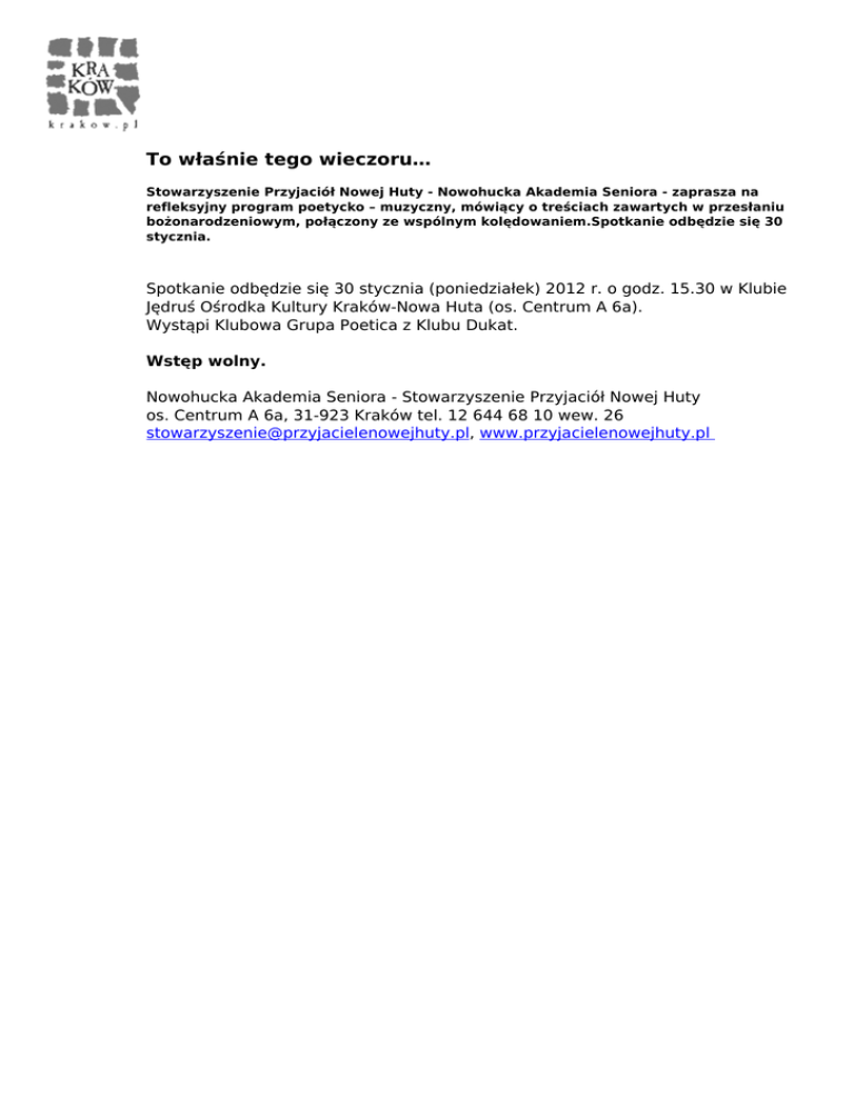 To właśnie tego wieczoru… Stowarzyszenie Przyjaciół Nowej Huty - Nowohucka Akademia Seniora - zaprasza na refleksyjny program poetycko – muzyczny, mówiący o treściach zawartych w przesłaniu bożonarodzeniowym, połączony ze wspólnym kolędowaniem.Spotkanie odbędzie się 30 stycznia. Spotkanie odbędzie się 30 stycznia (poniedziałek) 2012 r. o godz. 15.30 w Klubie Jędruś Ośrodka Kultury Kraków-Nowa Huta (os. Centrum A 6a). Wystąpi Klubowa Grupa Poetica z Klubu Dukat. Wstęp wolny. Nowohucka Akademia Seniora - Stowarzyszenie Przyjaciół Nowej Huty os. Centrum A 6a, 31-923 Kraków tel. 12 644 68 10 wew. 26 [email protected], www.przyjacielenowejhuty.pl Powered by TCPDF (www.tcpdf.org)