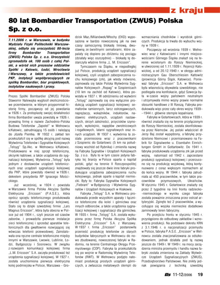 80 lat Bombardier Transportation (ZWUS) Polska Sp. z o.o. 7.11.2006 r. w Warszawie, w budynku Wydziału Fizyki Politechniki Warszawskiej, odbyła się uroczystość 80-lecia firmy Bombardier Transportation (ZWUS) Polska Sp. z. o.o. Uroczystość zgromadziła ok. 100 osób z całej Polski, a wśród nich prezesów oddziałów Spółki z Katowic, Łodzi, Wrocławia i Warszawy, a także przedstawicieli PKP, instytucji współpracujących ze spółką Bombardier, biur projektowych, instytutów naukowych i prasy. Prezes Spółki Bombardier (ZWUS) Polska Sławomir Nalewajka wygłosił okolicznościowe przemówienie, w którym przypomniał historię firmy, począwszy od jej powstania w 1926 r. Za protoplastę swojej działalności firma Bombardier uważa powstałą w 1926 r. prywatną firmę o nazwie Zachodnio-Polska Budowa Telefonów „Zapotel” w Wełnowcu k/Katowic, zatrudniającą 15 osób i należącą do Józefa Pientka. W 1932 r. zakład ten przekształcił się w spółkę akcyjną pod nazwą Wytwórnia Telefonów i Sygnałów Kolejowych „Telsyg” Sp.Akc. w Wełnowcu k/Katowic. Produkowano w niej sprzęt telefoniczny, skrzynki kablowe, a także urządzenia do sygnalizacji kolejowej. Wytwórnia „Telsyg” była jednym z dostawców urządzeń telefonicznych oraz urządzeń sygnalizacji kolejowej dla PKP, które powstały również w 1926 r. dekretem prezydenta RP Ignacego Mościckiego. Już wcześniej, w 1924 r. powstała w Warszawie firma Polska Akcyjna Spółka Elektryczna „Ericsson” (P.A.S.E.), która oprócz sprzętu telefonicznego produkowała również urządzenia sygnalizacji kolejowej. Stało się to dzięki szwedzkiej firmie „Lars Magnus Ericsson”, która była obecna w Polsce już od 1904 r., czyli jeszcze od czasów zaborów, i prowadziła pierwsze instalacje sieci telefonicznej i sprzedaż aparatów telefonicznych dla gwałtownie rozwijającej się wówczas telefonii przewodowej. Zainstalowała ona ręczne centrale telefoniczne między innymi w Warszawie, Lwowie, Lublinie, Łodzi, Bydgoszczy i Sosnowcu. W związku z rozwojem komunikacji kolejowej firma „L.M. Ericsson” S.A. zaczęła produkować też urządzenia sygnalizacji kolejowej. W 1927 r. została uruchomiona pierwsza elektryczna kolej podmiejska w Polsce, Warszawa – Gro- dzisk Maz./Milanówek/Włochy (EKD) wyposażona w bardzo nowoczesną jak na owe czasy samoczynną blokadę liniową, dwustawną ze świetlnymi semaforami, które zapalały się dopiero po zbliżeniu się pociągu (działały więc oszczędnie) – blokadę tę dostarczyła właśnie firma „L. M. Ericsson”. Tymczasem na Śląsku, w niepodległej już Polsce, produkcją urządzeń sygnalizacji kolejowej, czyli urządzeń zabezpieczenia ruchu kolejowego (zrk), jak wtedy mówiono, zajmowała się także Polska Wytwórnia Sygnałów Kolejowych „Ropag” w Szopienicach (10 km na zachód od Katowic), która powstała w 1927 r. W odróżnieniu od wytwórni „Telsyg” zajmowała się ona wyłącznie produkcją urządzeń sygnalizacji kolejowej: semaforów ramiennych, tarcz ostrzegawczych, naprężaczy, wskaźników, induktorów, nastawnic elektrycznych, urządzeń nastawczych, skrzyń zależności, przycisków szynowych, wykolejnic, napędów zwrotnicowych i rogatkowych, latarni sygnałowych oraz innych urządzeń. W 1937 r. wytwórnia ta została przeniesiona wraz z pracownikami z Szopienic do Gotartowic (5 km na połud niowy wschód od Rybnika) i zmieniła nazwę na Fabryka Sygnałów i Urządzeń Kolejowych Sp. z o.o. Była to w tym czasie jedyna fab ryka tej branży w Polsce oparta o kapitał polski, gdyż na terenie II Rzeczpospolitej znajdowały się jeszcze dwie inne fabryki produkujące urządzenia zabezpieczenia ruchu kolejowego, jednak oparte o kapitał niemiecki. Były to: Fabryka Sygnałów Kolejowych „Fiebrant” w Bydgoszczy i Wytwórnia Sygnałów i Urządzeń Kolejowych w Krakowie. Fabryka „Telsyg” S.A. w Wełnowcu produkowała przede wszystkim aparaty i łącznice telefoniczne dla kolei i górnictwa oraz innych odbiorców, a także urządzenia sygnalizacji kolejowej i sygnalizacji dla górnictwa. W 1935 r. firma „Telsyg” S.A. została wykupiona przez firmę Polska Akcyjna Spółka Elektryczna „Ericsson” S.A. z Warszawy. W 1937 r. firma „Ericsson” postanowiła przenieść produkcję telefonów ze starych budynków fabrycznych w Wełnowcu do nowo zbudowanej, nowoczesnej fabryki w Radomiu, na terenie Centralnego Okręgu Przemysłowego (COP). Fabryka ta przekształciła się po wojnie w Radomską Wytwórnię Telefonów (RWT). W Wełnowcu podjęto natomiast produkcję prostych urządzeń górniczych, a zwłaszcza metalowych stempli do wzmacniania chodników i wyrobisk górniczych. Produkcja ta trwała do wybuchu wojny w 1939 r. Począwszy od września 1939 r. Wełnowiec wraz z Katowicami i innymi miejscowościami Górnego Śląska znalazł się na terenie wcielonym do Rzeszy Niemieckiej, w utworzonej od 1.11.1939 r. Rejencji Katowickiej, a od 20.12.1940 r. w okręgu administracyjnym Gau Oberschlesien Kattowitz (prowincja Górny Śląsk, Katowice). Ponieważ fabryka „Ericsson” S.A. w Wełnowcu była własnością obywatela szwedzkiego, nie podlegała ona konfiskacie, gdyż Szwecja była w czasie wojny państwem neutralnym i utrzymywała mimo wojny prawie normalne stosunki handlowe z III Rzeszą. Fabryka produkowała więc przez cały okres wojny 1939– –1944 r. głównie stemple kopalniane. Fabryka w Gotartowicach, która w 1939 r. również znalazła się na terenie przyłączonym do Rzeszy Niemieckiej, została skonfiskowana przez Niemców. Jej polski właściciel dr Jerzy Baj został wypędzony, a fabrykę przydzielono Niemcowi i przemianowano na Fabrik für Signalwerke u. Eisenbahn Einrichtungen GmbH in Gottartowitz. Do 1941 r. fabryka produkowała urządzenia zrk jak przed wojną, natomiast od 1942 r. zaprzestano produkcji sygnalizacji kolejowej i przerzucono się na produkcję wojskową, któ