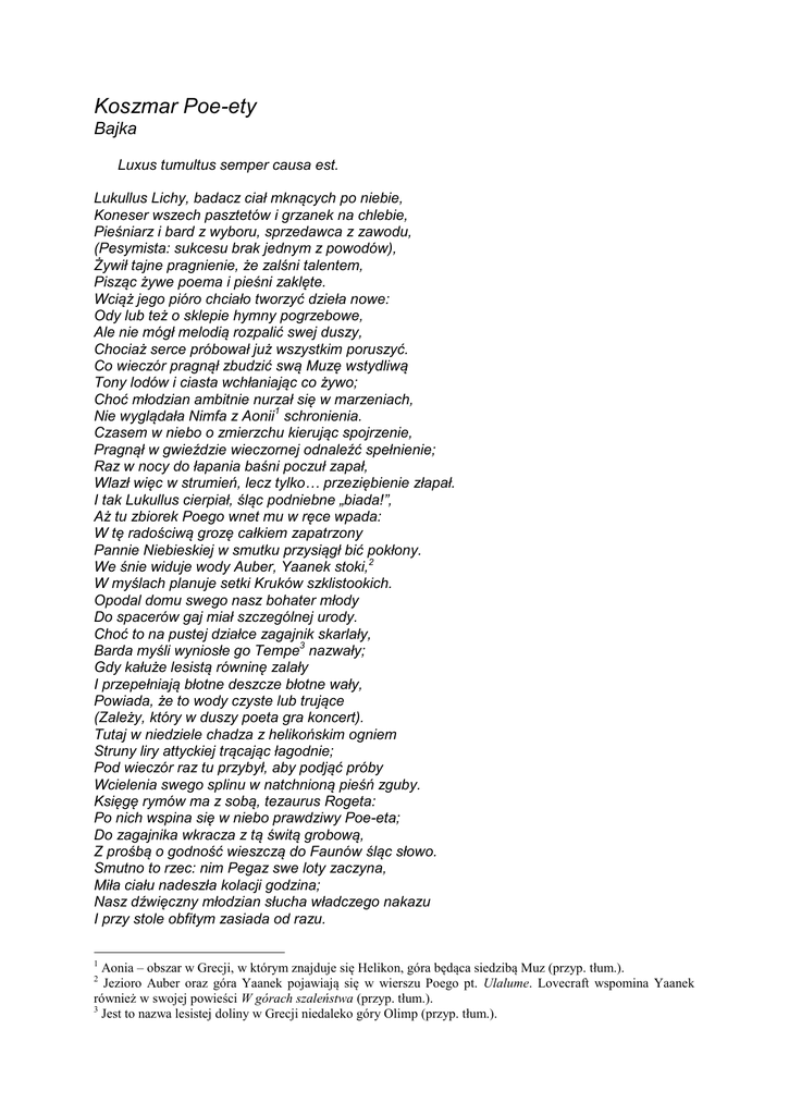 Koszmar Poe-ety Bajka Luxus tumultus semper causa est. Lukullus Lichy, badacz ciał mknących po niebie, Koneser wszech pasztetów i grzanek na chlebie, Pieśniarz i bard z wyboru, sprzedawca z zawodu, (Pesymista: sukcesu brak jednym z powodów), Żywił tajne pragnienie, że zalśni talentem, Pisząc żywe poema i pieśni zaklęte. Wciąż jego pióro chciało tworzyć dzieła nowe: Ody lub też o sklepie hymny pogrzebowe, Ale nie mógł melodią rozpalić swej duszy, Chociaż serce próbował już wszystkim poruszyć. Co wieczór pragnął zbudzić swą Muzę wstydliwą Tony lodów i ciasta wchłaniając co żywo; Choć młodzian ambitnie nurzał się w marzeniach, Nie wyglądała Nimfa z Aonii1 schronienia. Czasem w niebo o zmierzchu kierując spojrzenie, Pragnął w gwieździe wieczornej odnaleźć spełnienie; Raz w nocy do łapania baśni poczuł zapał, Wlazł więc w strumień, lecz tylko… przeziębienie złapał. I tak Lukullus cierpiał, śląc podniebne „biada!”, Aż tu zbiorek Poego wnet mu w ręce wpada: W tę radościwą grozę całkiem zapatrzony Pannie Niebieskiej w smutku przysiągł bić pokłony. We śnie widuje wody Auber, Yaanek stoki,2 W myślach planuje setki Kruków szklistookich. Opodal domu swego nasz bohater młody Do spacerów gaj miał szczególnej urody. Choć to na pustej działce zagajnik skarlały, Barda myśli wyniosłe go Tempe3 nazwały; Gdy kałuże lesistą równinę zalały I przepełniają błotne deszcze błotne wały, Powiada, że to wody czyste lub trujące (Zależy, który w duszy poeta gra koncert). Tutaj w niedziele chadza z helikońskim ogniem Struny liry attyckiej trącając łagodnie; Pod wieczór raz tu przybył, aby podjąć próby Wcielenia swego splinu w natchnioną pieśń zguby. Księgę rymów ma z sobą, tezaurus Rogeta: Po nich wspina się w niebo prawdziwy Poe-eta; Do zagajnika wkracza z tą świtą grobową, Z prośbą o godność wieszczą do Faunów śląc słowo. Smutno to rzec: nim Pegaz swe loty zaczyna, Miła ciału nadeszła kolacji godzina; Nasz dźwięczny młodzian słucha władczego nakazu I przy stole obfitym zasiada od razu. 1 Aonia – obszar w Grecji, w którym znajduje się Helikon, góra będąca siedzibą Muz (przyp. tłum.). Jezioro Auber oraz góra Yaanek pojawiają się w wierszu Poego pt. Ulalume. Lovecraft wspomina Yaanek również w swojej powieści W górach szaleństwa (przyp. tłum.). 3 Jest to nazwa lesistej doliny w Grecji niedaleko góry Olimp (przyp. tłum.). 2 Chociaż zbyt prozaiczna byłaby relacja Z czego była dokładnie złożona kolacja (Chęć czytania list długich dość szybko umiera, Co znamy z katalogu okrętów Homera), Powiemy tylko jedno: nim kres uczty nastał, W szybkim tempie zniknęła straszna ilość ciasta! Wkrótce bard młody w swoje powraca komnaty: Szuka Somnusa, chłonąc Lidii aromaty;4 Przez okno duszą skacze, w gwiazd tonąc gęstwinie, A Orion nuci pieśni nim w sen bard odpłynie. Wyrusza orszak skrzatów z cienistej doliny W północ każdą tańczący wśród śpiącej równiny, By chwalić skromnych, a strzec, aby się nie zwiedli, Owych co nieroztropnie, ale dużo jedli. Oto diakon Smith: połysk wielkiego nochala Eliksiru Pro5 aurę przypuszczać pozwala; Przy łożu stoją szydząc z czerwonej facjaty: Człek we śnie tonie w morzu wężowej zatraty. Następny z długiej listy, by zgraję ugościć, Jest nasz młody Endymion6, chrapiący w ciemności; Jego twarz promienieje uśmiechem jak słonko, Gdy księżyc mu się marzy i pyszne jedzonko. Skrzat-dowódca młodziana śpiącego wnet bada I niezwykłe na niego zaklęcie nakłada: Usta, wcześniej utkwione w ciasteczku lukrowym, Brzmią teraz w sennej gwarze dziwacznymi słowy; Opisują obszernie swej głowy marzenia, Wierszem białym bełkocząc nieziemski Poe-emat: Aletheia Phrikodes Omnia risus et omnia pulvis et omnia nihil. Diable chmury wezbrane w otchłannym przestworze Bezdźwięcznego nieba noc posępną dusiły; Nie dobiegały również zwykłe szepty bagnisk, Ni jesiennego wichru odgłos nad mokradłem, Ni mrukliwe hałasy bezsennego gaju, Którego wnętrze nigdy nie widziało słońca. W tym właśnie zagajniku czyha jar straszliwy, Drzew niemal pozbawiony; w środku staw się czai O nieznanych głębinach; woda z ciemnym licem (Choć nikt nie zna jej barwy, ponieważ dnia światło W strachu z dala się trzyma od brzegów cienistych). Opodal w zboczu wzgórza jaskinia ziejąca Tchnie z głębin niepojętych zatęchłym powietrzem: Od niego więdną liście na drzewach skarlałych, Stojących wokół, mroki upiorne drapiących Groźnymi gałęziami. Do jaru diablego Schodzą się leśne stwory i rzadko wracają: 4 Somnus – rzymski bóg snu. Lidia – starożytne państwo w zachodniej Azji Mniejszej (przyp. tłum.). Nalewka na bazie aloesu i mirry pita w celach leczniczych (przyp. tłum.). 6 Był to piękny młodzieniec, w którym zakochała się grecka bogini księżyca, Selene. Za miłość do Hery Zeus skazał Endymiona na sen wieczysty (przyp. tłum.). 5 Raz ujrzałem na jednym obłupanym głazie, Stojącym niczym ołtarz przed grotą, istotę, Która prędko czmychnęła przed moim spojrzeniem. W tym to właśnie półmroku samotnie dumałem O niemrawych południach, kiedy świat zewnętrzny Zapomina mą postać w swym blasku radości. Wilkołaki tu wyją w nocy, tudzież dusze Tych, co znali mnie dobrze w już minionych czasach. Las jednakże tej nocy nie przemawiał do mnie; Milczały też moczary i wiatr nad bagniskiem, Wicher nie jęczał także wśród samotnych murów Budowli nawiedzonej, zimnej, gdzie leżałem. Bałem się w sen pogrążyć lub iskrę ugasić Tlącą się nad ogarkiem u łoża mojego. Całkiem mną strach owładnął, kiedy pod sklepieniem Wieży starej tykanie zegara zamarło I w ciszę się zmieniło przepastną i zimną, Że aż zęby szczękały — jak się da najciszej. Wówczas płomyk zabłysnął i zginął bez śladu, Porzucając mnie w szponach piek