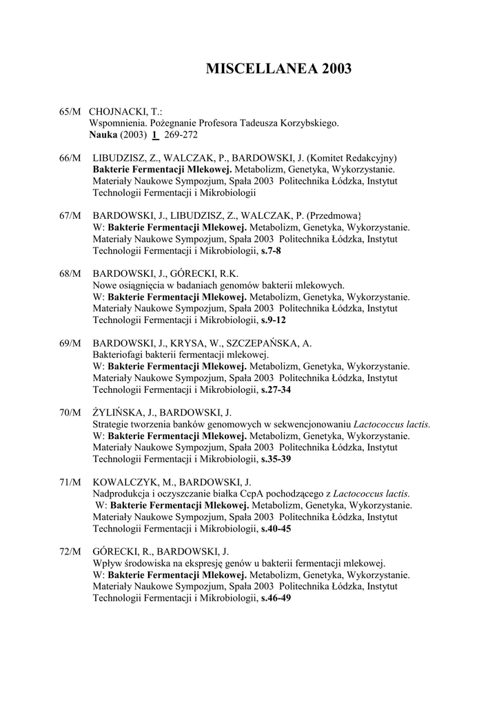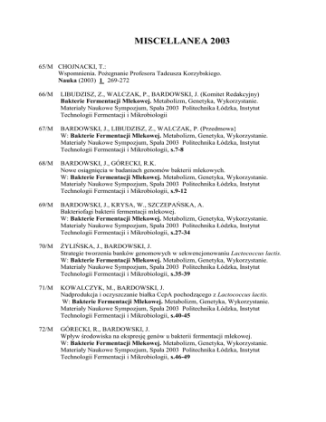 MISCELLANEA 2003 65/M CHOJNACKI, T.: Wspomnienia. PoŜegnanie Profesora Tadeusza Korzybskiego. Nauka (2003) 1 269-272 66/M LIBUDZISZ, Z., WALCZAK, P., BARDOWSKI, J. (Komitet Redakcyjny) Bakterie Fermentacji Mlekowej. Metabolizm, Genetyka, Wykorzystanie. Materiały Naukowe Sympozjum, Spała 2003 Politechnika Łódzka, Instytut Technologii Fermentacji i Mikrobiologii 67/M BARDOWSKI, J., LIBUDZISZ, Z., WALCZAK, P. (Przedmowa} W: Bakterie Fermentacji Mlekowej. Metabolizm, Genetyka, Wykorzystanie. Materiały Naukowe Sympozjum, Spała 2003 Politechnika Łódzka, Instytut Technologii Fermentacji i Mikrobiologii, s.7-8 68/M BARDOWSKI, J., GÓRECKI, R.K. Nowe osiągnięcia w badaniach genomów bakterii mlekowych. W: Bakterie Fermentacji Mlekowej. Metabolizm, Genetyka, Wykorzystanie. Materiały Naukowe Sympozjum, Spała 2003 Politechnika Łódzka, Instytut Technologii Fermentacji i Mikrobiologii, s.9-12 69/M BARDOWSKI, J., KRYSA, W., SZCZEPAŃSKA, A. Bakteriofagi bakterii fermentacji mlekowej. W: Bakterie Fermentacji Mlekowej. Metabolizm, Genetyka, Wykorzystanie. Materiały Naukowe Sympozjum, Spała 2003 Politechnika Łódzka, Instytut Technologii Fermentacji i Mikrobiologii, s.27-34 70/M śYLIŃSKA, J., BARDOWSKI, J. Strategie tworzenia banków genomowych w sekwencjonowaniu Lactococcus lactis. W: Bakterie Fermentacji Mlekowej. Metabolizm, Genetyka, Wykorzystanie. Materiały Naukowe Sympozjum, Spała 2003 Politechnika Łódzka, Instytut Technologii Fermentacji i Mikrobiologii, s.35-39 71/M KOWALCZYK, M., BARDOWSKI, J. Nadprodukcja i oczyszczanie białka CcpA pochodzącego z Lactococcus lactis. W: Bakterie Fermentacji Mlekowej. Metabolizm, Genetyka, Wykorzystanie. Materiały Naukowe Sympozjum, Spała 2003 Politechnika Łódzka, Instytut Technologii Fermentacji i Mikrobiologii, s.40-45 72/M GÓRECKI, R., BARDOWSKI, J. Wpływ środowiska na ekspresję genów u bakterii fermentacji mlekowej. W: Bakterie Fermentacji Mlekowej. Metabolizm, Genetyka, Wykorzystanie. Materiały Naukowe Sympozjum, Spała 2003 Politechnika Łódzka, Instytut Technologii Fermentacji i Mikrobiologii, s.46-49 73/M KORYSZEWSKA, A., BARDOWSKI, J. Identyfikacja szczepów bakterii fermentacji mlekowej z rodzaju Lactococcus. W: Bakterie Fermentacji Mlekowej. Metabolizm, Genetyka, Wykorzystanie. Materiały Naukowe Sympozjum, Spała 2003 Politechnika Łódzka, Instytut Technologii Fermentacji i Mikrobiologii, s.50-55 74/M DOMAŃ-PYTKA, M., BARDOWSKI, J. Charakterystyka funkcjonalna regionu promotorowego genu kodującego pullulanzę u Lactococcus lactis. W: Bakterie Fermentacji Mlekowej. Metabolizm, Genetyka, Wykorzystanie. Materiały Naukowe Sympozjum, Spała 2003 Politechnika Łódzka, Instytut Technologii Fermentacji i Mikrobiologii, s.56-61 75/M WAŚKO, A., TARGOŃSKI, Z., BARDOWSKI, J. Optymalizacja wytwarzania kwasu mlekowego przez amylolityczny szczep Lactococcus lactis IBB 500 na surowcach skrobiowych. W: Bakterie Fermentacji Mlekowej. Metabolizm, Genetyka, Wykorzystanie. Materiały Naukowe Sympozjum, Spała 2003 Politechnika Łódzka, Instytut Technologii Fermentacji i Mikrobiologii, s.178-182 76/M TUDEK, B., CIEŚLA, Z., JANION, C., BOITEUX, S., BEBENEK, K., SHINAGAWA, H., BARTSCH, H., LAVAL, J., van ZEELAND, A.A., MULLENDERS, L.F.H., SZYFTER, K., COLLINS, A., KRUSZEWSKI, M. Meeting Report. 32nd Annual Meeting of European Environmental Mutagen Society. DNA damage and repair fundamental aspects and contribution to human disorders. DNA Repair (2003) 2 765-781 77/M KACZANOWSKI, Sz., ZIELENKIEWICZ, P. A TIP on malaria (genomics). Nature Biotech. (2003) 21 733 78/M MAŁECKI, M., STĘPIEŃ, P.P. Mechanizmy degradacji mRNA. Post. Bioch. (2003) 49 58-67 79/M NOWOSIELSKA, A., GRZESIUK, E. Mutacje adaptacyjne. Post. Bioch. (2003) 49 68-76 80/M SOSIŃSKA, G. Dolichole, długołańcuchowe lipidy izoprenoidowe biorące udział w modyfikacjach białek. Post. Bioch. (2003) 49 107-115 81/M LUBOS, L., WAJGT, A., MACIEJOWSKI, M., MROCZEK-TOŃSKA, K., BARTNIK, E., DZIEKANOWSKA, D. Przypadek choroby Lebera – róŜnicowanie z pozapalnym zanikiem nerwu II za pomocą analizy mtDNA. Neurol. Neurochir. Pol. (2003) 37 229-234 82/M WOLNICKA-GŁUBISZ, A., ZARĘBSKA, Z. PUVA – fotofereza, fotochemioterapia pozaustrojowa. Przegl. Dermat. (2003) 5 383-391 83/M ZAIM, J., KIERZEK, A.M. Domain organization of activation-induced cytidine demainase. Nature Immun. (2003) 4 1153 84/M TUDEK, B. (Editorial) Oxidative DNA damage and its repair base excision repair. Mut. Res. (2003) 531 1-3 85/M PASZEWSKI, A. Osoba Zabłąkana w Debacie Bioetycznej. W: Fizyczne problemy wynikające z rozwoju nauki. Warszawa 2003,Polska Akademia Nauk, Centrum Upowszechniania Nauki, s.229-241