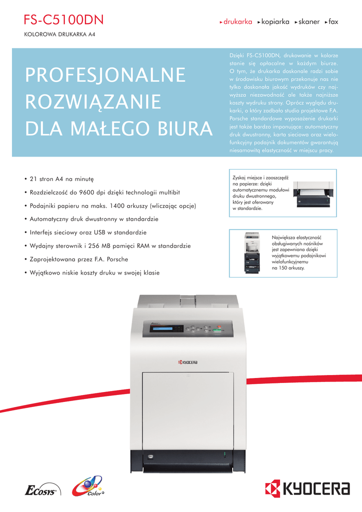 FS-C5100DN drukarka kopiarka skaner fax KOLOROWA DRUKARKA A4 PROFESJONALNE ROZWIĄZANIE DLA MAŁEGO BIURA • 21 stron A4 na minut´ • RozdzielczoÊç do 9600 dpi dzi´ki technologii multibit • Podajniki papieru na maks. 1400 arkuszy (wliczajàc opcje) Dzi´ki FS-C5100DN, drukowanie w kolorze stanie si´ opłacalne w ka˝dym biurze. O tym, ˝e drukarka doskonale radzi sobie w Êrodowisku biurowym przekonuje nas nie tylko doskonała jakoÊç wydruków czy najwy˝sza niezawodnoÊç ale tak˝e najni˝sze koszty wydruku strony. Oprócz wyglàdu drukarki, o który zadbało studio projektowe F.A. Porsche standardowe wyposa˝enie drukarki jest tak˝e bardzo imponujàce: automatyczny druk dwustronny, karta sieciowa oraz wielofunkcyjny podajnik dokumentów gwarantujà niesamowità elastycznoÊç w miejscu pracy. Zyskaj miejsce i zaoszcz´dê na papierze: dzi´ki automatycznemu modułowi druku dwustronnego, który jest oferowany w standardzie. • Automatyczny druk dwustronny w standardzie • Interfejs sieciowy oraz USB w standardzie • Wydajny sterownik i 256 MB pami´ci RAM w standardzie • Zaprojektowana przez F.A. Porsche • Wyjàtkowo niskie koszty druku w swojej klasie Najwi´ksza elastycznoÊç obsługiwanych noÊników jest zapewniana dzi´ki wyjàtkowemu podajnikowi wielofunkcyjnemu na 150 arkuszy. FS-C5100DN KOLOROWA DRUKARKA A4 KM-NetViewer: KM-NetViewer umo˝liwia całkowite monitorowanie i kontrol´ wszystkich drukarek Kyocera opartych na systemie ECOSYS oraz laserowych urzàdzeƒ wielofunkcyjnych Kyocera pracujàcych w systemie operacyjnym Windows, co z kolei umo˝liwia doskonałà administracj´ sieciowà. KM-NetViewer obsługuje tak˝e standardowy protokół SNMP. PRESCRIBE IIc Prescribe IIe jest zarówno j´zykiem sterujàcym, jak i j´zykiem opisu strony. To dzi´ki niemu mo˝liwe jest drukowanie kompleksowej grafiki, loga oraz formularzy pod ka˝dym systemem operacyjnym. Prescribe IIc umo˝liwia tak˝e, póêniejsze zapisywanie i aktualizowanie ju˝ z poziomu drukarki. NARZ¢DZIA MONITOROWANIA i ZARZÑDZANIA DRUKARKÑ: Ustawienia drukarki mogà byç sprawdzone w formie wizualnej i poprawione za pomocà komputera osobistego. Rozwiàzanie Status monitor zapewnia łatwà zmian´ ustawieƒ drukarki i sprawdzania jej statusu za pomocà złàcza USB. KM-NET Viewer to zaawansowany system operacyjny, słu˝àcy do zarzàdzania drukarkà u˝ywajàcy standardowego protokołu SNMP. INTERFEJS USB DLA PAMI¢CI PRZENOÂNEJ USB FLASH Pliki PDF mogà byç drukowane bezpoÊrednio z pami´ci przenoÊnych USB (poprzez dedykowany port USB). Pliki przeznaczone do drukowania wybierane sà z panelu operacyjnego drukarki. Do przeprowadzenia tej operacji komputer nie jest wymagany. System ECOSYS został stworzony dla zmniejszenia kosztów utrzymania i eksploatowania drukarek. Ta unikalna technologia pozwala zredukowaç wydatki potrzebne na u˝ytkowanie urzàdzeƒ. Kyocera zapewnia tak˝e innowacyjnà technologi´ oddzielnej wymiany b´bna i tonera. Teraz nie trzeba ju˝ wyrzucaç sprawnego b´bna połàczonego z pojemnikiem na toner. Wystarczy jedynie wymieniç pojemnik z tonerem. Dzi´ki temu oszcz´dza u˝ytkownik, jednoczeÊnie bardziej dbajàc o Êrodowisko. OGÓLNE KONTROLER Technologia: Laserowa, Kyocera Mita ECOSYS SzybkoÊç drukowania: 21 stron A4 na minut´ Czas wydruku pierwszej strony: 10,5 sekundy dla wydruków czarno-białych, 12 sekund lub mniej dla wydruków kolorowych RozdzielczoÊç: 600 x 600 dpi;Technologia Multi-Bit pozwala na drukowanie w rozdzielczoÊci 9600 x 600 dpi Obcià˝alnoÊç: 50,000 stron Poziom hałasu (ISO 7779): Drukowanie: 53 dB(A) Czuwanie: 36 dB(A) Tryb oszcz´dzania energii (power-saving): niemierzalnie niski Pobór mocy: Drukowanie: 405 W Czuwanie: 69 W UÊpienie (ECOpower): 7 W Zasilanie: AC 220 – 240V, 50/60Hz Wymiary: (szer. x gł´b. x d∏.) 345 x 518 x 455 mm Waga: 28 kg Certyfikaty: GS/TÜV/CE Drukarki produkowane zgodnie z normà jakoÊci ISO 9001 i normà ochrony Êrodowiska ISO 14001 Pami´ç: 256 MB, maksymalnie 1280 MB Procesor: PowerPC 440 / 553 MHz Emulacje: PCL6, PCL5c, PJL, KPDL3 (PostScript 3*) z automatycznym przełàczaniem emulacji (AES), Drukowanie bezpoÊrednie XPS, Drukowanie bezpoÊrednie PDF Sterownik: Wszystkie powszechne systemy operacyjne Windows, Mac OS X wersja 10.2 lub wy˝sza, UNIX, LINUX oraz inne ˝àdane systemy operacyjne J´zyk sterujàcy: Prescribe IIc Czcionki: 93 czcionek kraw´dziowych dost´pnych we wszystkich emulacjach, 8 czcionek dla systemu Windows Vista* czcionka bitmapowa, 45 typów czcionek kodów kreskowych jednowymiarowych, jeden typ czcionek kodów kreskowych dwuwymiarowych (PDF-417) Interfejs standardowy: USB 2.0 (pełna szybkoÊç), gniazdo USB przeznaczone dla pami´ci przenoÊnych flash USB, FastEthernet (10/100BaseTX) Gniazdo na opcjonalny serwer druku Gniazdo na opcjonalnà kart´ CompactFlash Zintegrowany system zliczania wydruków: 100 kodów departamentowych Podajnik papieru PF-510: maks. 500 arkuszy: 60-220 g/m2, A4, A5, B5, Letter, Legal, Custom (148 x 210 mm – 216 x 356 mm) Szafka CB-500: podstawa pod drukark´ z miejscem na materiały eksploatacyjny (papier, toner), wysokoÊç ok. 40 cm Opcjonalna pami´ç Pami´ç drukarki: MDDR2(128, 256, 512 lub 1024 MB) Karta CompactFlash®: 1 gniazdo (do 4 GB), formularze, czcionki, loga, makra Pami´ç USB flash: Umo˝liwia drukowanie plików PDF bez koniecznoÊci korzystania z komputera GWARANCJA Gwarancja 2 letnia w standardzie. Kyocera gwarantuje 3 letnià lub 100,000 stron trwałoÊç b´bna (zale˝nie od tego który z warunków wystàpi wczeÊniej) przy zało˝eniu, ˝e ka˝da z drukarek b´dzie stosowana i czyszczona zgodnie z instrukcjà Dla drukarek i urzàdzeƒ opcjonalnych dost´pne jest rozszerzenie gwarancji do 3 lat OBSŁUGA PAPIERU Toner TK-540K: Drobnoziarnisty, jednoskładnikowy toner na 5000 stron przy 5% pokryciu (ISO/IEC 19752) Toner TK-540C: Drobnoziarnisty, jednoskładnikowy toner na 4000 stron przy 5% pokryciu (ISO/IEC 19752) 