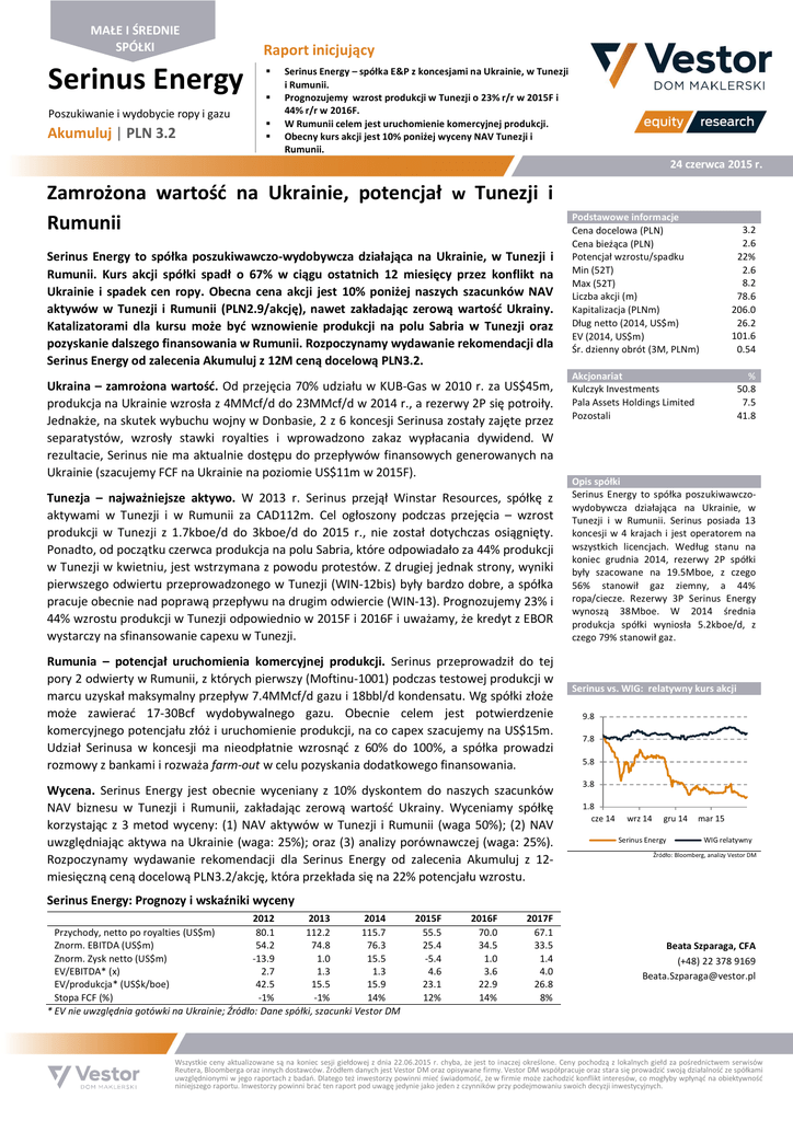 MAŁE I ŚREDNIE SPÓŁKI Serinus Energy Poszukiwanie i wydobycie ropy i gazu Akumuluj | PLN 3.2 Raport inicjujący Serinus Energy – spółka E&P z koncesjami na Ukrainie, w Tunezji i Rumunii. Prognozujemy wzrost produkcji w Tunezji o 23% r/r w 2015F i 44% r/r w 2016F. W Rumunii celem jest uruchomienie komercyjnej produkcji. Obecny kurs akcji jest 10% poniżej wyceny NAV Tunezji i Rumunii. 24 czerwca 2015 r. Zamrożona wartość na Ukrainie, potencjał w Tunezji i Rumunii Serinus Energy to spółka poszukiwawczo-wydobywcza działająca na Ukrainie, w Tunezji i Rumunii. Kurs akcji spółki spadł o 67% w ciągu ostatnich 12 miesięcy przez konflikt na Ukrainie i spadek cen ropy. Obecna cena akcji jest 10% poniżej naszych szacunków NAV aktywów w Tunezji i Rumunii (PLN2.9/akcję), nawet zakładając zerową wartość Ukrainy. Katalizatorami dla kursu może być wznowienie produkcji na polu Sabria w Tunezji oraz pozyskanie dalszego finansowania w Rumunii. Rozpoczynamy wydawanie rekomendacji dla Serinus Energy od zalecenia Akumuluj z 12M ceną docelową PLN3.2. Ukraina – zamrożona wartość. Od przejęcia 70% udziału w KUB-Gas w 2010 r. za US$45m, produkcja na Ukrainie wzrosła z 4MMcf/d do 23MMcf/d w 2014 r., a rezerwy 2P się potroiły. Jednakże, na skutek wybuchu wojny w Donbasie, 2 z 6 koncesji Serinusa zostały zajęte przez separatystów, wzrosły stawki royalties i wprowadzono zakaz wypłacania dywidend. W rezultacie, Serinus nie ma aktualnie dostępu do przepływów finansowych generowanych na Ukrainie (szacujemy FCF na Ukrainie na poziomie US$11m w 2015F). Tunezja – najważniejsze aktywo. W 2013 r. Serinus przejął Winstar Resources, spółkę z aktywami w Tunezji i w Rumunii za CAD112m. Cel ogłoszony podczas przejęcia – wzrost produkcji w Tunezji z 1.7kboe/d do 3kboe/d do 2015 r., nie został dotychczas osiągnięty. Ponadto, od początku czerwca produkcja na polu Sabria, które odpowiadało za 44% produkcji w Tunezji w kwietniu, jest wstrzymana z powodu protestów. Z drugiej jednak strony, wyniki pierwszego odwiertu przeprowadzonego w Tunezji (WIN-12bis) były bardzo dobre, a spółka pracuje obecnie nad poprawą przepływu na drugim odwiercie (WIN-13). Prognozujemy 23% i 44% wzrostu produkcji w Tunezji odpowiednio w 2015F i 2016F i uważamy, że kredyt z EBOR wystarczy na sfinansowanie capexu w Tunezji. Rumunia – potencjał uruchomienia komercyjnej produkcji. Serinus przeprowadził do tej pory 2 odwierty w Rumunii, z których pierwszy (Moftinu-1001) podczas testowej produkcji w marcu uzyskał maksymalny przepływ 7.4MMcf/d gazu i 18bbl/d kondensatu. Wg spółki złoże może zawierać 17-30Bcf wydobywalnego gazu. Obecnie celem jest potwierdzenie komercyjnego potencjału złóż i uruchomienie produkcji, na co capex szacujemy na US$15m. Udział Serinusa w koncesji ma nieodpłatnie wzrosnąć z 60% do 100%, a spółka prowadzi rozmowy z bankami i rozważa farm-out w celu pozyskania dodatkowego finansowania. Wycena. Serinus Energy jest obecnie wyceniany z 10% dyskontem do naszych szacunków NAV biznesu w Tunezji i Rumunii, zakładając zerową wartość Ukrainy. Wyceniamy spółkę korzystając z 3 metod wyceny: (1) NAV aktywów w Tunezji i Rumunii (waga 50%); (2) NAV uwzględniając aktywa na Ukrainie (waga: 25%); oraz (3) analizy porównawczej (waga: 25%). Rozpoczynamy wydawanie rekomendacji dla Serinus Energy od zalecenia Akumuluj z 12miesięczną ceną docelową PLN3.2/akcję, która przekłada się na 22% potencjału wzrostu. Podstawowe informacje Cena docelowa (PLN) Cena bieżąca (PLN) Potencjał wzrostu/spadku Min (52T) Max (52T) Liczba akcji (m) Kapitalizacja (PLNm) Dług netto (2014, US$m) EV (2014, US$m) Śr. dzienny obrót (3M, PLNm) 3.2 2.6 22% 2.6 8.2 78.6 206.0 26.2 101.6 0.54 Akcjonariat Kulczyk Investments Pala Assets Holdings Limited Pozostali % 50.8 7.5 41.8 Opis spółki Serinus Energy to spółka poszukiwawczowydobywcza działająca na Ukrainie, w Tunezji i w Rumunii. Serinus posiada 13 koncesji w 4 krajach i jest operatorem na wszystkich licencjach. Według stanu na koniec grudnia 2014, rezerwy 2P spółki były szacowane na 19.5Mboe, z czego 56% stanowił gaz ziemny, a 44% ropa/ciecze. Rezerwy 3P Serinus Energy wynoszą 38Mboe. W 2014 średnia produkcja spółki wyniosła 5.2kboe/d, z czego 79% stanowił gaz. Serinus vs. WIG: relatywny kurs akcji 9.8 7.8 5.8 3.8 1.8 cze 14 wrz 14 gru 14 Serinus Energy mar 15 WIG relatywny Źródło: Bloomberg, analizy Vestor DM Serinus Energy: Prognozy i wskaźniki wyceny 2012 2013 2014 Przychody, netto po royalties (US$m) 80.1 112.2 115.7 Znorm. EBITDA (US$m) 54.2 74.8 76.3 Znorm. Zysk netto (US$m) -13.9 1.0 15.5 EV/EBITDA* (x) 2.7 1.3 1.3 EV/produkcja* (US$k/boe) 42.5 15.5 15.9 Stopa FCF (%) -1% -1% 14% * EV nie uwzględnia gotówki na Ukrainie; Źródło: Dane spółki, szacunki Vestor DM 2015F 55.5 25.4 -5.4 4.6 23.1 12% 2016F 70.0 34.5 1.0 3.6 22.9 14% 2017F 67.1 33.5 1.4 4.0 26.8 8% Beata Szparaga, CFA (+48) 22 378 9169 [email protected] Wszystkie ceny aktualizowane są na koniec sesji giełdowej z dnia 22.06.2015 r. chyba, że jest to inaczej określone. Ceny pochodzą z lokalnych giełd za pośrednictwem serwisów Reutera, Bloomberga oraz innych dostawców. Źródłem danych jest Vestor DM oraz opisywane firmy. Vestor DM współpracuje oraz stara się prowadzić swoją działalność ze spółkami uwzględnionymi w jego raportach z badań. Dlatego też inwestorzy powinni mieć świadomość, że w firmie może zachodzić konflikt interesów, co mogłyby wpłynąć na obiektywność niniejszego raportu. Inwestorzy powinni brać ten raport pod uwagę jedynie jako jeden z czynników przy podejmowaniu swoich decyzji inwestycyjnych. Serinus Energy, Czerwiec 2015 ZASTRZEŻENIE ODPOWIEDZIALNOŚCI Niniejszy materiał został przygotowany przez Vestor Dom Maklerski S.A. (“Vestor”), z siedzibą w Warszawie, ul. Mokotowska 1, 00-640 Warszawa, wpisaną do rejestru przedsiębiorców przez Sąd Rejonowy dla m. 