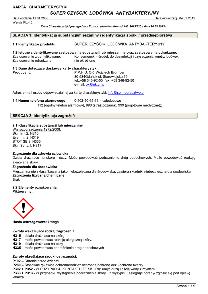 KARTA CHARAKTERYSTYKI SUPER CZYŚCIK LODÓWKA ANTYBAKTERYJNY Data wydania 11.04.2008 Wersja PL:4.0 Data aktualizacji: 04.09.2015 Karta Charakterystyki jest zgodna z Rozporządzeniem Komisji UE 2015/830 z dnia 28.05.2015 r. SEKCJA 1: Identyfikacja substancji/mieszaniny i identyfikacja spółki / przedsiębiorstwa 1.1 Identyfikator produktu: SUPER CZYŚCIK LODÓWKA ANTYBAKTERYJNY 1.2 Istotne zidentyfikowane zastosowania substancji lub mieszaniny oraz zastosowania odradzane: Zastosowanie zidentyfikowane: Konsumencki - środek do dezynfekcji i czyszczenia wnętrz lodówek. Zastosowanie odradzane: nie określono 1.3 Dane dotyczące dostawcy karty charakterystyki: Producent: P.P.H.U. OK Wojciech Bromber 80-534Gdańsk ul. Starowiejska 65 tel.:+58 346-92-50 fax: +58 346-92-50 e-mail: [email protected] Adres e-mail osoby odpowiedzialnej za kartę charakterystyki: [email protected] 1.4 Numer telefonu alarmowego: 0-502-50-65-69 - całodobowo 112 (ogólny telefon alarmowy), 998 (straż pożarna), 999 (pogotowie medyczne);; SEKCJA 2: Identyfikacja zagrożeń 2.1 Klasyfikacja substancji lub mieszaniny Wg rozporządzenia 1272/2008: Skin Irrit.2: H315 Eye Irrit. 2; H319 STOT SE 3; H335 Skin Sens.1; H317 Zagrożenie dla zdrowia człowieka Działa drażniąco na skórę i oczy. Może powodować podrażnienie dróg oddechowych. Może powodować reakcję alergiczną skóry. Zagrożenie dla środowiska Mieszanina nie sklasyfikowana jako niebezpieczna dla środowiska, zawiera składniki niebezpieczne dla środowiska. Zagrożenia fizyczne/chemiczne Brak 2.2 Elementy oznakowania: Piktogramy: Hasło ostrzegawcze: Uwaga Zwroty wskazujące rodzaj zagrożenia: H315 – działa drażniąco na skórę H317 – może powodować reakcję alergiczną skóry. H319 – działa drażniąco na oczy H335 – może powodować podrażnienie dróg oddechowych Zwroty określające środki ostrożności: P102 – Chronić przed dziećmi P280 – Stosować rękawice ochronne/odzież ochronną/ochronę oczu/ochronę twarzy. P302 + P352 - W PRZYPADKU KONTAKTU ZE SKÓRĄ: umyć dużą ilością wody z mydłem. P333 + P313 - W przypadku wystąpienia podrażnienia skóry lub wysypki: Zasięgnąć porady/ zgłosić się pod opiekę lekarza. Strona 1 z 9 KARTA CHARAKTERYSTYKI SUPER CZYŚCIK LODÓWKA ANTYBAKTERYJNY Data wydania 11.04.2008 Wersja PL:4.0 Data aktualizacji: 04.09.2015 Karta Charakterystyki jest zgodna z Rozporządzeniem Komisji UE 2015/830 z dnia 28.05.2015 r. Zawiera: Glutaraldehyd (CAS: 111-30-8), Zgodnie z Rozp. 648/2004 zawiera: <5% niejonowe związki powierzchniowo czynne, EDTA Na; 2.3 Inne zagrożenia: Brak dodatkowych zagrożeń Brak informacji na temat spełnienia kryteriów PBT lub vPvB zgodnie z załącznikiem XIII rozporządzenia REACH. Odpowiednie badania nie były przeprowadzone. SEKCJA 3: Skład/informacja o składnikach 3.1 Substancja: Nie dotyczy. 3.2 Mieszanina: Niebezpieczne składniki: Identyfikator produktu Zawartość % Klasa zagrożenia i kody kategorii Klasyfikacja CLP Kody zwrotów wskazujących rodzaj zagrożenia Alkohol etylowy CAS: 64-17-5 WE: 200-578-6 Nr indeksowy: 603-002-00-5 Nr REACH: substancja podlega przepisom okresu przejściowego <5 Flam. Liq. 2 H225 Chlorek didecylodimetyloamonium CAS: 7173-51-5 WE: 230-525-2 Nr indeksowy: 612-131-00-6 Nr REACH: substancja aktywna nie podlega obowiązkowi rejestracji <2 Acute Tox.4 Skin Corr.1B H302 H314 Glutaraldehyd 50% CAS: 111-30-8 WE: 203-856-6 Nr indeksowy: 605-022-00-X Nr REACH: substancja aktywna nie podlega obowiązkowi rejestracji <1 Acute Tox.3 Acute Tox.3 Skin Corr. 1B Resp. Sens.1 Skin Sens. 1 Aquatic Acute 1 H331 H301 H314 H334 H317 H400 Oksyetylowany alkohol tłuszczowy C 12-14 CAS: 68439-50-9 WE: polimer Nr indeksowy : Nr REACH: substancja podlega przepisom okresu przejściowego <1 Acute Tox.4 Eye Dam. 1 H302 H318 <0,2 Acute Tox.4 Eye Dam.1 H302 H318 Sól sodowa EDTA r-r 40% CAS: 64-02-8 WE: 200-573-9 Nr indeksowy: 607-428-00-2 Nr REACH: substancja podlega przepisom okresu przejściowego pełna treść zwrotów H w sekcji 16 SEKCJA 4: Środki pierwszej pomocy 4.1 Opis środków pierwszej pomocy Strona 2 z 9 KARTA CHARAKTERYSTYKI SUPER CZYŚCIK LODÓWKA ANTYBAKTERYJNY Data wydania 11.04.2008 Wersja PL:4.0 Data aktualizacji: 04.09.2015 Karta Charakterystyki jest zgodna z Rozporządzeniem Komisji UE 2015/830 z dnia 28.05.2015 r. Uwagi ogólne: W pierwszej kolejności należy wyprowadzić poszkodowaną osobę z zanieczyszczonego środowiska. W razie wystąpienia problemów zdrowotnych, skontaktować się z lekarzem lub centrum toksykologicznym i przekazać informacje zawarte w karcie charakterystyki. W przypadku kontaktu ze skórą: Zdjąć zanieczyszczoną odzież Umyć zabrudzoną skórę wodą z mydłem, spłukać dokładnie wodą. W przypadku wystąpienia podrażnienia skontaktować się z lekarzem. W przypadku kontaktu z oczami: Przepłukać oczy przez kilkanaście minut (ok. 15) dużą ilością wody, trzymając powieki szeroko rozwarte. Unikać silnego strumienia, ze względu na niebezpieczeństwo uszkodzenia rogówki. W przypadku wystąpienia nieprzemijających podrażnień skontaktować się z lekarzem. Narażenie inhalacyjne: W razie zawrotów głowy lub nudności wyprowadzić poszkodowanego na świeże powietrze. W razie braku szybkiej poprawy skontaktować się z lekarzem. W przypadku połknięcia: Nie wywoływać wymiotów, wypłukać usta i podać do wypicia dużą ilością wody, w przypadku wystąpienia niepokojących, nieprzemijających objawów skontaktować się z lekarzem. Nigdy nie podawać niczego doustnie osobie nieprzytomnej. 4.2 Najważniejsze ostre i opóźnione objawy oraz skutki narażenia: Układ oddechowy. Wdychaniu dużych bezpośrednich stężeń może powodować podrażnienia błon śluzowych nosa, gardła i dalszych odcinków układu oddechowego. Przewód pokarmowy. Spożycie produktu wywołuje podrażnienia jamy ustnej, gardła i dalszych odcinków przewodu pokarmowego. Kontakt z oczami. Powoduje podrażnien