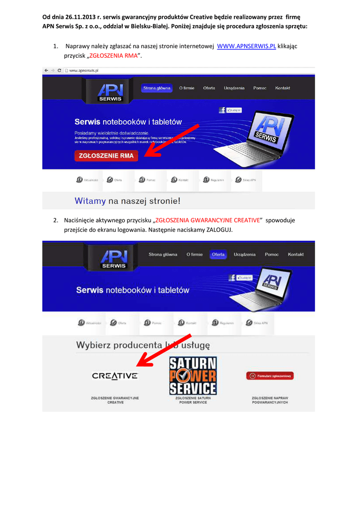 Od dnia 26.11.2013 r. serwis gwarancyjny produktów Creative będzie realizowany przez firmę APN Serwis Sp. z o.o., oddział w Bielsku-Białej. Poniżej znajduje się procedura zgłoszenia sprzętu: 1. Naprawy należy zgłaszać na naszej stronie internetowej WWW.APNSERWIS.PL klikając przycisk „ZGŁOSZENIA RMA”. 2. Naciśnięcie aktywnego przycisku „ZGŁOSZENIA GWARANCYJNE CREATIVE” spowoduje przejście do ekranu logowania. Następnie naciskamy ZALOGUJ. 3. Jeżeli: a. Wchodzimy po raz pierwszy należy się zarejestrować – klikając przycisk „ZAREJESTRUJ”. b. Mamy już utworzone wcześniej konto – klikamy „ZALOGUJ”. 4. REJESTRACJA a. Wypełniamy pola według podanych obok wytycznych (1), i. Jeżeli jesteśmy osobą prywatną, zaznaczamy pole „Osoba prywatna”. (1.1) b. Po zapoznaniu się z regulaminem zaznaczamy pole – klikając na nie (2), c. Przepisujemy kod podany na obrazku (3), d. Po sprawdzeniu poprawności wypełnionych pól – klikamy na „Załóż konto” (4). 1. 1.1 3. 4. 2. e. Po zakończonej rejestracji przechodzimy na swoją skrzynkę odbiorczą i klikamy w link potwierdzający rejestrację. Dziękujemy za rejestrację w naszym serwisie. Prosimy o sprawdzenie poniższych danych i w przypadku niezgodności, zgłoszenie konieczności ich poprawy Imię i nazwisko: Jan Kowalski Adres e-mail: [email protected] Adres: 00-003 ZAKOPANE Ulica: KRUPÓWKI 7/8 Telefon kontaktowy: 555 555 555 Twój login: JK1977 Twoje hasło dostępu: 123456 5. LOGOWANIE a. Aby się zalogować należy podać swój login oraz hasło do podanych pól (1), b. Następnie należy kliknąć „Zaloguj” (2). 1. 2. 6. DODAWANIE URZĄDZENIA a. Po zalogowaniu należy kliknąć - „Dodaj nowe urządzenie” w zakładce „Urządzenia” (1), 1. b. Wypełniamy pola według wskazówek obok (1), i. Jeżeli nie znamy „Kodu wyrobu” – wybieramy pozycję – „Nieznane” c. Klikamy „Zgłoś” (2). 1. 2. 7. ZGŁASZANIE NAPRAWY DODANEGO URZĄDZENIA: a. Po zgłoszeniu urządzenia zostajemy przeniesieni do „Listy urządzeń”. i. Jeżeli nie zostaniemy przeniesieni należy kliknąć „Urządzenia” z górnego menu (1). b. Aby zgłosić naprawę dodanego urządzenia należy kliknąć ikonę klucza - 1. 2. - (2). c. Po kliknięciu ikony klucza - zostaniemy przeniesieni do „Rejestracji zlecenia serwisowego” gdzie kolejno wypełniamy pola (1), ZE SZCZEGÓLNYM UWZGLĘDNIENIENM OPISU USTERKI, a następnie klikamy „ZGŁOŚ” (2) 1. 2. d. Jeśli wszystko zostało wypełnione poprawnie, naszym oczom ukaże się „Potwierdzenie rejestracji” w naszym systemie, Z NADANYM NUMEREM RMA (format CRE/0000/00/00). 8. NA MAILA PRZYCHODZI NASTĘPUJACE POTWIERDZENIE: Zlecenie naprawy zostało przyjęte pod numerem RMA: CRE/0001/11/13 Zgłaszający Login użytkownika: JK1977 Imię: Jan Nazwisko: Kowalski Urządzenie Nazwa: Creative Typ: EP-600 Kategoria: Słuchawki Numer seryjny: 12345678 Opis usterki nie działa lewa słuchawka Wkrótce otrzymasz kolejną wiadomość z szczegółami odbioru przesyłki przez kuriera SIÓDEMKA. Sprzęt należy wysłać zgodnie z wytycznymi na adres: APN SERWIS ul. Elizy Orzeszkowej 38 43-300 Bielsko Biała Zgłoszenie będzie zrealizowane tylko z przyznanym numerem RMA. Numer zgłoszenia RMA proszę umieścić w widocznym miejscu na przesyłce. Ewentualne pytania proszę kierować na [email protected] Pozdrawia zespół APN SERWIS Sp. z o.o. 9. W kolejnym mailu wyślemy szczegóły zlecenia odbioru paczki przez kuriera „SIODEMKA”. Urządzenie z zaznaczonym numerem RMA wysyłamy na adres: APN Serwis sp. z o.o. ul. Elizy Orzeszkowej 38 43-300 Bielsko Biała 10. Dane kontaktowe : [email protected]