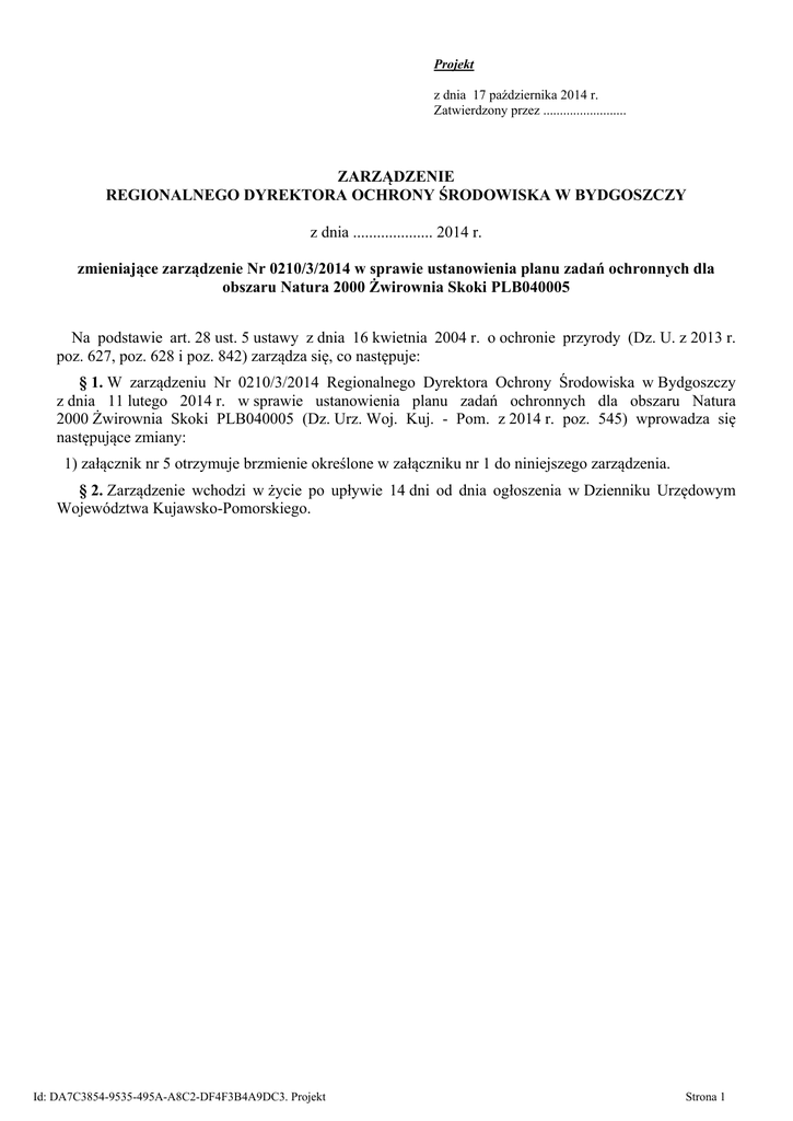 Projekt z dnia 17 października 2014 r. Zatwierdzony przez ......................... ZARZĄDZENIE REGIONALNEGO DYREKTORA OCHRONY ŚRODOWISKA W BYDGOSZCZY z dnia .................... 2014 r. zmieniające zarządzenie Nr 0210/3/2014 w sprawie ustanowienia planu zadań ochronnych dla obszaru Natura 2000 Żwirownia Skoki PLB040005 Na podstawie art. 28 ust. 5 ustawy z dnia 16 kwietnia 2004 r. o ochronie przyrody (Dz. U. z 2013 r. poz. 627, poz. 628 i poz. 842) zarządza się, co następuje: § 1. W zarządzeniu Nr 0210/3/2014 Regionalnego Dyrektora Ochrony Środowiska w Bydgoszczy z dnia 11 lutego 2014 r. w sprawie ustanowienia planu zadań ochronnych dla obszaru Natura 2000 Żwirownia Skoki PLB040005 (Dz. Urz. Woj. Kuj. - Pom. z 2014 r. poz. 545) wprowadza się następujące zmiany: 1) załącznik nr 5 otrzymuje brzmienie określone w załączniku nr 1 do niniejszego zarządzenia. § 2. Zarządzenie wchodzi w życie po upływie 14 dni od dnia ogłoszenia w Dzienniku Urzędowym Województwa Kujawsko-Pomorskiego. Id: DA7C3854-9535-495A-A8C2-DF4F3B4A9DC3. Projekt Strona 1 Załącznik Nr 1 do Zarządzenia Regionalnego Dyrektora Ochrony Środowiska w Bydgoszczy z dnia....................2014 r. Działania ochronne ze wskazaniem podmiotów odpowiedzialnych za ich wykonanie i obszarów ich wdrażania Przedmiot ochrony Działania ochronne Obszar wdrażania Podmiot odpowiedzialny za wykonanie Dotyczące ochrony czynnej gatunków ptaków oraz ich siedlisk oraz związane z utrzymaniem lub modyfikacją metod gospodarowania A176 mewa czarnogłowa Larus melanocephalus, A179 śmieszka Larus ridibundus, A182 mewa siwa Larus canus, A193 rybitwa rzeczna Sterna hirundo Utrzymanie otwartego charakteru 2 wysp i zabezpieczenie Działki ewidencyjne: 72/1, ich przed rozmywaniem brzegów poprzez umacnianie. 72/6 obręb 0002 Dąb Mały, Powstrzymanie sukcesji roślinności (głównie szuwaru 200 obręb 0003 Dąb Polski, trzcinowego oraz drzew i krzewów) na wyspach gmina Włocławek stanowiących miejsce lęgowe gatunku. Szuwar trzcinowy usuwać wraz z kłączami, zaś drzewa i krzewy ścinać przy gruncie. Usuwanie roślinności prowadzić ręcznie lub mechanicznie. Biomasę usunąć z powierzchni wyspy. Wyspy zabezpieczyć przed rozmywaniem brzegów poprzez umacnianie kamieniami, faszyną lub innymi materiałami na całej linii brzegowej wysp. W razie potrzeby odtworzyć/usypać piaszczysto - żwirową koronę wyspy. W uzasadnionych przypadkach można pozostawić roślinność w pasie brzegowym w celu utrzymania stabilności brzegów. Działania należy przeprowadzić po zakończeniu lęgów przez ptaki, tj. co najmniej po 15 sierpnia do końca lutego. Regionalny Dyrektor Ochrony Środowiska w Bydgoszczy A176 mewa czarnogłowa Larus melanocephalus, A179 śmieszka Larus ridibundus, A182 mewa siwa Larus canus, A193 rybitwa rzeczna Sterna hirundo Zwiększenie powierzchni dostępnych siedlisk lęgowych. Oddzielenie od lądu wyspy z półwyspu o powierzchni 0,20 ha poprzez wykopanie rowu oddzielającego szerokości powyżej 50 m. Nowo utworzoną wyspę zabezpieczyć przed rozmywaniem brzegów poprzez umacnianie kamieniami, faszyną lub innymi materiałami na całej linii brzegowej wyspy. W uzasadnionych przypadkach można pozostawić roślinność w pasie brzegowym w celu utrzymania stabilności brzegów. W razie potrzeby odtworzyć/usypać piaszczysto - żwirową koronę wyspy. Zadanie obejmie również usunięcie roślinności zielnej (głównie trzciny), nalotów krzewów i drzew. Szuwar trzcinowy usuwać wraz z kłączami, zaś drzewa i krzewy ścinać przy gruncie. Usuniętą biomasę należy wywieźć z wyspy. Działania należy przeprowadzić po zakończeniu lęgów przez ptaki tj. co najmniej po 15 sierpnia do końca lutego. Działka ewidencyjna: 41/2 obręb 0002 Dąb Mały, gmina Włocławek Regionalny Dyrektor Ochrony Środowiska w Bydgoszczy A176 mewa czarnogłowa Larus melanocephalus, A179 śmieszka Larus ridibundus, A182 mewa siwa Larus canus, A193 rybitwa rzeczna Sterna hirundo Zwiększenie powierzchni dostępnych siedlisk lęgowych. Odtworzenie otwartego charakteru 5 zarośniętych wysp poprzez usuwanie nalotu drzew i krzewów oraz usuwanie kłączy/korzeni roślinności zielnej (głównie trzciny). Wyspy zabezpieczyć przed rozmywaniem brzegów poprzez umacnianie kamieniami, faszyną lub innymi materiałami na całej linii brzegowej wysp. W uzasadnionych przypadkach można pozostawić roślinność w pasie brzegowym w celu utrzymania stabilności brzegów. W razie potrzeby odtworzyć/usypać piaszczysto - żwirową koronę wyspy. Działania należy przeprowadzić po zakończeniu lęgów Działki ewidencyjne: 379, 378/6, 377/1 obręb 0004 Dąb Wielki oraz 71/3 obręb 0003 Dąb Polski, gmina Włocławek Regionalny Dyrektor Ochrony Środowiska w Bydgoszczy Id: DA7C3854-9535-495A-A8C2-DF4F3B4A9DC3. Projekt Strona 2 przez ptaki tj. co najmniej po 15 sierpnia do końca lutego. A176 mewa czarnogłowa Larus melanocephalus, A179 śmieszka Larus ridibundus, A182 mewa siwa Larus canus, A193 rybitwa rzeczna Sterna hirundo Odłów drapieżnych gatunków obcych oraz gatunków rodzimych. Odłów norki amerykańskiej, szczura lub innych pojawiających się w obszarze gatunków obcych oraz gatunków rodzimych tj. lis. Odłowy należy wykonywać z użyciem klatek żywołownych. Zabiegi wykonywać od września do kwietnia z intensyfikacją odłowów w lutym i marcu. Odłów powinien być prowadzony przez min. 30 dni w jednej serii. Wykonać w 2015, 2016 i 2017 r. W kolejnych latach wykonywać wg. potrzeb, w sytuacji stwierdzenia drapieżników w obszarze. W granicach obszaru Natura 2000 Żwirownia Skoki bezpośrednio przy zbiornikach wodnych. Regionalny Dyrektor Ochrony Środowiska w Bydgoszczy A176 mewa czarnogłowa Larus melanocephalus, A179 śmieszka Larus ridibundus, A182 mewa siwa Larus canus, A193 rybitwa rzeczna Sterna hirundo Ochrona kolonii lęgowych przed presją turystyczną: 1. Ustawić/zacumować boje ostrzega