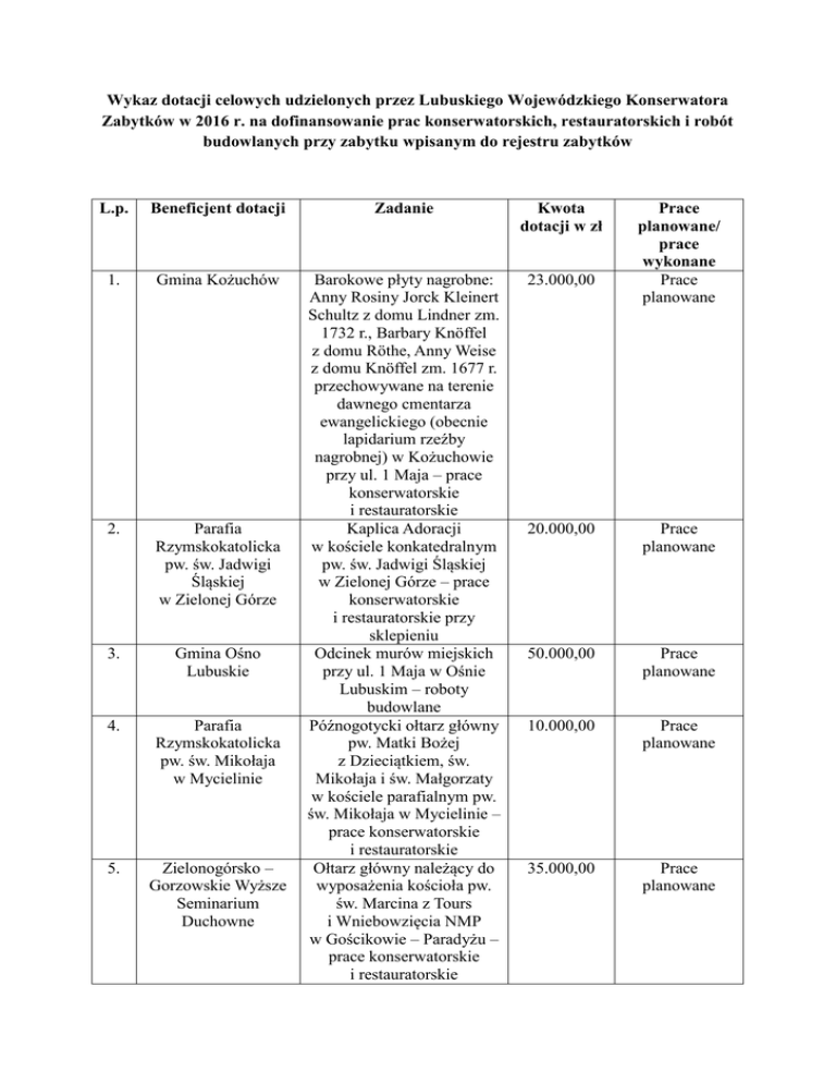 Wykaz dotacji celowych udzielonych przez Lubuskiego Wojewódzkiego Konserwatora Zabytków w 2016 r. na dofinansowanie prac konserwatorskich, restauratorskich i robót budowlanych przy zabytku wpisanym do rejestru zabytków L.p. Beneficjent dotacji Zadanie Kwota dotacji w zł 1. Gmina Kożuchów 23.000,00 2. Parafia Rzymskokatolicka pw. św. Jadwigi Śląskiej w Zielonej Górze 3. Gmina Ośno Lubuskie 4. Parafia Rzymskokatolicka pw. św. Mikołaja w Mycielinie 5. Zielonogórsko – Gorzowskie Wyższe Seminarium Duchowne Barokowe płyty nagrobne: Anny Rosiny Jorck Kleinert Schultz z domu Lindner zm. 1732 r., Barbary Knöffel z domu Röthe, Anny Weise z domu Knöffel zm. 1677 r. przechowywane na terenie dawnego cmentarza ewangelickiego (obecnie lapidarium rzeźby nagrobnej) w Kożuchowie przy ul. 1 Maja – prace konserwatorskie i restauratorskie Kaplica Adoracji w kościele konkatedralnym pw. św. Jadwigi Śląskiej w Zielonej Górze – prace konserwatorskie i restauratorskie przy sklepieniu Odcinek murów miejskich przy ul. 1 Maja w Ośnie Lubuskim – roboty budowlane Późnogotycki ołtarz główny pw. Matki Bożej z Dzieciątkiem, św. Mikołaja i św. Małgorzaty w kościele parafialnym pw. św. Mikołaja w Mycielinie – prace konserwatorskie i restauratorskie Ołtarz główny należący do wyposażenia kościoła pw. św. Marcina z Tours i Wniebowzięcia NMP w Gościkowie – Paradyżu – prace konserwatorskie i restauratorskie Prace planowane/ prace wykonane Prace planowane 20.000,00 Prace planowane 50.000,00 Prace planowane 10.000,00 Prace planowane 35.000,00 Prace planowane 6. Parafia Rzymskokatolicka pw. Trójcy Świętej w Gubinie 7. Parafia Rzymskokatolicka pw. Św. Apostołów Szymona i Judy Tadeusza w Kosieczynie 8. Parafia Rzymskokatolicka pw. św. Michała Archanioła w Świebodzinie 9. Parafia Rzymskokatolicka pw. Najświętszego Serca Pana Jezusa w Żarach 10. Parafia Rzymskokatolicka pw. św. Mikołaja w Jeleninie 11. Parafia Rzymskokatolicka pw. Matki Bożej Częstochowskiej w Słońsku 12. Parafia Rzymskokatolicka pw. św. Rodziny w Lubieszowie Kościół filialny pw. Świętej Rodziny w Sękowicach – prace konserwatorskie i restauratorskie przy balustradach empor Organy należące do wyposażenia kościoła parafialnego pw. Św. Apostołów Szymona i Judy Tadeusza w Kosieczynie – prace konserwatorskie i restauratorskie Gotycka grupa Ukrzyżowania złożona z krucyfiksu, figury Matki Bożej Bolesnej i figury św. Jana Ewangelisty oraz belka tęczowa kościoła pw. św. Michała Archanioła w Świebodzinie – prace konserwatorskie i restauratorskie Kościół parafialny pw. Najświętszego Serca Pana Jezusa w Żarach – prace konserwatorskie i restauratorskie przy reliktach wczesnogotyckich polichromii figuralnych Obraz św. Anny Samotrzeć w ołtarzu bocznym pw. św. Anny Samotrzeć w kościele parafialnym pw. św. Mikołaja w Jeleninie – prace konserwatorskie i restauratorskie Kościół parafialny pw. Matki Bożej Częstochowskiej w Słońsku – prace konserwatorskie i restauratorskie przy 6 aplikacjach skórzanych znajdujących się na filarach kościoła Barokowy ołtarz główny w kościele filialnym pw. św. Wawrzyńca w Studzieńcu – prace konserwatorskie 10.000,00 Prace planowane 8.000,00 Prace planowane 9.000,00 Prace planowane 17.000,00 Prace planowane 4.884,53 Prace planowane 5.000,00 Prace planowane 22.000,00 Prace planowane 13. Parafia Rzymskokatolicka pw. Matki Bożej Różańcowej w Długoszynie 14. Parafia Rzymskokatolicka pw. św. Marii Magdaleny w Brzeźnicy 15. Parafia Rzymskokatolicka pw. Świętych Apostołów Piotra i Pawła w Baczynie 16. Parafia Rzymskokatolicka pw. Wniebowstąpienia Pańskiego w Drągowinie Parafia Rzymskokatolicka pw. Podwyższenia Krzyża Świętego w Otyniu 17. 18. Parafia Rzymskokatolicka pw. św. Jana Chrzciciela w Lubrzy 19. Parafia Rzymskokatolicka pw. Wniebowzięcia NMP w Szprotawie i restauratorskie Obraz Ostatnia Wieczerza w predelli ołtarza głównego należącego do wyposażenia kościoła filialnego pw. św. Wojciecha w Drogominie – prace konserwatorskie i restauratorskie Obraz Św. Mikołaj z barokowego ołtarza głównego znajdującego się w kościele filialnym pw. św. Mikołaja Biskupa w Stanowie – prace konserwatorskie i restauratorskie Kościół filialny pw. Narodzenia NMP w Marwicach – prace konserwatorskie i restauratorskie przy ceglanych glifach okien elewacji południowej Kościół filialny pw. Wniebowzięcia NMP w Przybymierzu – malowanie dachu wieży Kościół parafialny pw. Podwyższenia Krzyża Świętego – Sanktuarium Matki Bożej Królowej Pokoju w Otyniu – prace konserwatorskie i restauratorskie przy wystroju malarskim wnętrza prezbiterium Barokowa chrzcielnica wraz z misą chrzcielną należące do wyposażenia kościoła filialnego pw. Matki Bożej Częstochowskiej w Lubrzy – prace konserwatorskie i restauratorskie Barokowy ołtarz boczny pw. św. Jadwigi w kościele parafialnym pw. Wniebowzięcia NMP 4.000,00 Prace planowane 10.000,00 Prace planowane 10.000,00 Prace planowane 3.000,00 Prace planowane 8.000,00 Prace planowane 4.500,00 Prace planowane 10.000,00 Prace planowane 20. 21. 22. 23. 24. 25. 26. 27. 28. w Szprotawie – prace konserwatorskie i restauratorskie A. Michoński Pałac w Bojadłach – remont konstrukcji i pokrycia dachu Parafia Kaplica Bożego Grobu przy Rzymskokatolicka ul. Podgórnej w Żaganiu – pw. Nawiedzenia konserwacja kamiennego NMP w Żaganiu nakrycia Parafia Epitafium poświęcone Rzymskokatolicka pamięci Charlotty pw. Zwiastowania Niesemenschel (1769 r.) NMP w Bożnowie eksponowane na elewacji kościoła filialnego pw. św. Augustyna w Chrobrowie – prace konserwatorskie i restauratorskie Parafia Posadzka Rzymskokatolicka w prezbiterium kościoła pw. filialnego pw. Matki Bożej Wniebowstąpienia Różańcowej w Niwiskach – Pańskiego prace konserwatorskie w Drągowinie i restauratorskie Parafia Kościół filialny pw. Rzymsko