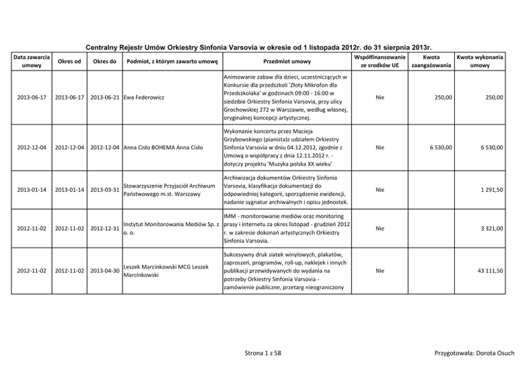Centralny Rejestr Umów Orkiestry Sinfonia Varsovia w okresie od 1