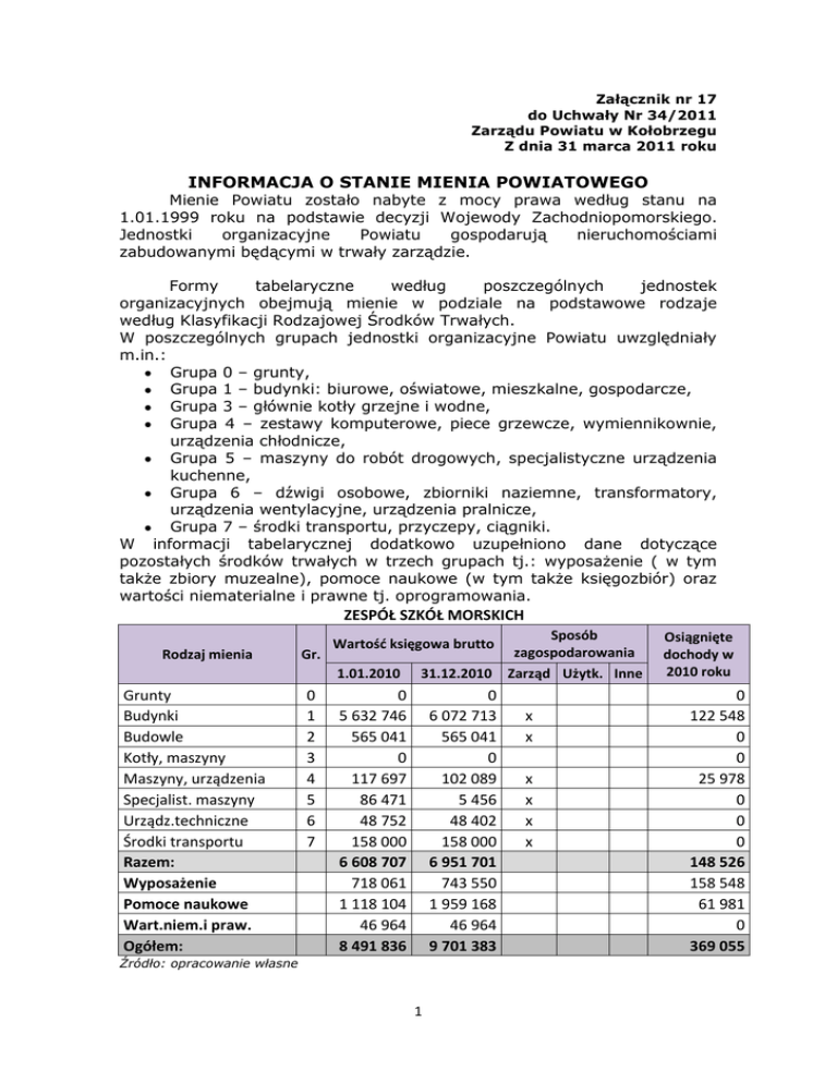 Załącznik nr 17 do Uchwały Nr 34/2011 Zarządu Powiatu w Kołobrzegu Z dnia 31 marca 2011 roku INFORMACJA O STANIE MIENIA POWIATOWEGO Mienie Powiatu zostało nabyte z mocy prawa według stanu na 1.01.1999 roku na podstawie decyzji Wojewody Zachodniopomorskiego. Jednostki organizacyjne Powiatu gospodarują nieruchomościami zabudowanymi będącymi w trwały zarządzie. Formy tabelaryczne według poszczególnych jednostek organizacyjnych obejmują mienie w podziale na podstawowe rodzaje według Klasyfikacji Rodzajowej Środków Trwałych. W poszczególnych grupach jednostki organizacyjne Powiatu uwzględniały m.in.: Grupa 0 – grunty, Grupa 1 – budynki: biurowe, oświatowe, mieszkalne, gospodarcze, Grupa 3 – głównie kotły grzejne i wodne, Grupa 4 – zestawy komputerowe, piece grzewcze, wymiennikownie, urządzenia chłodnicze, Grupa 5 – maszyny do robót drogowych, specjalistyczne urządzenia kuchenne, Grupa 6 – dźwigi osobowe, zbiorniki naziemne, transformatory, urządzenia wentylacyjne, urządzenia pralnicze, Grupa 7 – środki transportu, przyczepy, ciągniki. W informacji tabelarycznej dodatkowo uzupełniono dane dotyczące pozostałych środków trwałych w trzech grupach tj.: wyposażenie ( w tym także zbiory muzealne), pomoce naukowe (w tym także księgozbiór) oraz wartości niematerialne i prawne tj. oprogramowania. ZESPÓŁ SZKÓŁ MORSKICH Rodzaj mienia Gr. Wartość księgowa brutto 1.01.2010 Grunty Budynki Budowle Kotły, maszyny Maszyny, urządzenia Specjalist. maszyny Urządz.techniczne Środki transportu Razem: Wyposażenie Pomoce naukowe Wart.niem.i praw. Ogółem: 0 1 2 3 4 5 6 7 31.12.2010 0 5 632 746 565 041 0 117 697 86 471 48 752 158 000 6 608 707 718 061 1 118 104 46 964 8 491 836 0 6 072 713 565 041 0 102 089 5 456 48 402 158 000 6 951 701 743 550 1 959 168 46 964 9 701 383 Źródło: opracowanie własne 1 Sposób zagospodarowania Zarząd Użytk. Inne x x x x x x Osiągnięte dochody w 2010 roku 0 122 548 0 0 25 978 0 0 0 148 526 158 548 61 981 0 369 055 Zespół Szkół Morskich Wartość mienia na dzień 1.01.2010 wynosiła – 171 535 031,- zł, na dzień 31.12.2010 – 180 098 843,- zł. Zwiększenie (per saldo) w ciągu roku o 1 209 547,- zł. Zmiany wartości środków trwałych dotyczą: przystosowano pomieszczenia na parterze internatu pod Centrum Nawigacji – 410 508,- zł, obudowa grzejników na holach – 29 459,zł, zakup komputera i dwóch notebooków do administracji – 6 549,- zł, likwidacja zużytego sprzętu kuchennego – 22 157,- zł, zakup sprzętu kuchennego – 5 116,- zł, w wyniku termomodernizacji kuchni zlikwidowano stare obudowy – 86 131,- zł, zakup mebli do powstałego Centrum Nawigacji – 59 489,- zł, likwidacja starego sprzętu meblowego szkoły – 34 350.- zł, zakup wyposażenia Symulatora i pracowni ECDIS (sprzęt specjalistyczny) – 884 771,- zł, zlikwidowano zużyte pomoce naukowe – 43 707,- zł, m.in.: sprzęt komputerowy w pracowniach, sprzęt pływający (atrapa). ZESPÓŁ SZKÓŁ MECHANICZNYCH Wartość księgowa brutto Rodzaj mienia Gr. 1.01.2010 Grunty Budynki Budowle Kotły, maszyny Maszyny, urządzenia Specjalist. maszyny Urządz.techniczne Środki transportu Razem: Wyposażenie Pomoce naukowe Wart.niem.i praw. Ogółem: 0 1 2 3 4 5 6 7 31.12.2010 0 1 684 333 182 508 0 89 002 52 257 47 900 21 600 2 077 600 426 176 509 436 16 413 3 029 625 0 1 684 333 182 508 0 90 562 52 257 46 091 21 600 2 077 351 450 454 524 593 17 373 3 069 771 Sposób zagospodarowania Zarząd Użytk. Inne x x x x x x Osiągnięte dochody w 2010 roku 0 242 491 0 0 0 0 0 0 242 491 0 0 0 242 491 Źródło: opracowanie własne Zespół Szkół Mechanicznych Wartość mienia na dzień 1.01.2010 wynosiła – 3 029 625,- zł, na dzień 31.12.2010 – 3 069 771,- zł. Zwiększenie w ciągu roku (per saldo) o 40 146,- zł. Zmiany w stanie mienia: Zwiększenia: W ramach posiadanych środków w budżecie dokonano zakupów środków trwałych na łączna kwotę 45 918,- zł, w tym m.in.: pomoce 2 dydaktyczne. Książki do biblioteki, sprzęt sportowy, ławki do sal lekcyjnych. Meble do pomieszczeń szkolnych, regały do archiwum, kuchnie gazową, podgrzewacz do posiłków. Zdjęto ze stanu zużyte środki trwałe na łączna kwotę 5 772,- zł. Dokonano protokolarnego zużycia środków trwałych: odkurzacz, szafki ubraniowe, ławki. ZESPÓŁ SZKÓŁ GOSPODARKI ŻYWNOŚCIOWEJ Wartość księgowa brutto Rodzaj mienia Gr. 1.01.2010 Grunty Budynki Budowle Kotły, maszyny Maszyny, urządzenia Specjalist. maszyny Urządz.techniczne Środki transportu Razem: Wyposażenie Pomoce naukowe Wart.niem.i praw. Ogółem: 0 1 2 3 4 5 6 7 31.12.2010 0 3 178 044 183 347 0 237 783 18 556 48 225 110 557 3 776 512 629 432 45 324 9 164 4 460 432 0 3 178 044 183 347 0 237 783 18 556 48 225 110 557 3 776 512 679 170 45 932 11 898 4 513 512 Sposób zagospodarowania Zarząd Użytk. Inne x x x x x x Osiągnięte dochody w 2010 roku 0 250 000 0 0 0 0 0 0 250 000 0 0 0 250 000 Źródło: opracowanie własne Zespół Szkół Gospodarki Żywnościowej Wartość mienia na dzień 1.01.2010 wynosiła – 4 460 432,- zł, na dzień 31.12.2010 – 4 513 512,- zł. Zwiększenie w ciągu roku o 53 080,- zł. Zmiany wartości środków trwałych dotyczą: zakup wyposażenia do internatu – 46 768,- zł, 18 szaf, 50 szafek nocnych, 30 stołów, zakup gabloty i drukarki dla szkoły – 2 970,- zł, zakup książek i oprogramowania – 3 342,- zł. 3 ZESPÓŁ SZKÓŁ OGÓLNOKSZTAŁCACYCH IM. M. KOPERNIKA Wartość księgowa brutto Rodzaj mienia Gr. 1.01.2010 Grunty Budynki Budowle Kotły, maszyny Maszyny, urządzenia Specjalist. maszyny Urządz.techniczne Środki transportu Razem: Wyposażenie Pomoce naukowe Wart.niem.i praw. Ogółem: 0 1 2 3 4 5 6 7 31.12.2010 0 1 445 882 107 613 0 31 575 4 700 31 155 0 1 620 925 266 552 320 760 16 061 2 224 298 0 1 445 882 107 613 0 27 325 4 700 25 148 0 1 610 668 310 472 348 467 13 661 2 283 268 Sposób zagospodarowania Zarząd Użytk