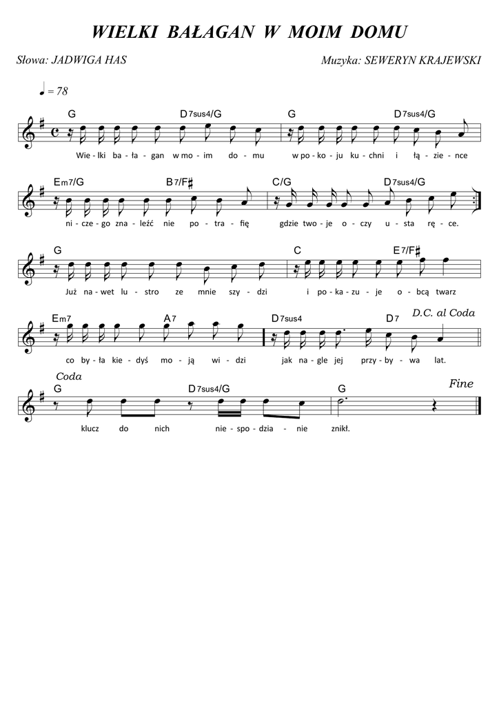 WIELKI BAŁAGAN W MOIM DOMU Słowa: JADWIGA HAS Muzyka: SEWERYN KRAJEWSKI q = 78 # & c ≈ œR œR œR œJ œJ œ J œ J G Wie -‐ lki ba -‐ ła -‐ gan w mo -‐ im # E≈ mœ7/G œ œ œ & R R R J # œ œ œ J J J # G≈ œ œ œ œ & R R R J œ J nie # E≈m 7œ œ œ œJ R R R & œ J A7 co by -‐ ła kie -‐ dyś Coda G # ‰ & œ J klucz œ J mnie œ J mo -‐ ją œ œ do nich ‰ łą -‐ zie -‐ nce D 7sus4/G r r r j j ≈ œ œ œ œ œ œj œ œ œJ .. J J gdzie two -‐ je œ J wi -‐ dzi o -‐ czy u -‐ sta rę -‐ ce. E 7/F # œ œ œ œ œ ≈ R R R J J œJ œJ œ C szy -‐ dzi œ J i C/G œ J œ J œ J ze œ J j œ D 7sus4/G w po -‐ ko -‐ ju ku -‐ chni po -‐ tra -‐ fię œ J Już na -‐ wet lu -‐ stro j ≈ œR œR œR œJ œJ œJ œJ œ œ J œ J G do -‐ mu B 7/F ni -‐ cze -‐ go zna -‐ leźć œ J D 7sus4/G i po -‐ ka -‐ zu -‐ je ≈ œR œR œR œJ . D 7sus4 jak na -‐ gle jej œ œ œ œ D 7sus4/G nie -‐ spo -‐ dzia -‐ nie ˙. G znikł. o -‐ bcą twarz œ œ R J D7 D.C. al Coda œ J przy -‐ by -‐ wa œ lat. Œ Fine