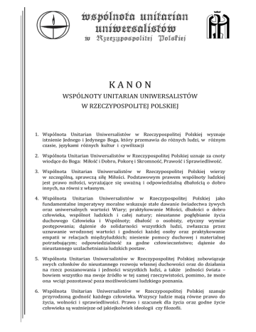 KANON WSPÓLNOTY UNITARIAN UNIWERSALISTÓW W RZECZYPOSPOLITEJ POLSKIEJ 1. Wspólnota Unitarian Uniwersalistów w Rzeczypospolitej Polskiej wyznaje istnienie Jednego i Jedynego Boga, który przemawia do różnych ludzi, w różnym czasie, językami różnych kultur i cywilizacji 2. Wspólnota Unitarian Uniwersalistów w Rzeczypospolitej Polskiej uznaje za cnoty wiodące do Boga: Miłość i Dobro, Pokorę i Skromność, Prawość i Sprawiedliwość. 3. Wspólnota Unitarian Uniwersalistów w Rzeczypospolitej Polskiej wierzy w szczególną, sprawczą siłę Miłości. Podstawowym prawem wspólnoty ludzkiej jest prawo miłości, wyrażające się uważną i odpowiedzialną dbałością o dobro innych, na równi z własnym. 4. Wspólnota Unitarian Uniwersalistów w Rzeczypospolitej Polskiej jako fundamentalne imperatywy moralne wskazuje stałe dawanie świadectwa żywych oraz uniwersalnych wartości Wiary; praktykowanie Miłości, dbałości o dobro człowieka, wspólnot ludzkich i całej natury; nieustanne pogłębianie życia duchowego Człowieka i Wspólnoty; dbałość o osobisty, etyczny wymiar postępowania; dążenie do solidarności wszystkich ludzi, zwłaszcza przez uznawanie wrodzonej wartości i godności każdej osoby oraz praktykowanie empatii w relacjach międzyludzkich; niesienie pomocy duchowej i materialnej potrzebującym; odpowiedzialność za godne człowieczeństwo; dążenie do nieustannego uszlachetniania ludzkich postaw. 5. Wspólnota Unitarian Uniwersalistów w Rzeczypospolitej Polskiej zobowiązuje swych członków do nieustannego rozwoju własnej duchowości oraz do działania na rzecz poszanowania i jedności wszystkich ludzi, a także jedności świata – bowiem wszystko ma swoje źródło w tej samej rzeczywistości, pomimo, że może ona wciąż pozostawać poza możliwościami ludzkiego poznania. 6. Wspólnota Unitarian Uniwersalistów w Rzeczypospolitej Polskiej szanuje przyrodzoną godność każdego człowieka. Wszyscy ludzie mają równe prawo do życia, wolności i sprawiedliwości. Prawo i szacunek dla życia oraz godne życie człowieka są ważniejsze od jakiejkolwiek ideologii czy filozofii. 7. Wspólnota Unitarian Uniwersalistów w Rzeczypospolitej Polskiej w pełni respektuje wolność wyznania i sumienia. Każdy człowiek ma prawo do wyrażania otwarcie swoich poglądów religijnych według swego sumienia, oraz swobodnego wypowiadania się w kwestiach wiary – bez obaw przed potępieniem, dyskryminacją czy prześladowaniem. 8. Wspólnota Unitarian Uniwersalistów w Rzeczypospolitej Polskiej wskazuje, że naturalnym rezultatem oraz świadectwem dobrej wiary są dobre uczynki, w tym zwłaszcza stałe zaangażowanie w pokorną pracę i użyteczną służbę dla innych. 9. Wspólnota Unitarian Uniwersalistów w Rzeczypospolitej Polskiej szanuje równouprawnienie religii i wyznań. Niezależnie od czasu ich powstania oraz kultur do których należą – posiadają wartości nie tylko dla swoich wyznawców, ale również dla wszystkich chcących je zrozumieć. 10. Wspólnota Unitarian Uniwersalistów w Rzeczypospolitej Polskiej wskazuje znaczenie wspólnoty wyznaniowej. Pozwala ona swoim członkom na dzielenie się doświadczeniami oraz wzajemne wsparcie i pomoc w dążeniu do sprawiedliwości i jedności. 11. Wspólnota Unitarian Uniwersalistów w Rzeczypospolitej Polskiej uznaje za fundamentalną Prawdę jedność świata. Uważamy, że nie ma zasadniczego konfliktu między wiarą i nauką, sacrum i profanum - ponieważ wszystko ma swoje źródło w tej samej rzeczywistości Wszechświata. 12. Wspólnota Unitarian Uniwersalistów w Rzeczypospolitej Polskiej wspiera nieustanne poszukiwanie i dociekanie Prawdy. Jeżeli rozum i serce człowieka są w pełni wolne i otwarte, każdy z nas może dokonać cennych oraz wspaniałych odkryć na miarę ludzkiego serca i sumienia. http://unitarianie-uniwersalisci.pl/