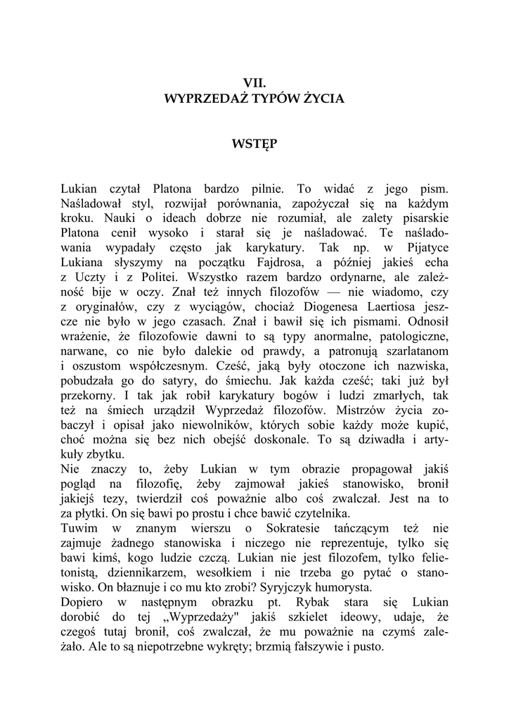 VII. WYPRZEDAŻ TYPÓW ŻYCIA WSTĘP Lukian czytał Platona