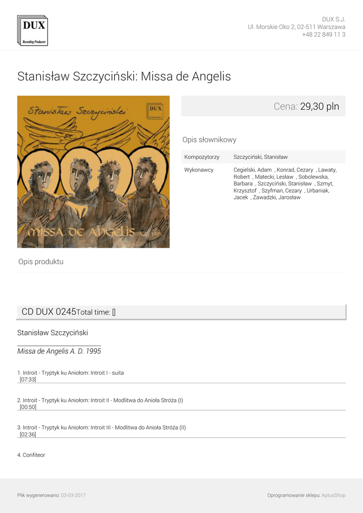 DUX S.J. Ul. Morskie Oko 2, 02-511 Warszawa +48 22 849 11 3 Stanisław Szczyciński: Missa de Angelis Cena: 29,30 pln Opis słownikowy Kompozytorzy Szczyciński, Stanisław ∎ Wykonawcy Cegielski, Adam ∎, Konrad, Cezary ∎, Lawaty, Robert ∎, Matecki, Lesław ∎, Sobolewska, Barbara ∎, Szczyciński, Stanisław ∎, Szmyt, Krzysztof ∎, Szyfman, Cezary ∎, Urbaniak, Jacek ∎, Zawadzki, Jarosław ∎ Opis produktu CD DUX 0245Total time: [] Stanisław Szczyciński Missa de Angelis A. D. 1995 1. Introit - Tryptyk ku Aniołom: Introit I - suita [07:33] 2. Introit - Tryptyk ku Aniołom: Introit II - Modlitwa do Anioła Stróża (I) [00:50] 3. Introit - Tryptyk ku Aniołom: Introit III - Modlitwa do Anioła Stróża (II) [02:36] 4. Confiteor Plik wygenerowano: 03-03-2017 Oprogramowanie sklepu: AptusShop DUX S.J. Ul. Morskie Oko 2, 02-511 Warszawa +48 22 849 11 3 [01:17] 5. Kyrie [01:33] 6. Gloria [02:33] 7. Psalm 91 [04:24] 8. Alleluja [03:40] 9. Credo [09:31] 10. Oratio fidelium [02:38] 11. Sanctus [01:16] 12. Pater noster [01:28] 13. Agnus Dei [01:52] 14. Communio [01:41] 15. Ite missa est (Piosenka do Anioła Stróża) [04:48] Wykonawcy: Adam Cegielski /kontrabas/ Barbara Sobolewska /wokalista/ Cezary Konrad /perkusja/ Cezary Szyfman /baryton/ Jacek Urbaniak /obój/ Jarosław Zawadzki /syntezatory/ Krzysztof Szmyt /tenor/ Lesław Matecki /gitara/ Robert Lawaty /kontratenor/ Stanisław Szczyciński /fortepian/ Stanisław Szczyciński /syntezatory/ Plik wygenerowano: 03-03-2017 Oprogramowanie sklepu: AptusShop DUX S.J. Ul. Morskie Oko 2, 02-511 Warszawa +48 22 849 11 3 Plik wygenerowano: 03-03-2017 Powered by TCPDF (www.tcpdf.org) Oprogramowanie sklepu: AptusShop