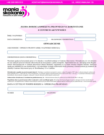 ZGODA RODZICA/OPIEKUNA PRAWNEGO NA KORZYSTANIE Z CENTRUM AKTYWNOŚCI IMIĘ I NAZWISKO DATA URODZENIA NR DOWODU OSOBISTEGO OŚWIADCZENIE JAKO RODZIC / OPIEKUN PRAWNY (IMIĘ I NAZWISKO DZIECKA) URODZONEGO (DATA URODZENIA) Wyrażam zgodę na korzystanie przez w/w dziecko z wszelkich atrakcji w Centrum Aktywności. Oświadczam, iż: w/w dziecko nie ma żadnych przeciwwskazań zdrowotnych do korzystania z parku trampolin. Zapoznałem/am się i akceptuję treść Regulaminów obowiązujących w centrum aktywności Mania Skakania, regulaminy te są znane również mojemu dziecku. Niniejsza zgoda jest składana na czas nieokreślony, a jej odwołanie wymaga zachowania formy pisemnej z dostarczeniem jej osobiście do siedziby Centrum Aktywności przy ul. Krochmalnej 13i w Lublinie. Oświadczenie o zgodzie na przetwarzanie danych : Działają c na podstawie przepisów ustawy z dnia 29 sierpnia 1997 roku o ochronie danych osobowych (tekst jednolity Dz. U. 2016 rok poz. 922) oświadczam, iż wyrażam zgodę na przetwarzanie przez KSJ ZiAN Stec i s-ka sp.j. w systemach informatycznych, kartotekach, skorowidzach, księ gach, wykazach i innych zbiorach moich danych osobowych. Jednocześnie oświadczam, iż zostałam/em poinformowany, że: Administratorem danych osobowych jest KSJ ZiAN Stec i s-ka sp.j. Wypełnione dane są przetwarzane tylko i wyłą cznie w celu weryfikacji zgody. W każdej chwili przysługuje mi prawo dostę pu do treści moich danych osobowych i ich poprawienia. Podanie moich danych osobowych jest dobrowolne.Brak podania danych osobowych jest jednoznaczny z niewyrażeniem zgody. DATA I CZYTELNY PODPIS RODZICA / OPIEKUNA PRAWNEGO NUMER TELEFONU