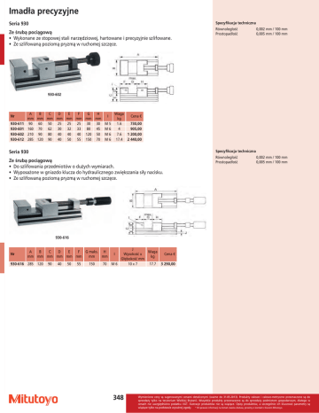Imadła precyzyjne Specyfikacja techniczna Seria 930 Ze śrubą pociągową • Wykonane ze stopowej stali narzędziowej, hartowane i precyzyjnie szlifowane. • Ze szlifowaną poziomą pryzmą w ruchomej szczęce. Równoległość Prostopadłość 0,002 mm / 100 mm 0,005 mm / 100 mm 930-602 Nr 930-611 930-601 930-602 930-612 A B C D E F G H Waga I Cena € mm mm mm mm mm mm mm mm kg 90 60 50 25 25 25 30 30 M 5 1.6 730,00 160 70 62 30 32 33 80 45 M 6 4 905,00 210 90 80 40 40 40 120 50 M 6 7.6 1 200,00 285 120 90 40 50 55 150 70 M 6 17.4 2 440,00 Specyfikacja techniczna Seria 930 Ze śrubą pociągową • Do szlifowania przedmiotów o dużych wymiarach. • Wyposażone w gniazdo klucza do hydraulicznego zwiększania siły nacisku. • Ze szlifowaną poziomą pryzmą w ruchomej szczęce. Równoległość Prostopadłość 0,002 mm / 100 mm 0,005 mm / 100 mm 930-616 Nr A B C D E F G maks. H mm mm mm mm mm mm mm mm 930-616 285 120 90 40 50 55 150 70 J Waga Wysokość x Cena € kg Głębokość mm M6 10 x 7 17.7 3 290,00 I 348 Wymienione ceny są sugerowanymi cenami detalicznymi (ważne do 31.05.2013). Produkty calowe i calowo-metryczne przeznaczone są do sprzedaży tylko na terytorium Wielkiej Brytanii. Wszystkie produkty przeznaczone są do sprzedaży podmiotom gospodarczym, dlatego w cenach nie uwzględniono podatku VAT. Ilustracje produktów nie są wiążące. Opisy produktów, a szczególnie ich kluczowe parametry są wiążące tylko na podstawie wyraźnej zgody. * W sprawie informacji na temat czasów dostaw, prosimy o kontakt z biurem Mitutoyo. Imadła precyzyjne Specyfikacja techniczna Równoległość Prostopadłość Seria 930 0,002 mm / 100 mm 0,005 mm / 100 mm Z systemem dociągania • Wysokiej precyzji imadło do precyzyjnego szlifowania, frezowania, pomiarów i obróbki elektroerozyjnej. 930-632 930-607 Z szybkim ustawianiem oraz szlifowaną pionową i poziomą pryzmą w ruchomej szczęce J A B C D E F G maks. H Waga Nr I Wysokość x Cena € mm mm mm mm mm mm mm mm kg Głębokość mm 930-606 160 70 62 30 32 33 80 45 M 6 8x7 3 810,00 930-607 210 90 80 40 40 40 120 50 M 6 10 x 7 5.8 1 200,00 Z poziomą szlifowaną pryzmą w ruchomej szczęce Nr A B C D E F G maks. H mm mm mm mm mm mm mm mm 930-630 70 30 930-631 110 45 930-632 285 120 930-633* 370 175 Specyfikacja techniczna Równoległość Prostopadłość 35 45 90 95 15 20 40 45 20 25 50 50 20 25 60 60 25 50 150 200 25 35 70 110 I M4 M5 M6 M8 J Waga Wysokość x Cena € kg Głębokość mm 0,35 535,00 8x6 1 790,00 12 x 7 13,5 2 290,00 12 x 10 28,8 4 330,00 Seria 930 0,002 mm / 100 mm 0,005 mm / 100 mm Precyzyjne imadło sinusowe o przedniej osi przechyłu • Wykonane ze stopowej stali narzędziowej, hartowane i precyzyjnie szlifowane. • Sworzeń łożyskowy i oporowy hartowane i szlifowane. • System mocowania może być blokowany w dowolnym położeniu kątowym. • Precyzyjne ustawianie kąta za pomocą płytek wzorcowych, maks. 46°. 930-621 Nr A B C D E F G maks. H mm mm mm mm mm mm mm mm 930-620* 210 930-621* 210 930-622 210 90 90 90 80 80 80 40 40 40 40 40 40 Wymienione ceny są sugerowanymi cenami detalicznymi (ważne do 31.05.2013). Produkty calowe i calowo-metryczne przeznaczone są do sprzedaży tylko na terytorium Wielkiej Brytanii. Wszystkie produkty przeznaczone są do sprzedaży podmiotom gospodarczym, dlatego w cenach nie uwzględniono podatku VAT. Ilustracje produktów nie są wiążące. Opisy produktów, a szczególnie ich kluczowe parametry są wiążące tylko na podstawie wyraźnej zgody. * W sprawie informacji na temat czasów dostaw, prosimy o kontakt z biurem Mitutoyo. 40 40 40 40 80 120 349 50 50 50 J Waga Wysokość x Cena € kg Głębokość mm M6 50 2.7 1 795,00 M6 100 5.3 2 510,00 M6 150 11 3 865,00 I Precyzyjne imadła sinusowe Specyfikacja techniczna Seria 930 Precyzyjne imadło sinusowe o tylnej osi przechyłu • Wykonane ze stali narzędziowej, hartowane i precyzyjnie szlifowane. • Sworzeń łożyskowy i sworzeń oporowy hartowane i szlifowane. • System mocowania może być blokowany w dowolnym położeniu kątowym w zakresie regulacji. • Precyzyjne ustawianie kąta za pomocą płytek wzorcowych, maks. 46°. Błąd dokładności ustawienia przy 45° Równoległość Prostopadłość ±15" 0,002 mm / 100 mm 0,005 mm / 100 mm 930-623 A B C D E F G maks. H J Waga I Cena € mm mm mm mm mm mm mm mm mm kg 930-623 130 70 93 30 63 33 50 40 M 5 100 4.5 2 580,00 Nr Specyfikacja techniczna Seria 930 Precyzyjne imadło sinusowe o wzdłużnej osi przechyłu • Wykonane ze stali narzędziowej, hartowane i precyzyjnie szlifowane. • Sworzeń łożyskowy i oporowy hartowane i szlifowane. • System blokowania umożliwia ustawienie imadła w dowolnym położeniu kątowym w zakresie regulacji. • Precyzyjne ustawianie kąta za pomocą płytek wzorcowych, maks. 46°. Błąd dokładności ustawienia przy 45° Równoległość Prostopadłość ±15" 0,002 mm / 100 mm 0,005 mm / 100 mm 930-624 A B C D E F G maks. H Waga I Cena € mm mm mm mm mm mm mm mm kg 930-624 160 75 93 30 63 33 80 45 M 5 5.9 2 580,00 Nr 350 Wymienione ceny są sugerowanymi cenami detalicznymi (ważne do 31.05.2013). Produkty calowe i calowo-metryczne przeznaczone są do sprzedaży tylko na terytorium Wielkiej Brytanii. Wszystkie produkty przeznaczone są do sprzedaży podmiotom gospodarczym, dlatego w cenach nie uwzględniono podatku VAT. Ilustracje produktów nie są wiążące. Opisy produktów, a szczególnie ich kluczowe parametry są wiążące tylko na podstawie wyraźnej zgody. * W sprawie informacji na temat czasów dostaw, prosimy o kontakt z biurem Mitutoyo. Precyzyjne imadła sinusowe Specyfikacja techniczna Błąd dokładności ustawienia przy 45° Równoległość Prostopadłość Seria 930 ±15" 0,002 mm / 100 mm 0,005 mm / 100 mm Precyzyjne imadło sinusowe o przedniej i wzdłużnej osi przechyłu • Wykonane ze stali narzędziowej, hartowane i precyzyjnie szlifowane. • Sworzeń łożyskowy i oporowy ha