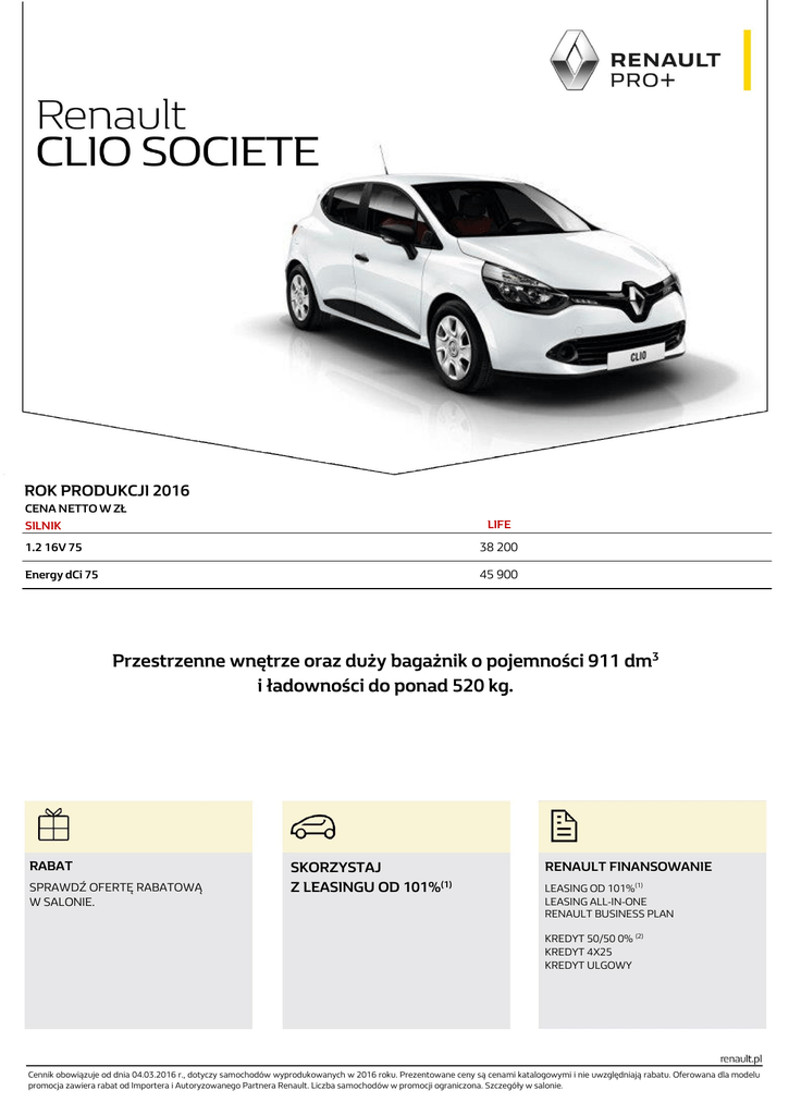 ROK PRODUKCJI 2016 CENA NETTO W ZŁ SILNIK LIFE 1.2 16V 75 38 200 Energy dCi 75 45 900 Przestrzenne wnętrze oraz duży bagażnik o pojemności 911 dm3 i ładowności do ponad 520 kg. RABAT SPRAWDŹ OFERTĘ RABATOWĄ W SALONIE. SKORZYSTAJ Z LEASINGU OD 101%(1) RENAULT FINANSOWANIE LEASING OD 101%(1) LEASING ALL-IN-ONE RENAULT BUSINESS PLAN KREDYT 50/50 0% (2) KREDYT 4X25 KREDYT ULGOWY Cennik obowiązuje od dnia 04.03.2016 r., dotyczy samochodów wyprodukowanych w 2016 roku. Prezentowane ceny są cenami katalogowymi i nie uwzględniają rabatu. Oferowana dla modelu promocja zawiera rabat od Importera i Autoryzowanego Partnera Renault. Liczba samochodów w promocji ograniczona. Szczegóły w salonie. LIFE BEZPIECZEŃSTWO CZYNNE I BIERNE ABS z systemem wspomagania nagłego hamowania Przednie poduszki powietrzne kierowcy i pasażera Dezaktywacja poduszki powietrznej pasażera z przodu Boczne poduszki powietrzne Regulator - ogranicznik prędkości System wspomagania ruszania pod górę (Hill Start Assist) System dynamicznej kontroli toru jazdy (ESC) z funkcją zapobiegania poślizgowi kół pędnych przy ruszaniu (ASR) ● ● ● ● ● ● Sygnał niezapiętych pasów bezpieczeństwa Przednie pasy bezpieczeństwa z regulacją wysokości, ogranicznikiem napięcia i napinaczem ● ● ● WYGLĄD ZEWNĘTRZNY Zderzak przedni i tylny w kolorze nadwozia ● Górna listwa ozdobna chłodnicy w kolorze lśniącej czerni z chromowanym logo Renault ● Boczne listwy ochronne i listwa zderzaka tylnego w kolorze czarnym o ziarnistej fakturze ● Obudowa lusterek bocznych w kolorze czarnym Przednie zewnętrzne klamki drzwi w kolorze czarnym Tylne zewnętrzne klamki drzwi ukryte przy tylnym słupku Tylny spojler dachowy Stalowe obręcze kół 15", wzór Extreme Lakier metalizowany / metalizowany specjalny Lakier niemetalizowany / niemetalizowany specjalny ● ● ● ● ● 1545/1707 0/528 WYGLĄD WNĘTRZA Tonacja grafitowa wnętrza Tapicerka czarno-czerwona Fortunate Wewnętrzne klamki drzwi chromowane ● ● ● WIDOCZNOŚĆ I OŚWIETLENIE Światła przeciwmgłowe Światła do jazdy dziennej z diodami LED Lusterka boczne regulowane elektrycznie, podgrzewane, z czujnikiem temperatury zewnętrznej P Wycieraczki przednie o zmiennej częstotliwości pracy Automatyczne włączanie tylnej wycieraczki podczas cofania P ● ● ● LIFE PROWADZENIE POJAZDU i URZĄDZENIA KONTROLNE Karta Renault sterująca zdalnie centralnym zamkiem i służąca do uruchamiania auta (zamiast kluczyka) ● Elektryczne, zmienne wpomaganie układu kierowniczego System kontroli ciśnienia w oponach Kierownica z regulacją wysokości i głębokości Komputer pokładowy Zespół wskaźników analogowo-cyfrowych Wskaźnik zmiany biegów Autostradowy tryb pracy kierunkowskazów Zestaw do naprawy uszkodzenia opony Koło zapasowe ● ● ● ● ● ● ● ● 252 KOMFORT Klimatyzacja manualna Szyby przednie regulowane elektrycznie Osłona przeciwsłoneczna z zamykanym lusterkiem po stronie kierowcy Osłona przeciwsłoneczna po stronie pasażera bez lusterka Fotel kierowcy z regulacją wysokości Zagłówki przednie z regulacją wysokości Przegroda oddzielająca część pasażerską od ładunkowej 1626/P ● ● ● ● ● ● MULTIMEDIA Instalacja do montażu radioodtwarzacza ● System Renault BASS REFLEX ● Radioodtwarzacz 2x20W, zintegrowany wyświetlacz, Bluetooth®, gniazdo USB i jack System multimedialny Media Nav Evolution: z ekranem dotykowym 7", nawigacją, radioodtwarzaczem 4x20W, Bluetooth® , gniazdem USB i jack P P PAKIETY Pakiet Klimat: klimatyzacja manualna, radioodtwarzacz z Bluetooth®, złącze USB i Jack oraz Bass Reflex 2358 Pakiet Komfort: klimatyzacja manualna, system multimedialny MediaNav Evolution* z ekranem dotykowym 7", nawigacją, radioodtwarzaczem z Bluetooth®, złączem USB i Jack oraz Bass Reflex 4065 Pakiet PLUS: światła przeciwmgłowe, wycieraczki o zmiennej częstotliwości pracy 407 ● = seryjnie P = element pakietu - = niedostępne Niektóre opcje wymagają zamówienia dodatkowego wyposażenia opcjonalnego lub wykluczają się wzajemnie. Szczegóły u Autoryzowanych Partnerów Renault. SILNIKI 1.2 16V 75 Energy dCi 75 mechaniczna 5-biegowa mechaniczna 5-biegowa Euro 6 1 149 wielopunktowy sekwencyjny benzyna Euro 6 1 461 bezpośredni z Common Rail diesel wolnossący, wielopunktowy sekwencyjny turbo, wtrysk bezpośredni z common rail 54 (73) przy 5500 55 (75) przy 4000 Maksymalny moment obrotowy Nm EWG przy (obr./min) 107 przy (4250) 200 przy (1750) Stop & Start i układ odzyskiwania energii podczas hamowania Układ kierowniczy Wymiary opon standardowych tak zmienne elektryczne wspomaganie układu kierowniczego (w standardzie) 15” : 185 / 65 R15 88T Typ skrzyni biegów Norma emisji spalin Pojemność skokowa (cm3) Rodzaj wtrysku Rodzaj paliwa Typ silnika Moc maksymalna w kW EWG (KM) przy (obr./min) OSIĄGI Prędkość maksymalna (km/h) 0 - 100 km/h (s) 400 m ze startu zatrzymanego / 1000 m ze startu zatrzymanego (s) 167 14"5 19”5 / 36”1 168 14"0 19”1 / 35”8 128 7,2/4,7/5,6 85 3,5/3,1/3,3 ZUŻYCIE PALIWA I EMISJA CO2 Emisja CO2 (g/km) Cykl miejski / pozamiejski / mieszany (l/100 km) POJEMNOŚĆ BAGAŻNIKA VDA 3 563 Pojemność bagażnika (VDA) w dm do wysokości tylnej półki POJEMNOŚĆ 45 Pojemność paliwa (I) MASA (KG) Masa własna pojazdu (bez opcji) 1 060 1 149 Dopuszczalna masa całkowita (DMC) 1 566 1 670 Dopuszczalna masa całkowita z przyczepą 2 466 2 570 900 900 Maksymalna masa przyczepy hamowanej (w granicach maksymalnej masy zestawu przyczepowego) Niniejsza oferta jest wyłącznie informacją handlową i nie stanowi oferty w rozumieniu przepisów kodeksu cywilnego. Czas promocji i liczba samochodów objętych promocją ograniczone. Podane ceny są cenami netto. Niniejszy cennik anuluje wszystkie poprzednie edycje. Dane techniczne mogą ulec zmianie w zależności od wyposażenia samochodu. Zużycie paliwa i emisja CO 2 określone zgodnie z obowiązującymi wytycznymi. 