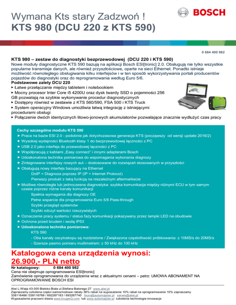 Wymana Kts stary Zadzwoń ! KTS 980 (DCU 220 z KTS 590) 0 684 400 982 KTS 980 – zestaw do diagnostyki bezprzewodowej (DCU 220 i KTS 590) Nowe moduły diagnostyczne KTS 590 bazują na aplikacji Bosch ESI[tronic] 2.0. Obsługują nie tylko wszystkie popularne transmisje danych, ale również przyszłościowe, oparte na sieci Ethernet. Ponadto istnieje możliwość równoległego obsługiwania kilku interfejsów i w ten sposób wykorzystywania portali producentów pojazdów do diagnostyki oraz do reprogramowania według Euro 5/6. Podstawowe zalety DCU 220 ▶ Łatwe przełączanie między tabletem i notebookiem ▶ Mocny procesor Inter Core i5 4200U oraz dysk twardy SSD o pojemności 256 GB pozwalają na szybkie wykonywanie procedur diagnostycznych ▶ Dostępny również w zestawie z KTS 560/590, FSA 500 i KTS Truck ▶ System operacyjny Windows umożliwia łatwą integrację z istniejącymi procedurami obsługi ▶ Połączenie dwóch identycznych litowo-jonowych akumulatorów pozwalające znacznie wydłużyć czas pracy Cechy szczególne modułu KTS 590 Praca na bazie ESI 2.0 - podobnie jak dotychczasowa generacja KTS (począwszy od wersji update 2016/2) Wysokiej wydajności Bluetooth klasy 1 do bezprzewodowej łączności z PC USB 2.0 jako interfejs do przewodowej łączności z PC Współpracują z kablami „Easy connect” i innymi adapterami Bosch Udoskonalona technika pomiarowa do wspomagania wykonania diagnozy Zintegrowane interfejsy nowych aut – dostosowane do rozwiązań stosowanych w przyszłości Obsługują nowy interfejs bazujący na Ethernet DoIP = Diagnoza poprzez IP (IP = Internet Protocol) Pierwszy produkt z taką funkcją na niezależnym aftermarkecie Możliwa równoległa lub jednoczesna diagnostyka: szybka komunikacja między różnymi ECU w tym samym czasie poprzez różne kanały komunikacji Spełnia wymagania dla diagnozy OE Pełne wsparcie dla programowania Euro 5/6 Pass-through Szybki przegląd systemów Szybki odczyt wartości rzeczywistych Oznaczenie pracy systemu / status fazy komunikacji pokazywany przez lampki LED na obudowie Ochrona przed brudem i wodą IP53 Udoskonalona technika pomiarowa: KTS 590 - Oba kanały oscyloskopu są rozdzielone / Zwiększona częstotliwość próbkowania: z 10MS/s do 20MS/s - Szersze pasmo pomiaru multimetrem: z 50 kHz do 100 kHz Katalogowa cena urządzenia wynosi: 26.900,- PLN netto Nr katalogowy: 0 684 400 982 Cena nie obejmuje oprogramowania ESI[tronic] Zamówienie oprogramowania do urządzenia wraz z aktualnymi cenami – patrz: UMOWA ABONAMENT NA OPROGRAMOWANIE BOSCH ESI Alwi L.Wieja 43-300 Bielsko Biała ul.Stefana Batorego 27 www.alwi.pl Zapraszamy szkolena części samochodowe rabaty 36% rabat na wyposażenie 10% rabat na oprogramowanie 10% zapraszamy 338116486 /338116769 / 692287183 / 693287740 [email protected] [email protected] Wyposażenie pracowni diesla www.krugerQ.com lub www.automajster.pl szkolenia technologie innowacje