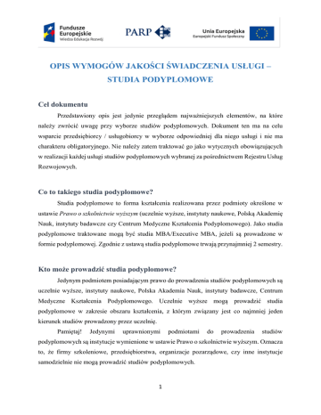 OPIS WYMOGÓW JAKOŚCI ŚWIADCZENIA USŁUGI – STUDIA PODYPLOMOWE Cel dokumentu Przedstawiony opis jest jedynie przeglądem najważniejszych elementów, na które należy zwrócić uwagę przy wyborze studiów podyplomowych. Dokument ten ma na celu wsparcie przedsiębiorcy / usługobiorcy w wyborze odpowiedniej dla niego usługi i nie ma charakteru obligatoryjnego. Nie należy zatem traktować go jako wytycznych obowiązujących w realizacji każdej usługi studiów podyplomowych wybranej za pośrednictwem Rejestru Usług Rozwojowych. Co to takiego studia podyplomowe? Studia podyplomowe to forma kształcenia realizowana przez podmioty określone w ustawie Prawo o szkolnictwie wyższym (uczelnie wyższe, instytuty naukowe, Polską Akademię Nauk, instytuty badawcze czy Centrum Medyczne Kształcenia Podyplomowego). Jako studia podyplomowe traktowane mogą być studia MBA/Executive MBA, jeżeli są prowadzone w formie podyplomowej. Zgodnie z ustawą studia podyplomowe trwają przynajmniej 2 semestry. Kto może prowadzić studia podyplomowe? Jedynym podmiotem posiadającym prawo do prowadzenia studiów podyplomowych są uczelnie wyższe, instytuty naukowe, Polska Akademia Nauk, instytuty badawcze, Centrum Medyczne Kształcenia Podyplomowego. Uczelnie wyższe mogą prowadzić studia podyplomowe w zakresie obszaru kształcenia, z którym związany jest co najmniej jeden kierunek studiów prowadzony przez uczelnię. Pamiętaj! Jedynymi uprawnionymi podmiotami do prowadzenia studiów podyplomowych są instytucje wymienione w ustawie Prawo o szkolnictwie wyższym. Oznacza to, że firmy szkoleniowe, przedsiębiorstwa, organizacje pozarządowe, czy inne instytucje samodzielnie nie mogą prowadzić studiów podyplomowych. 1 Kto może zostać uczestnikiem studiów podyplomowych? Uczestnikiem studiów podyplomowych może być jedynie osoba posiadająca wykształcenie na poziomie wyższym - posiadająca dyplom ukończenia studiów I stopnia (tytuł licencjata lub inżyniera), studiów II stopnia lub jednolitych studiów magisterskich (tytuł magistra). Na studia podyplomowe nie może zostać przyjęta osoba nieposiadająca wykształcenia wyższego (np. osoba będąca na ostatnim roku studiów I stopnia – studiów licencjackich). Jakie kwalifikacje uzyskam kończąc studia podyplomowe? Studia podyplomowe kończą się uzyskaniem kwalifikacji podyplomowych potwierdzonych świadectwem ukończenia studiów podyplomowych. Specyfika realizacji studiów podyplomowych: Czas realizacji studiów Studia podyplomowe trwają nie krócej niż dwa podyplomowych semestry Uzyskane kwalifikacje Kwalifikacje podyplomowe potwierdzone są świadectwem studiów podyplomowych Minimalna ilość punktów ECTS1 30 punktów ECTS Obowiązkowe elementy programu - określenie efektów kształcenia (wiedzy, umiejętności studiów podyplomowych i kompetencji społecznych) - określenie sposobu weryfikacji i dokumentowania efektów kształcenia - zakres programu (przedmioty/moduły) - ilość przypisanych punktów ECTS - liczba godzin kontaktowych Szczególne przypadki W określonych przypadkach studia podyplomowe powinny być realizowane zgodnie ze standardami kształcenia określonymi odrębnymi przepisami (np. Punkty zdefiniowane w europejskim systemie akumulacji i transferu punktów zaliczeniowych, jako miara średniego nakładu pracy osoby uczącej się̨, niezbędnego do uzyskania zakładanych efektów kształcenia 1 2 studia podyplomowe nadające uprawnienia do pracy w zawodzie nauczyciela) Formy realizacji podyplomowych studiów - studia stacjonarne (dzienne studia podyplomowe) – stosunkowo rzadko podyplomowych, zamówienie spotykana najczęściej konkretnej forma studiów realizowana instytucji (np. na studia podyplomowe, w których udział biorą pracownicy jednej firmy) - studia niestacjonarne (studia podyplomowe realizowane w formie weekendowych zjazdów) – najczęstsza i najbardziej typowa forma studiów podyplomowych; studia takie realizowane są z reguły z częstotliwością zjazdów raz na dwa tygodnie - studia learningiem) e-learningowe – studia (lub wspomagane wykorzystujące, ejako podstawowy sposób realizacji technologie internetowe, najczęściej realizowane na platformie e-learningowej. Studia takie często są realizowane także w formie blended learning (połączenie zjazdów tradycyjnych i zajęć realizowanych na platformie e-learningowej). Więcej o e-learningu w opisie usługi rozwojowej – elearning. Szukając studiów podyplomowych, które są odpowiednie dla Ciebie zwróć uwagę na: 1. Zakres tematyczny – zastanów się, z jakiego powodu podejmujesz studia podyplomowe i czego od nich oczekujesz. Jeżeli chcesz zmienić zawód, poznać nowy obszar/branżę szukaj studiów, które pozwolą Ci zapoznać się z daną tematyką i poznać różne aspekty danej dziedziny (np. „Kadry i płace”, „Zarządzanie jakością”, czy „Bezpieczeństwo i higiena pracy”). Jeżeli chciałbyś pogłębić daną tematykę w obszarze, w którym pracujesz, poszukaj studiów o tematyce węższej i programie koncentrującym się na danym zagadnieniu (np. zamiast studiów podyplomowych 3 „Technologie internetowe” wybierz np. „User Experience Design”, „Projektowanie aplikacji mobilnych na systemy Android i iOS” czy „Cloud Computing”). Jeżeli interesują Cię zagadnienia z danej branży, wybierz studia skierowane do konkretnej branży (np. „Psychologia sportu”, „Psychologia śledcza” czy „Psychologia transportu”). Na takich studiach spotkasz innych uczestników pracujących w tej samej branży i nawiążesz użyteczne kontakty biznesowe. 2. Liczbę godzin – w prawie nie istnieje określona minimalna liczba godzin dla studiów podyplomowych. Uczelnie mają pewną dowolność w określaniu ilości godzin zajęć. Niemniej jednak dobre praktyki w zakresie studiów podyplomowych pokazują, że trwają one średnio od 150 do 220 godzin lekcyjnych (godzina lekcyjna to 45 min). Wię