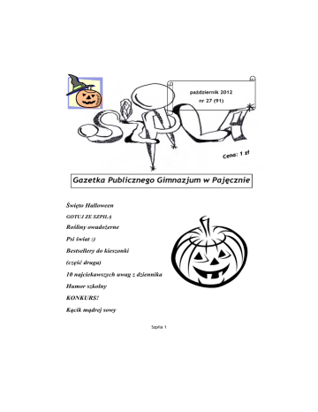 październik 2012 nr 27 (91) 1 zł Cena: Gazetka Publicznego Gimnazjum w Pajęcznie Święto Halloween GOTUJ ZE SZPILĄ Rośliny owadożerne Psi świat :) Bestsellery do kieszonki (część druga) 10 najciekawszych uwag z dziennika Humor szkolny KONKURS! Kącik mądrej sowy Szpila 1 W numerze: D laczego ob- chodzimy święto 11 Listopada? Zawsze w numerze: Od Redakcji Aktualności Porady Sport Kącik gadżetów Recenzje Kącik poetycki Opowiadania Powiedzonka nauczycieli Rozrywka (humor, rebusy, zagadki, ciekawostki) C ałą noc chodził po oświetlonych ulicach miasta. Nie mógł znaleźć sobie miejsca. Cieszył się, że zrobił to, co planował od kilku miesięcy. Żył wolnością, którą sam sobie zdobył jednym trzaśnięciem furtki, żegnając się tylko z tymi, których najchętniej…. W ielu z nas, często zastanawia się nad tym, co będzie robił w przyszłości, gdzie będzie mieszkał? Czy studia, które skończy będą dla niego gwarancją ….. H allloween jest obchodzone nocą 31pażdziernika, czyli w przeddzień Wszystkich Świętych. Związane jest z maskaradą i odnosi się ono do święta zmarłych. Najhuczniej obchodzone jest w Stanach Zjednoczonych, Irlandii , Kanadzie i Wielkiej Brytanii. Szpila 2 Od Redakcji Witajcie Kochani! Do waszych rąk trafia dziś kolejny numer Szpili. Mam nadzieję, że czas spędzany w szkole mija Wam szybko i przyjemnie. W tym numerze gazetki znajduje się konkurs, w którym można wygrać dodatkowy dzień neutralny. Zachęcam Was wszystkich do udziału w nim. Pozdrawiam Redaktor naczelna Karolina Hałaczkiewicz Szpila 3 Dlaczego obchodzimy święto 11 Listopada? 11 listopada każdego roku obchodzimy w Polsce Święto Niepodległości dla upamiętnienia odzyskania przez Polskę 11 listopada 1918 roku po 123 latach niepodległego państwa, które zniknęło z map po rozbiorach dokonanych przez Austrię, Prusy i Rosję. Święto to zostało ustanowione 23 kwietnia 1937 roku. Do wybuchu II wojny światowej obchodzono je tylko dwa razy. Zostało przywrócone dopiero w 1989 roku. To dzień wolny od pracy. W naszym kraju upamiętnia się narodowe święto najczęściej poprzez uroczystości rocznicowe w miastach połączone z przemarszami mieszkańców i władz miast lub gmin, składaniem kwiatów w miejscach pamięci narodowej, tak jak w Pajęcznie. W naszym mieście w kultywowanie rocznicy 11 Listopada włącza się aktywnie młodzież gimnazjum, która udekorowana białoSzpila 4 U nas w szkole co roku uczestniczymy w akademiach, przedstawieniach słowno- muzycznych, podkreślamy powagę dnia galowym strojem i przypominamy wielkie chwile z naszej historii przy dźwiękach „Mazurka Dąbrowskiego”. http://forum.e-kwidzyn.pl/ viewtopic.php?f=127&t=11005&start=105 czerwonymi kotylionami bierze udział wraz z dorosłymi mieszkańcami w rocznicowej mszy i przy akompaniamencie muzycznym orkiestry maszeruje ulicami Pajęczna, by zapalić znicze i złożyć kwiaty za tych, którzy kiedyś walczyli i zginęli, byśmy teraz mieli niepodległą ojczyznę. W Warszawie główne obchody obchodzone są na placu Józefa Piłsudskiego. Jędrzej Krzak http://www.lgd-szlakiemgranitu.pl Szpila 5 Niepoprawny optymista Całą noc chodził po oświetlonych ulicach miasta. Nie mógł znaleźć sobie miejsca. Cieszył się, że zrobił to, co planował od kilku miesięcy. Żył wolnością, którą sam sobie zdobył jednym trzaśnięciem furtki, żegnając się tylko z tymi, których najchętniej zabrałby ze sobą, ale choć ciężko mu było się do tego przyznać, już tęsknił za szarym pokojem, który dzielił do dzisiejszej nocy z trójką przyjaciół. Był zmęczony. Zastanawiał się chwilę, gdzie dzisiaj będzie spał? Oczy same mu się zamykały, a ciało nie było zdolne do myślenia, więc tylko podziękował Bogu za ciepłą noc i wyjął z plecaka śpiwór. Przypomniał sobie o swoim starym, wygodnym łóżku i z rezygnacją położył się pod gołym niebem. mógł powiedzieć, że lipcowe poranki należą do zimnych. Ciepły powiew wiatru rozwiał mu włosy, a on tylko uśmiechnął się głupio, przypominając sobie co wczoraj zrobił. Wyjął telefon z kieszeni i zadzwonił do kolegi. Pora zorganizować sobie coś lepszego- pomyślał. Po trzecim sygnale wreszcie odebrał. -Co? - wydusił zaspanym głosem kolega, który znał go od najmłodszych lat- Co jest? -Hmm. Tak jakby taka mała sprawa. -Spałem.-odpowiedział sjonalnym tonem. Obudził się wcześnie, ale nie preten- -No, ale w każdym razie to mogę u ciebie pomieszkać?- zapytał- Wiesz, kilka nocek. -Co? -Mogę? -Jasne, że nie. -Stary, dzięki. Jesteś wielki. Wsiadam w tramwaj. Zrób jajecznicę. Głodny jestem. Rozłączył się i piętnaście minut później czekał już na tramwaj. Założył słuchawki i próbował wytrzymać jeszcze kilka przystan- Szpila 6 ków w pojeździe, zdecydowanie za małym dla tylu osób, ile w nim jechało. Wreszcie mógł wysiąść. Teraz tylko znaleźć ten blok. Pięć minut i już wbiegł na drugie piętro. Kochanowskiego 5/12. Jak dobrze pójdzie, to trochę tu pomieszkam- pomyślał i zaśmiał się w duchu. Zadzwonił do drzwi. A te otworzyły się i stary kumpel pytającym wzrokiem spojrzał na niego. Widząc to spojrzenie on zaczął się śmiać i zdjął buty, wszedł do kuchni i oświadczył, że „całkiem, całkiem to nasze mieszkanie”. -Za każdym razem kiedy cię widzę, wydajesz się robić coraz głupszypowiedział posiadacz małej kawalerki, śmiejąc się- Co tak stoisz, siadaj. A tak w ogóle to uciekłeś z placówki czy jak? I w tym momencie opowiedział mu co zrobił i po co. Powiedział mu, że uciekł, że wreszcie coś zrobił, że nie będzie patrzył jak życie mu ucieka, że wyruszył by być szczęśliwym. On go słuchał i uznał, że musiało mu się w tej placówce bardzo nudzić, skoro wymyślił coś takiego. Najbardziej zastanawiało go jednak, w jaki sposób i gdzie jego kumpel to szczęście chce znaleź