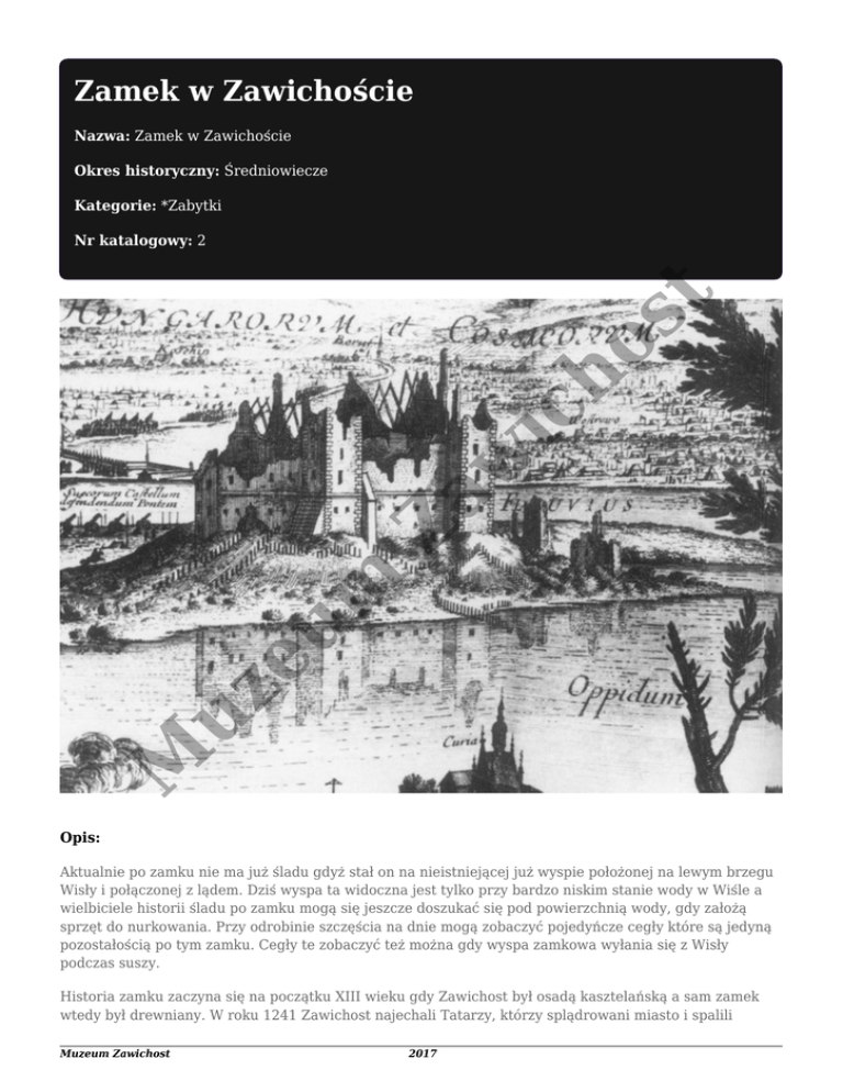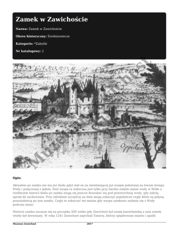 Zamek w Zawichoście Nazwa: Zamek w Zawichoście Okres historyczny: Średniowiecze Kategorie: *Zabytki M uz eu m Za w ic ho s t Nr katalogowy: 2 Opis: Aktualnie po zamku nie ma już śladu gdyż stał on na nieistniejącej już wyspie położonej na lewym brzegu Wisły i połączonej z lądem. Dziś wyspa ta widoczna jest tylko przy bardzo niskim stanie wody w Wiśle a wielbiciele historii śladu po zamku mogą się jeszcze doszukać się pod powierzchnią wody, gdy założą sprzęt do nurkowania. Przy odrobinie szczęścia na dnie mogą zobaczyć pojedyńcze cegły które są jedyną pozostałością po tym zamku. Cegły te zobaczyć też można gdy wyspa zamkowa wyłania się z Wisły podczas suszy. Historia zamku zaczyna się na początku XIII wieku gdy Zawichost był osadą kasztelańską a sam zamek wtedy był drewniany. W roku 1241 Zawichost najechali Tatarzy, którzy splądrowani miasto i spalili Muzeum Zawichost 2017 drewniany zamek. Po tym zdarzeniu zamek został odbudowany (częściowo murowany a częściowo drewniany) przez króla Bolesława Wstydliwego. Zamek stał się wtedy jedną z rezydencji tego króla Polski. Jan Długosz w swych księgach opisuje, iż na początku XIV wieku zamek ten stal się już w pełni murowanym zamkiem książęcym i odgrywał bardzo ważną role w systemie obronnym wschodnich granic, które były najeżdżane przez Tatarów i Litwinów. t W 1384 roku Zawichost znów został splądrowany, tym razem przez Litwinów, którymi dowodził przyszły król Polski Władysław Jagiełło. Zamek nie został zniszczony lecz ogołocony ze wszelkich dóbr. Dwa lata później na zamku znów zjawił się Jagiełło ale tym razem jako gość. W 1502 roku Tatarzy znów splądrowali miasto ale zamek tym razem nie został zdobyty. Pod koniec XVI wieku zamek został przebudowany aby mógł lepiej spełniać swoje funkcje obronne. W 1655 roku zamek jednak zdobyty został przez Szwedów którzy zajęli też Zawichost. Rok później miasto wraz z zamkiem zostało odbite przez Stefana Czarneckiego. ic ho s W 1657 roku Zawichost zalała ogromna fala uciekających przed Polakami wojsk szwedzkich ( około 70 tys ) wspomaganych przez wojska węgierskie, rumuńskie i kozackie. Zawichost został doszczętnie zniszczony a zamek spalony i częściowo zburzony. Z 1200 mieszkańców Zawichostu najazd wojsk Szwedzkich przeżyło tylko 241 osób. W 1678 zniszczony zamek popadał w coraz większą ruinę a część jego murów rozebrano i wykorzystano do budowy kościoła reformatów w Sandomierzu. Sama wyspa, na której stał zamek niszczona była przez coraz częstsze powodzie i zmieniające swój bieg koryto Wisły. M uz eu m Za w W 1813 roku ogromna powódź, która nawiedziła te tereny zalała całkowicie wyspę zamkową i nad powierzchnię wody wystawała tylko część ruin. Z czasem nurt rzeki osłabił mury zamku do tego stopnia, że rozpadły się one całkowicie a wyspa widoczna jest tylko podczas suszy. Najstarsi mieszkańcy Zawichostu mówią o tym, że na początku XX wieku pozostałości murów były jeszcze czasami widoczne lecz i one już nie oparły się nurtowi rzeki i na dnie zostały tylko pojedyńcze kamienie i cegły po tym zamku, który kiedyś pełnił ważną rolę w obronności tych terenów . Muzeum Zawichost 2017
