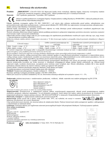 PL Produkt: Material: Informacje dla użytkownika „BRIGHTON” 1210 078 XXX XX Mężczyźni kurtka otwór wentylacji, odpinany kaptur, elastyczny wewnętrzny mankiet w rękawach, możliwość ściągania w dolnej części. Odzież produkowana jest w rozmaitych kolorach. 100 % poliester, podszewka / wyściółka: 100 % poliester Odzież ta spełnia podstawowe wymagania higieny i bezpieczeństwa według Dyrektywy 89/686/EWG i dalszych podanych norm. Środek ochrony indywidualnej kategorii I. Użycie: Spełniają wymagania ogólne EN ISO 13688:2013 i cel użycia jako ochrona użytkownika przed pyłem, zabrudzeniem oraz powierzchniowymi wpływami mechanicznymi, i ochrona przed chłodem EN 14058:2004, bez zapewnienia wyższego poziomu zabezpieczenia – środek ochrony indywidualnej o konstrukcji prostej. Materiał kurtki wierzchniej ma specjalne wykończenie odporne na wodę chroniące przed niekorzystnymi warunkami pogodowymi (np. deszczem, śniegiem), mgłą i wilgocią gruntową. Wartość ochronna efektywnej izolacji cieplnej odzieży poddanej pomiarom to połączenie temperatury powietrza otoczenia i poziomu czynności (wytwarzanie ciepła w procesach metabolizmu). Odpowiedni poziom izolacji całego ciała nie jest wystarczający do zapobieżenia przechłodzeniu wrażliwych części ciała (np. ręce, nogi, twarz) i z nim powiązanym ryzykiem odmrożeń. Efektywna izolacja cieplna odzieży i temperatury otoczenia w °C dla równowagi cieplnej w przypadku różnych poziomów działalności i długości narażenia: Lekkie czynności poruszającego się Umiarkowane czynności poruszającego się Człowiek stojący człowieka człowieka Maks. 8 godz. w temp. 11 °C Maks. 8godz. w temp. -1 °C Maks. 8 godz. w temp. -19 °C Maks. 1godz. w temp. -2 °C Maks. 1 godz. w temp. -15 °C Maks. 1 godz. w temp. -32 °C Te wartości temperatur obowiązują tylko w przypadku równomiernego rozłożenia izolacji na ciele i z odpowiednimi rękawicami, obuwiem i nakryciem głowy i przy prędkości powietrza od 0,3 m/s do 0,5 m/s. Wyższa prędkość wiatru pod wpływem wyższego działania chłodzącego wiatru spowoduje podwyższenie temperatury w tabeli. Wyboru właściwej odzieży według stosownej klasy należy dokonać zgodnie ze specyficznymi potrzebami związanymi ze stanowiskiem pracy, według rodzaju ryzyka i konkretnych warunków na stosownym stanowisku pracy. Odpowiedzialność za ten wybór ponosi pracodawca. Jest on zobowiązany określić i wybrać prawidłowy typ odzieży jeszcze przed rozpoczęciem jej użytkowania. Ostrzeżenie dla użytkownika: W wypadku konsekwentnego przestrzegania określonego celu użycia nie powstaje ryzyko mogące zagrażać zdrowiu użytkownika (wyrobów nie wolno stosować w warunkach wymagających innego rodzaju funkcji ochronnych, np. ochrona przed wpływami ciepła, ryzykiem chemicznym, zaczepienie przez ruchome części urządzeń, itp.). Mocno zabrudzony, rozdarty lub w inny sposób uszkodzony element odzieży nie stanowi ochrony i należy go naprawić lub zamienić. Ostrość słuchu i widzenie peryferyjne mogą być obniżone, jeżeli ubrany jest kaptur. Po każdej procedurze czyszczenia izolacja cieplna może ulec obniżeniu. Wielkość: Oznakowano piktogramem z kodem wielkości S – XXXXL Rozmiary spełniają wymagane przedziały zgodnie z EN ISO 13688:2013. Odzież jest uszyta na wysokość standardową 182 cm. Dozwolona tolerancja odchyleń od wymiarów wynosi +4 i –3%. Znakowanie: etykieta naszywana z oznakowaniem producenta, wielkości, składu materiału oraz znaków pielęgnacji wg EN 23758. Klasa odporności cieplnej Rct Klasa oddychalności AP Klasa przenikalności wody WP Wartość izolacji Icler Wartość izolacji Icle Stosowanie X zamiast cyfry oznacza, że odzież nie została poddana badaniu. Magazynowanie: Przechowywać w zamkniętych suchych, dobrze wentylowanych magazynach, chronić przed promieniującym ciepłem elementów grzejnych, ulokować minimalnie 1 m od elementów grzejnych. Jeżeli odzież jest mokra, należy ją pozostawić do wyschnięcia w temperaturze pokojowej i dopiero później schować. NIE MAGAZYNOWAĆ w miejscach z bezpośrednim promieniowaniem słonecznym. Pakowanie, transport: w opakowaniach zamkniętych, przezroczystych PE. Konserwacja: pranie ręczne lub w pralce, temp. prania maks. 30°C, nie wybielać, nie suszyć w suszarce bębnowej, nie prasować, nie czyścić chemicznie. Umyć przed pierwszym użyciem, nie stosować płynu do zmiękczania tkanin. Podczas konserwacji należy postępować zgodnie z piktogramami i wskazówkami na etykietach ubrań. . Utylizacja: Utylizacja odzieży jest regulowana ustawami poszczególnych krajów lub przepisami lokalnymi. Utylizacja poprzez spalenie. Wzór etykiety na ubraniach: Nazwa produktu Kod Kategoria, znak CE – zgodność z NV Skład materiału Symbol pielęgnacji Wielkość, piktogram wielkości, 2 wymiary wielkości ostrzeżenie nakazujące zapoznanie się z instrukcją użytkowania Oznakowanie producenta Producent: Adres do kontaktu: U Tesly 1825, 735 41 Petřvald, CZ.