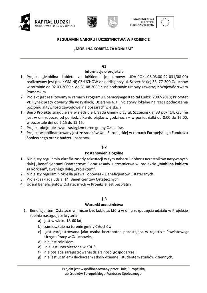 REGULAMIN NABORU I UCZESTNICTWA W PROJEKCIE „MOBILNA KOBIETA ZA KÓŁKIEM” 1. 2. 1. 2. 3. 1. 2. 3. 4. §1 Informacje o projekcie Projekt „Mobilna kobieta za kółkiem” (nr umowy UDA-POKL.06.03.00-22-031/08-00) realizowany jest przez GMINĘ CZŁUCHÓW z siedzibą przy ul. Szczecioskiej 33, 77-300 Człuchów w terminie od 02.03.2009 r. do 31.08.2009 r. na podstawie umowy zawartej z Województwem Pomorskim. Projekt jest realizowany w ramach Programu Operacyjnego Kapitał Ludzki 2007-2013; Priorytet VI: Rynek pracy otwarty dla wszystkich; Działanie 6.3: Inicjatywy lokalne na rzecz podnoszenia poziomu aktywności zawodowej na obszarach wiejskich Biuro Projektu znajduje się w siedzibie Urzędu Gminy przy ul. Szczecioskiej 33 pok. 14, czynne jest w dni robocze od poniedziałku do piątku w godzinach – w poniedziałki od 8:00 do 16:00, w pozostałe dni od 7:15 do 15:15. Projekt obejmuje swym zasięgiem teren gminy Człuchów. Projekt współfinansowany jest ze środków Unii Europejskiej w ramach Europejskiego Funduszu Społecznego oraz z budżetu paostwa. §2 Postanowienia ogólne Niniejszy regulamin określa zasady rekrutacji w tym naboru i doboru uczestników nazywanych dalej „Beneficjentami Ostatecznymi” oraz zasady uczestnictwa w projekcie „Mobilna kobieta za kółkiem”, zwanego dalej „Projektem”. Niniejszy regulamin określa prawa i obowiązki Beneficjentów Ostatecznych. Projekt zakłada udział 14 Beneficjentów Ostatecznych. Udział Beneficjentów Ostatecznych w Projekcie jest bezpłatny §3 Warunki uczestnictwa 1. Beneficjentem Ostatecznym może byd kobieta, która w dniu rozpoczęcia udziału w Projekcie spełnia następujące kryteria: a) jest w wieku 18-60 lat, b) zamieszkuje na terenie gminy Człuchów c) jest zarejestrowana jako osoba bezrobotna pozostająca w rejestrze Powiatowego Urzędu Pracy w Człuchowie, d) nie jest rolnikiem, e) nie jest ubezpieczona w KRUS, f) nie posiada zarejestrowanej działalności gospodarczej, g) nie jest uczniem/słuchaczem szkoły dziennej, studentem studiów dziennych, Projekt jest współfinansowany przez Unię Europejską ze środków Europejskiego Funduszu Społecznego 2. Warunkiem uczestnictwa w projekcie po spełnieniu kryteriów określonych w § 3 p.1 niniejszego regulaminu, jest złożenie w Biurze Projektu osobiście formularza rekrutacyjnego. §4 Zasady rekrutacji 1. Rekrutacja prowadzona będzie od 23 marca 2009 r. do 5 kwietnia 2009 r. 2. Termin i zasady rekrutacji są opublikowane na stronie internetowej www.ugczluchow.pl oraz na plakatach i ulotkach informacyjnych 3. Osoby zainteresowane uczestnictwem w projekcie będą zobowiązane złożyd osobiście w terminie naboru w Biurze Projektu formularz zgłoszeniowy wraz z wymaganymi załącznikami 4. Formularz zgłoszeniowy oraz wzory wymaganych załączników są dostępne są na stronie internetowej www.ugczluchow.pl lub w Biurze Projektu. 5. Wymagane załączniki do formularza zgłoszeniowego to: zaświadczenie z PUP o figurowaniu w ewidencji osób bezrobotnych i poszukujących pracy, kserokopia dowodu osobistego 6. Dodatkowe załączniki dokumentujące sytuację kandydata na rynku pracy to: oświadczenie przewodniczącej Koła Gospodyo Wiejskich o aktywnym członkostwie w kole, oświadczenie o przerwie w zatrudnieniu związanej z wychowaniem dziecka, zaświadczenie z PUP dokumentujące bezrobocie długotrwałe (powyżej 24 miesięcy), oświadczenie o dochodzie na członka rodziny za 3 miesiące poprzedzające złożenie wniosku, zgodne ze wzorem, oświadczenie pracodawcy o odmowie zatrudnienia kandydata do udziału w projekcie z powodu braku uprawnieo do kierowania pojazdami kat. B, inne dokumenty mogące mied wpływ na decyzje Komisji ds. rekrutacji Beneficjentów Ostatecznych. 7. Zgłoszenia do udziału przyjmowane są w terminie naboru we wszystkie dni robocze w godzinach od 12:00 do 15:00. 8. Złożone dokumenty zgłoszeniowe będą na bieżąco weryfikowane, a potencjalni uczestnicy będą niezwłocznie informowani o wyniku weryfikacji i ewentualnej konieczności poprawienia lub uzupełnienia dokumentów. 9. Osoba, która złoży formularz zgłoszeniowy wraz z niezbędnymi załącznikami zostanie wpisana na listę zgłoszeniową i uzyska potwierdzenie zgłoszenia wraz z numerem liczby porządkowej na liście zgłoszeniowej. 10. Kompletne i poprawne zgłoszenia wprowadzane będą wg daty ich wpływu do rejestru formularzy zgłoszeniowych do Projektu. 11. Decyzje o zakwalifikowaniu do uczestnictwa w projekcie podejmie Komisja ds. rekrutacji Beneficjentów Ostatecznych. Komisja jest powołana przez Wójta Gminy Człuchów. Komisja liczy 5 osób. Każdy ze złożonych wniosków będzie oceniany punktami zgodnie z regulaminem selekcji kandydatów do Projektu. Punkty będą przyznawane jako średnia ocen wystawionych przez każdego z członków komisji. Projekt jest współfinansowany przez Unię Europejską ze środków Europejskiego Funduszu Społecznego 12. O zakwalifikowaniu do projektu uczestnicy będą mogli dowiedzied się ze strony internetowej Beneficjenta www.ugczluchow.pl, w Biurze Projektu lub telefonicznie pod nr tel. 059 83 41 001 13. Osoba zakwalifikowana do udziału w projekcie zobowiązana będzie do podpisania umowy uczestnictwa w projekcie wraz z następującymi załącznikami: zakres danych PEFS uczestników biorących udział w projektach realizowanych w ramach POKL, oświadczenie o spełnieniu kryteriów udziału w projekcie, zgoda na przetwarzanie danych osobowych, oświadczenie Beneficjenta Ostatecznego 14. Osoby nie zakwalifikowane do projektu, lecz spełniające wymogi formalne zostaną umieszczone na liście rezerwowej i będą mogły wejśd do projektu w momencie rezygnacji któregoś z zakwalifikowanych uczestników. §5 Zakres Projektu 1. W wyniku naboru do udziału w projekcie zostanie zakwalifikowanych 14 kobiet, które wezmą udział w kursie na prawo jazdy kat. B wraz z egzaminem oraz w szkoleniu „Pewna siebie kobieta – roz