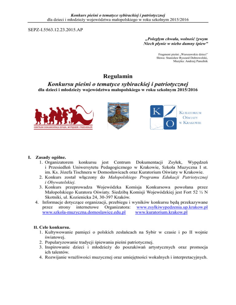 Konkurs pieśni o tematyce sybirackiej i patriotycznej dla dzieci i młodzieży województwa małopolskiego w roku szkolnym 2015/2016 SEPZ-I.5563.12.23.2015.AP „Poległym chwała, wolność żywym Niech płynie w niebo dumny śpiew” Fragment pieśni „Warszawskie dzieci” Słowa: Stanisław Ryszard Dobrowolski, Muzyka: Andrzej Panufnik Regulamin Konkursu pieśni o tematyce sybirackiej i patriotycznej dla dzieci i młodzieży województwa małopolskiego w roku szkolnym 2015/2016 I. Zasady ogólne. 1. Organizatorem konkursu jest Centrum Dokumentacji Zsyłek, Wypędzeń i Przesiedleń Uniwersytetu Pedagogicznego w Krakowie, Szkoła Muzyczna I st. im. Ks. Józefa Tischnera w Domosławicach oraz Kuratorium Oświaty w Krakowie. 2. Konkurs został włączony do Małopolskiego Programu Edukacji Patriotycznej i Obywatelskiej. 3. Konkurs przeprowadza Wojewódzka Komisja Konkursowa powołana przez Małopolskiego Kuratora Oświaty. Siedzibą Komisji Wojewódzkiej jest Fort 52 ½ N Skotniki, ul. Kozienicka 24, 30-397 Kraków. 4. Informacje dotyczące organizacji, przebiegu i wyników konkursu będą przekazywane przez strony internetowe Organizatora: www.zsylkiwypedzenia.up.krakow.pl www.szkola-muzyczna.domoslawice.edu.pl www.kuratorium.krakow.pl II. Cele konkursu. 1. Kultywowanie pamięci o polskich zesłańcach na Sybir w czasie i po II wojnie światowej. 2. Popularyzowanie tradycji śpiewania pieśni patriotycznej. 3. Inspirowanie dzieci i młodzieży do poszukiwań artystycznych oraz promocja ich talentów. 4. Rozwijanie wrażliwości muzycznej oraz umiejętności wokalnych i interpretacyjnych. Konkurs pieśni o tematyce sybirackiej i patriotycznej dla dzieci i młodzieży województwa małopolskiego w roku szkolnym 2015/2016 III. Uczestnictwo w konkursie. 1. Konkurs ma charakter otwarty i skierowany jest do uczniów szkół muzycznych I i II stopnia oraz uczniów gimnazjów województwa małopolskiego. 2. W konkursie mogą brać udział soliści. 3. Przystąpienie uczniów do konkursu jest równoznaczne z akceptacją Regulaminu konkursu. 4. Laureaci i finaliści konkursu otrzymają zaświadczenia Małopolskiego Kuratora Oświaty. 5. Laureaci konkursu otrzymają nagrody ufundowane m.in. przez Organizatorów. IV. Lp. Harmonogram konkursu. Zadanie Termin 1. Zgłoszenie przez szkołę udziału w konkursie – wypełnienie do 7 grudnia 2015 r. karty zgłoszenia (załącznik nr 1) i przesłanie jej na adres: [email protected] 2. Wyłonienie przez komisję szkolną nie więcej niż trzech do 21 grudnia 2015 r. uczniów, którzy uzyskali największą liczbę punktów oraz przesłanie protokołu z eliminacji szkolnych do siedziby komisji wojewódzkiej (adres: Fort 52 ½ N Skotniki, ul. Kozienicka 24, 30-397 Kraków). 3. 4. Opublikowanie listy uczestników zakwalifikowanych do 4 stycznia 2016 r. do etapu wojewódzkiego na stronie internetowej Organizatora konkursu. Eliminacje wojewódzkie. 3 i 4 lutego 2016 r. 5. Opublikowanie listy finalistów i laureatów internetowej Organizatora konkursu. 6. Gala finałowa konkursu. na stronie do 8 lutego 2016 r. 10 lutego 2016 r. V. Przebieg konkursu. 1. Konkurs przeprowadzany jest w dwóch etapach: szkolnym i wojewódzkim. 2. Konkurs przeprowadzany jest w trzech kategoriach: a) uczniowie szkół muzycznych do 14 roku życia; b) uczniowie szkół muzycznych od 15 do 18 roku życia włącznie (decyduje data urodzenia); c) uczniowie gimnazjów. 3. Szkoła zgłasza udział w konkursie poprzez wypełnienie karty zgłoszenia (załącznik nr 1 do Regulaminu) i przesłanie jej na adres:[email protected] 4. Etap szkolny przeprowadzany jest przez szkolną komisję konkursową powołaną przez dyrektora szkoły. 5. Komisja szkolna przeprowadza etap szkolny i wyłania nie więcej niż trzech uczniów, którzy uzyskali największą liczbę punktów. 6. Komisja szkolna uzyskuje zgodę rodziców (prawnych opiekunów) na udział uczniów w konkursie lub zgodę pełnoletnich uczestników na przetwarzanie do celów Konkurs pieśni o tematyce sybirackiej i patriotycznej dla dzieci i młodzieży województwa małopolskiego w roku szkolnym 2015/2016 7. 8. 9. 10. 11. 12. 13. 14. 15. konkursu danych osobowych uczniów i wykorzystywanie wizerunku w materiałach konkursu oraz uzyskuje ich potwierdzenie, że zapoznali się z Regulaminem i akceptują jego postanowienia, zgodnie z wzorem (załącznik nr 2 do Regulaminu). Oświadczenia te zostają w szkole. Komisja szkolna przesyła protokół z przebiegu eliminacji szkolnych zgodnie z wzorem (załącznik nr 3 do Regulaminu) do siedziby komisji wojewódzkiej. Rozstrzygnięcie komisji szkolnej jest ostateczne. Komisja wojewódzka na podstawie przesłanych protokołów szkolnych kwalifikuje uczniów do eliminacji wojewódzkich. Etap wojewódzki organizuje i przeprowadza komisja wojewódzka w dwóch terminach: 3 i 4 lutego 2016 r. Szczegółowy harmonogram przesłuchań będzie podany w odrębnym komunikacie. Komisja wojewódzka, w każdej kategorii, wyłania: a) finalistów, tj. uczniów, którzy uzyskali co najmniej 60% punktów możliwych do uzyskania; b) laureatów, tj. nie więcej niż trzech uczniów, którzy uzyskali największą liczbę punktów. Komisja wojewódzka może przyznać dodatkowe nagrody i wyróżnienia. Rozstrzygnięcie komisji wojewódzkiej jest ostateczne. Komisja wojewódzka ogłasza listę finalistów i laureatów na stronie internetowej Organizatora konkursu. Informacja o uroczystym zakończeniu – gali finałowej konkursu zostanie podana w odrębnym komunikacie. Komisja szkolna i wojewódzka prowadzi dokumentację konkursu do 31 sierpnia 2016 r. VI. Zasady prezentacji utworów. 1. W etapie szkolnym uczestnik wykonuje jedną dowolną pieśń patriotyczną (można ją powtórzyć w etapie wojewódzkim). 2. W etapie wojewódzkim uczestnik wykonuje dwie pieśni - patriotyczną oraz o tematyce sybirackiej. 3. Forma występu: a) w kategorii uczniowie szkół muzycznych - śpiew z akompaniamentem instrumentu / instrument