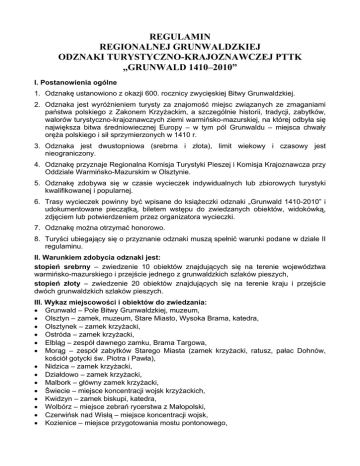 REGULAMIN REGIONALNEJ GRUNWALDZKIEJ ODZNAKI TURYSTYCZNO-KRAJOZNAWCZEJ PTTK „GRUNWALD 1410–2010” I. Postanowienia ogólne 1. Odznakę ustanowiono z okazji 600. rocznicy zwycięskiej Bitwy Grunwaldzkiej. 2. Odznaka jest wyróżnieniem turysty za znajomość miejsc związanych ze zmaganiami państwa polskiego z Zakonem Krzyżackim, a szczególnie historii, tradycji, zabytków, walorów turystyczno-krajoznawczych ziemi warmińsko-mazurskiej, na której odbyła się największa bitwa średniowiecznej Europy – w tym pól Grunwaldu – miejsca chwały oręża polskiego i sił sprzymierzonych w 1410 r. 3. Odznaka jest dwustopniowa (srebrna i złota), limit wiekowy i czasowy jest nieograniczony. 4. Odznakę przyznaje Regionalna Komisja Turystyki Pieszej i Komisja Krajoznawcza przy Oddziale Warmińsko-Mazurskim w Olsztynie. 5. Odznakę zdobywa się w czasie wycieczek indywidualnych lub zbiorowych turystyki kwalifikowanej i popularnej. 6. Trasy wycieczek powinny być wpisane do książeczki odznaki „Grunwald 1410-2010” i udokumentowane pieczątką, biletem wstępu do zwiedzanych obiektów, widokówką, zdjęciem lub potwierdzeniem przez organizatora wycieczki. 7. Odznakę można otrzymać honorowo. 8. Turyści ubiegający się o przyznanie odznaki muszą spełnić warunki podane w dziale II regulaminu. II. Warunkiem zdobycia odznaki jest: stopień srebrny – zwiedzenie 10 obiektów znajdujących się na terenie województwa warmińsko-mazurskiego i przejście jednego z grunwaldzkich szlaków pieszych, stopień złoty – zwiedzenie 20 obiektów znajdujących się na terenie kraju i przejście dwóch grunwaldzkich szlaków pieszych. III. Wykaz miejscowości i obiektów do zwiedzania: • Grunwald – Pole Bitwy Grunwaldzkiej, muzeum, • Olsztyn – zamek, muzeum, Stare Miasto, Wysoka Brama, katedra, • Olsztynek – zamek krzyżacki, • Ostróda – zamek krzyżacki, • Elbląg – zespół dawnego zamku, Brama Targowa, • Morąg – zespół zabytków Starego Miasta (zamek krzyżacki, ratusz, pałac Dohnów, kościół gotycki św. Piotra i Pawła), • Nidzica – zamek krzyżacki, • Działdowo – zamek krzyżacki, • Malbork – główny zamek krzyżacki, • Świecie – miejsce koncentracji wojsk krzyżackich, • Kwidzyn – zamek biskupi, katedra, • Wolbórz – miejsce zebrań rycerstwa z Małopolski, • Czerwińsk nad Wisłą – miejsce koncentracji wojsk, • Kozienice – miejsce przygotowania mostu pontonowego, • Płock – ostateczne połączenie oddziałów Unii, • Klasztor św. Krzyża na Łysej Górze – miejsce modlitwy króla Władysława Jagiełły, • Kraków – Wawel, Pomnik Grunwaldzki, • Toruń – miejsce pokoju toruńskiego 1411 r. Ponadto miejscowości związane z przemarszem wojsk polskich i krzyżackich oraz przebiegiem bitwy: • Nowe Miasto Lubawskie, Kurzętnik, Lubawa, Bratian k/Lubawy, Lidzbark Welski, Chełsty, wieś Wysoka pod Działdowem, Uzdowo, Marwałd, Stębark, Łodwigowo, Frygnowo, Dąbrówno, Drwęck, Ulnowo, Bądzyń nad Wkrą, Sztum, Dzierzgoń, Przezmark, Golub-Dobrzyń. IV. Wykaz szlaków pieszych grunwaldzkich: 1. Olsztynek PKP – Królikowo – droga Lichtajny – Drwęck – leśniczówka Mielno – Lipowa Góra – Stębark – Grunwald pole bitwy (kolor znaków zielony), 2. Waplewo PKP – pole bitwy w Grunwaldzie – Wzgórza Dylewskie – Samborowo PKP (kolor znaków niebieski), 3. Grunwald pole bitwy – Grunwald wieś – Frygnowo – Fiugajny – Jagodziny – Czerlin – Omule – Lubawa – Targowisko – Radomno skrzyżowanie – Bratian – Nowe Miasto Lubawskie – Kurzętnik (kolor znaków czarny), 4. Grunwald pole bitwy – Łodwigowo – Leszcz – Grzybiny – Uzdowo – Turza – Wysoka – Turza Mała – Jeleń – Wąpiersk – Chełsty – Kurojady – Lidzbark – Jez. Zwórzno – Bryńsk Szlachecki – Nowe Konopaty – Bądzyń (kolor znaków czerwony). V. Postanowienia końcowe 1. Interpretacja Regulaminu Odznaki należy do Regionalnej Komisji Turystyki Pieszej i Komisji Krajoznawczej przy Oddziale Warmińsko-Mazurskim PTTK. 2. Regulamin opracowała RKTP w Olsztynie pod kierunkiem Elżbiety Nowak. 3. Projekt Odznaki Grunwaldzkiej – Zbigniew Piszczako. 4. Współpraca Departamentu Warmińsko-Mazurskiego. Turystyki Urzędu Marszałkowskiego Województwa 2