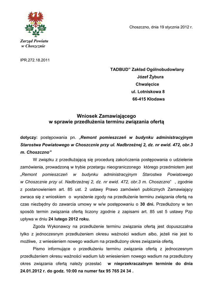 Choszczno, dnia 19 stycznia 2012 r. Zarząd Powiatu w Choszcznie IPR.272.18.2011 TADBUD” Zakład Ogólnobudowlany Józef Żybura Chwalęcice ul. Lotniskowa 8 66-415 Kłodawa Wniosek Zamawiającego w sprawie przedłużenia terminu związania ofertą dotyczy: postępowania pn. „Remont pomieszczeń w budynku administracyjnym Starostwa Powiatowego w Choszcznie przy ul. Nadbrzeżnej 2, dz. nr ewid. 472, obr.3 m. Choszczno” W związku z przedłużającą się procedurą zakończenia postępowania o udzielenie zamówienia, prowadzoną w trybie przetargu nieograniczonego którego przedmiotem jest „Remont pomieszczeń w budynku administracyjnym Starostwa Powiatowego w Choszcznie przy ul. Nadbrzeżnej 2, dz. nr ewid. 472, obr.3 m. Choszczno” , zgodnie z postanowieniem art. 85 ust. 2 ustawy Prawo zamówień publicznych Zamawiający zwraca się z wnioskiem o wyrażenie zgody na przedłużenie terminu związania ofertą na czas niezbędny do zawarcia umowy w w/w postępowaniu o 30 dni. Przedłużony w ten sposób termin związania ofertą liczony zgodnie z zapisami art. 85 ust 5 ustawy Pzp upływa w dniu 24 lutego 2012 roku. Zgoda Wykonawcy na przedłużenie terminu związania ofertą jest dopuszczalna tylko z jednoczesnym przedłużeniem okresu ważności wadium albo, jeżeli nie jest to możliwe, z wniesieniem nowego wadium na przedłużony okres związania ofertą. Pismo informujące o przedłużeniu terminu związania ofertą z jednoczesnym przedłużeniem okresu ważności wadium lub wniesieniem nowego wadium na przedłużony okres związania ofertą należy przesłać w nieprzekraczalnym terminie do dnia 24.01.2012 r. do godz. 10:00 na numer fax 95 765 24 34 . Brak odpowiedzi na wniosek Zamawiającego o wyrażenie zgody na przedłużenie terminu związania ofertą o czas oznaczony powyżej, potraktowany będzie przez Zamawiającego jako brak zgody Wykonawcy na przedłużenie terminu związania ofertą i skutkować będzie wykluczeniem z postępowania o udzielenie w/w zamówienia zgodnie z art. 24 ust 2 pkt 2 ustawy Pzp. Niniejszy wniosek został również zamieszczony i udostępniony na stronie internetowej Zamawiającego: www.spow.choszczno.bip.net.pl W załączeniu wzór oświadczenia Wykonawcy na wniosek Zamawiającego w sprawie wyrażenia zgody na przedłużenie terminu związania ofertą. Starosta /-/ Lesław Śliżewski Starostwo Powiatowe w Choszcznie …………………………………… (Pieczęć firmowa Wykonawcy) OŚWIADCZENIE Ja / my, niżej podpisany / podpisani ………………………………………………………………………………………………………… ………………………………………………………………………………………………………… ……………………………………………………………………………………………………….. oświadczam / oświadczamy iż wyrażam / wyrażamy zgodę na przedłużenie terminu związania ofertą o okres kolejnych 30 dni, zgodnie z pismem Zamawiającego z dnia 19 stycznia 2012 r. Jednocześnie oświadczam / oświadczamy, że jesteśmy związani złożoną ofertą na „Remont pomieszczeń w budynku administracyjnym Starostwa Powiatowego w Choszcznie przy ul. Nadbrzeżnej 2, dz. nr ewid. 472, obr.3 m. Choszczno” przez łączny okres 60 dni liczonych od dnia upływu terminu składania ofert. …………………………………… (miejscowość, data) *niepotrzebne skreślić …………………………….…….…………… (podpisy i pieczęcie osób upoważnionych do reprezentowania Wykonawcy)