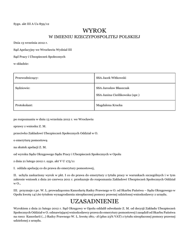 Sygn. akt III A Ua 859/12 WYROK W IMIENIU RZECZYPOSPOLITEJ POLSKIEJ Dnia 13 września 2012 r. Sąd Apelacyjny we Wrocławiu Wydział III Sąd Pracy i Ubezpieczeń Społecznych w składzie: Przewodniczący: SSA Jacek Witkowski Sędziowie: SSA Jarosław Błaszczak SSA Janina Cieślikowska (spr.) Protokolant: Magdalena Krucka po rozpoznaniu w dniu 13 września 2012 r. we Wrocławiu sprawy z wniosku Z. M. przeciwko Zakładowi Ubezpieczeń Społecznych Oddział w O. o emeryturę pomostową na skutek apelacji Z. M. od wyroku Sądu Okręgowego Sądu Pracy i Ubezpieczeń Społecznych w Opolu z dnia 21 lutego 2012 r. sygn. akt V U 175/11 I. oddala apelację co do prawa do emerytury pomostowej, II. uchyla zaskarżony wyrok w pkt. I co do prawa do emerytury z tytułu pracy w warunkach szczególnych i w tym zakresie wniosek z dnia 20 czerwca 2011 r. przekazuje do rozpoznania Zakładowi Ubezpieczeń Społecznych Oddział w O., III. przyznaje r.pr. W. L. prowadzącemu Kancelarię Radcy Prawnego w O. od Skarbu Państwa – Sądu Okręgowego w Opolu kwotę 147,60 tytułem wynagrodzenia nieopłaconej pomocy prawnej udzielonej wnioskodawcy z urzędu. UZASADNIENIE Wyrokiem z dnia 21 lutego 2012 r. Sąd Okręgowy w Opolu oddalił odwołanie Z. M. od decyzji Zakładu Ubezpieczeń Społecznych Oddział w O. odmawiającej wnioskodawcy prawa do emerytury pomostowej i zasądził od Skarbu Państwa na rzecz Kancelarii (...) Radcy Prawnego W. L. kwotę 180,- zł (plus 23% VAT) z tytułu nieopłaconej pomocy prawnej udzielonej z urzędu. Rozstrzygnięcie to Sąd oparł o następująco ustalony stan faktyczny: Wnioskodawca Z. M., ur. (...), ostatnio pracował zawodowo do 22 sierpnia 2007 r. w firmie (...) Sp. z o.o. w O.. Udowodnił ponad 32 lata 9 miesięcy i 19 dni okresów składkowych i 3 lata 2 miesiące i 22 dni okresów nieskładkowych, ukończył 60 lat w dniu 6 sierpnia 2010 r. Zakład Ubezpieczeń Społecznych Oddział w O. uznał wnioskodawcy okres pracy w szczególnych warunkach w wymiarze 4 lat 11 miesięcy i 6 dni. Z uwagi na nie spełnienie kryteriów ustawy o emeryturach pomostowych ZUS nie uznał wnioskodawcy okresów zatrudnienia: od 15 października 1979 r. do 30 czerwca 1980 r. i od 1 lipca 1985r. do 10 grudnia 1987r. w Hucie (...) w O. jako okresu pracy w szczególnych warunkach oraz od 4 marca 1991 r. do 31 lipca 1991 r. w (...) S.A. w J. jako pracy w szczególnych warunkach, a nadto okresu od 15 lutego 2001 r. do 22 sierpnia 2007 r. w (...) Sp. z o.o. w O. jako okresu pracy w warunkach szczególnych liczącego się do ustalania warunków do nabycia emerytury pomostowej. Wnioskodawca Z. M. w okresie pracy w (...)w O. w okresie od 15 lutego 2001 r. do 22 sierpnia 2007 r. wykonywał pracę na stanowisku - operator suwnicy manipulacyjno-transportowej. W okresie od 4 marca 1991 r. do 31 lipca 1991 r. w (...) SA w J. wnioskodawca zajmował stanowisko maszynisty maszyn do formowania szkła. W Hucie (...) Sp. z o.o. w O. w okresach: od 15 października 1979 r. do 30 czerwca 1980 r., od 25 czerwca 1992 r. do 30 listopada 1992 r. , od 23 maja 1983 r. do 19 września 1983 r., od 10 października 1983 r. do 30 czerwca 1985 r., od 1 lipca 1985 r. do 30 czerwca 1986 r., od 1 lipca 1986 r. do 5 listopada 1987 r., od 11 grudnia 1987 r. do 5 listopada 1990 r. pełnił pracę na stanowiskach takich, jak: przygotowywacz wkładów, wytapiacz, czadnicowy, oczyszczacz odlewów, operator suwnicy. H. P., K. C., W. B. i J. M. pracowali wraz z wnioskodawcą w Hucie (...). Wnioskodawca pracował jako wytapiacz, ładowacz oraz na czadnicy. W hali, w której pracował wnioskodawca były wysokie temperatury, zapylenie, pracownicy otrzymywali posiłki regeneracyjne oraz mleko. W tak ustalonym stanie faktycznym Sąd Okręgowy uznał odwołanie za nieuzasadnione. Apelację od wyroku Sądu Okręgowego złożył wnioskodawca, zarzucając naruszenie przepisów prawa procesowego – art. 233 § 1 w zw. z 328 kpc poprzez błędne ustalenie stanu faktycznego i wyprowadzenie z materiału dowodowego, tj. przedłożonych świadectw pracy oraz zeznań świadków, wniosków z niego nie wynikających, a nadto sprzecznych z zasadami logicznego rozumowania i doświadczenia życiowego, a mianowicie, że wnioskodawca pracował w warunkach szczególnych jedynie przez okres 4 lata 11 miesięcy i 22 dni, podczas gdy w warunkach szczególnych pracował co najmniej 8 lat 9 miesięcy i 16 dni. Ponadto wnioskodawca zarzucił naruszenie przepisów prawa materialnego, a mianowicie art. 4 pkt. 5 w związku z art. 49 pkt. 1-3 ustawy z dnia 19 grudnia 2008 r. o emeryturach pomostowych poprzez jego błędną wykładnię i przyjęcie, iż okres pracy pomiędzy 31 grudnia 1998 r. a 31 grudnia 2008 r. nie stanowi okresu pracy wykonywanej w warunkach szczególnych w rozumieniu art. 3 ust. 1-2 tejże ustawy, co miało istotny wpływ na odmowę przyznania emerytury pomostowej, art. 46 w zw. z art. 29 ust. 1 pkt 2 ustawy z dnia 17 grudnia 1998 r. o emeryturach i rentach z Funduszu Ubezpieczeń Społecznych poprzez błędną jego wykładnię i przyjęcie, iż przesłanka osiągnięcia wieku jest konieczna do nabycia prawa do emerytury z tytułu pracy w warunkach szczególnych. Wskazując na powyższe zarzuty skarżący wniósł o zmianę wyroku i przyznanie prawa do emerytury pomostowej w rozumieniu art. 4 pkt. 5 w związku z art. 49 pkt. 1-3 ustawy z dnia 19 grudnia 2008 r. o emeryturach pomostowych, ewentualnie o zmianę zaskarżonego wyroku i przyznanie wnioskodawcy prawa do emerytury w rozumieniu art. 46 w zw. z art. 29 ust. 1 pkt 2 ustawy z dnia 17 grudnia 1998 r. o emeryturach i rentach z Funduszu Ubezpieczeń Społecznych lub uchylenie wyroku i przekazanie sprawy do ponownego rozpoznania, jak również o zasądzenie kosztów zastępstwa procesowego . Sąd Apelacyjny zważył: Apelacja wnioskodawcy jest uzasadniona jedynie częściowo. Trafnie uznał bowiem Sąd Okręgowy, iż wnioskodawca nie spełnia przesłanek do uzyskania prawa do emerytury pomostowej