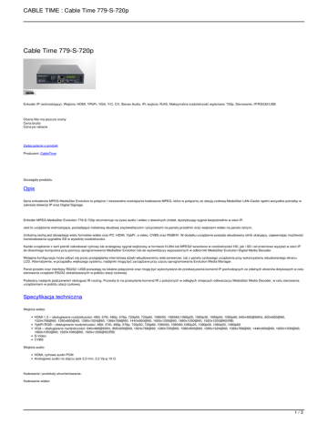 CABLE TIME : Cable Time 779-S-720p Cable Time 779-S-720p Enkoder IP (wolnostojący). Wejścia: HDMI, YPbPr, VGA, Y/C, CV, Stereo Audio, IR; wyjścia: RJ45, Maksymalna rozdzielczość wyjściowa: 720p. Sterowanie: IP/RS232/USB Ocena Nie ma jeszcze oceny Cena brutto Cena po rabacie Zadaj pytanie o produkt Producent: CableTime Szczegóły produktu Opis Seria enkoderów MPEG MediaStar Evolution to potężne i niezawodne rozwiązanie kodowania MPEG, które w połączniu ze stacją czołową MediaStar LAN-Caster spełni wszystkie potrzeby w zakresie telewizji IP oraz Digital Signage. Enkoder MPEG MediaStar Evolution 778-S-720p strumieniuje na żywo audio i wideo z dowolnych źródeł, dystrybuując sygnał bezpośrednio w sieci IP. Jest to urządzenie wolnostojące, posiadające metalową obudowę zwyświetlaczem i przyciskami na panelu przednim oraz wejściami wideo na panelu tylnym. Unikalną cechą jest akceptacja wielu formatów wideo oraz PC: HDMI, YpbPr, s-video, CVBS oraz RGBHV. W dodatku urządzenie posiada wbudowany silnik skalujący, zapewniając możliwość transkodowania sygnałów SD w wysokiej rozdzielczości. Każde urządzenie z serii potrafi zakodować cyfrowy lub analogowy sygnał wejściowy w formacie H.264 lub MPEG2 wzarówno w rozdzielczości HD, jak i SD i strumieniowo wysyłać w sieci IP do dowolnego komputera przy pomocy oprogramowania MediaStar Evolution lub do wyświetlaczy wyposażonych w odbiorniki MediaStar Evolution Digital Media Decoder. Wstępna konfiguracja może odbyć się przez przeglądarkę internetową dzięki wbudowanemu web-serwerowi, lub z panelu czołowego urządzenia przy wykorzystaniu wbudowanego ekranu LCD. Alternatywnie, w przypadku większego systemu, nadajniki mogą być zarządzane przy użyciu oprogramowania Evolution Media Manager. Panel przedni oraz interfejsy RS232 i USB pozwalają na lokalne połączenie oraz mogą być wykorzystane do przekazywania komend IP pochodzących ze zdalnych ekranów dotykowych w celu sterowania urządzeń RS232 zlokalizowanych w pobliżu stacji czołowej. Podwójny nadajnik podczerwieni obsługuej IR routing. Pozwala to na przesyłanie komend IR z położonych w odległych miejscach odtwarzaczy MediaStar Media Decoder, w celu sterowania urządzeniami w pobliżu stacji czołowej. Specyfikacja techniczna Wejścia wideo: HDMI 1.3 – obsługiwane rozdzielczości: 480i, 576i, 480p, 576p, 720p50, 720p60, 1080i50, 1080i60,1080p25, 1080p30, 1080p50, 1080p60, 640x480@60Hz, 800x600@60, 1024x768@60, 1280x800@60, 1280x1024@60, 1366x768@60, 1440x900@60, 1600x1200@60, 1680x1050@60, 1920x1200@60(RB) YpbPr/RGB – obsługiwane rozdzielczości: 480i, 576i, 480p, 576p, 720p50, 720p60, 1080i50, 1080i60,1080p25, 1080p30, 1080p50, 1080p60 VGA – obsługiwane rozdzielczości: 640x480@60Hz, 800x600@60, 1024x768@60, 1280x720@60, 1280x800@60, 1280x1024@60, 1366x768@60, 1440x900@60, 1600x1200@60, 1680x1050@60, 1920x1080@60, 1920x1200@60(RB) S-Video CVBS Wejścia audio: HDMI, cyfrowe audio PCM Analogowe audio na złączu jack 3,5 mm, 2,2 Vp-p 10 Ω Kodowanie i protokoły strumieniowania: Kodowanie wideo: 1/3 CABLE TIME : Cable Time 779-S-720p Kodowanie MPEG 4-10/H.264 MP@L4, CBR/VBR, od 1.5 Mbps do 12 Mbps Kodowanie MPEG-2 MP@ HL, CBR/VBR, od 1.5 Mbps do 15 Mbps Kodowanie audio: MPEG-1 Layer 2- 32, 44.1, próbkowanie 48 KHz, 64 - 448 Kbps Stereo AAC LC - 16, 32, 44.1, 48, 88.2, próbkowanie 96 KHz, 40 - 576 Kbps Stereo Strumienie wyjściowe: Multicast/Unicast UDP MPEG2-TS Multicast RTP strumienie audio i wideo (do użytku z Quicktime w serwerach RTSP) HLS - HTTP Live Streaming Rozdzielczości wideo: 480i, 576i, 720p50, 720p60 Sieć i interfejsy: LAN: RJ45 802.3 10/100/1000 Base-T Auto MDIX Adres IP statyczny lub DHCP DSCP stream tagging for QoS Prokotoły sieciowe: UDP, TCP, ARP, DHCP, ICMP, IGMP V2, HTTP, Telnet, SNMP, Syslog, SAP/SDP, SMTP, DSCP, HLS Interfejs USB: USB 2.0, typ A: port Hosta do aktualizacji oprogramowania USB 1.1, typ B: komendy szeregowe do konfiguracji zewnętrznej i sterowania Port RS232: Rx, Tx, CTS, RTS z prędkością do 115,200 bodów Nadajniki IR: 2 oddzielne wyjścia obsługujące formaty IR Sky, Sky+, SkyHD ze strony web lub aktywowane zdalnie przez IP Zdalne komendy IP generowane przez dowolny pilot IR skierowany na czujnik dekodera MediaStar Obsługa sygnałów IR 30 - 56 kHz Konfiguracja urządzenia: Przez Web serwer Przez panel przedni Przez program MediaStar Media Manager Interfejs sterujący: RS232, USB 1.1 Telnet do integracji z urządzeniami firm trzecich Zewnętrzny interfejs sterujący IP: Komendy/konfiguracja ASCII przez interfejs IP Komendy USB i RS232 Konfiguracja i monitoring: Ulepszenia: Możliwość modernizacji modeli z SD na HD lub HLS poprzez zakup i wpisanie odpowiedniego kodu odblokowującego – modernizacja bez koneiczności wymiany sprzętu Powiadomienia SAP: Wystem powiadomień SAP (Session Announcement Protocol) w strumieniu IP Monitoring temperatury: Dostęp do monitoringu temperatury urządzeń dostępny zdalnie przez interfejs sieciowy. Monitoring wydarzeń i statusu: Kluczowe funkcje raportowane przez SNMP lub Syslog do managera SNMP Automatyczne wysyłąnie e-maili z plikami log przez zewnętrzny serwer SMTP Powiadomienia na panelu przednim 2/3 CABLE TIME : Cable Time 779-S-720p INFORMACJE: Zasilanie: 3-pinowe IEC 100-240V AC Pobór mocy: 20 W Masa: 1,4 kg Wymiary: 191 x 225 x 44 mm Temperatura: 0 - 40°C Zgodność: FCC, CE, CB, TUV Dołączone akcesoria: Kabel zasilający Kabel Cat 5 Kabel HDMI, 1,5 m Kabel YpbPr, 1,5 m Kabel SVGA, 2 m Kabel jack 3,5 mm, 1 m Schemat systemu MediaStar Evolution 3/3 Powered by TCPDF (www.tcpdf.org)