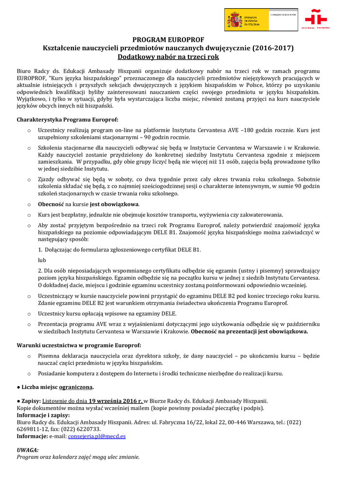 PROGRAM EUROPROF Kształcenie nauczycieli przedmiotów nauczanych dwujęzycznie (2016-2017) Dodatkowy nabór na trzeci rok Biuro Radcy ds. Edukacji Ambasady Hiszpanii organizuje dodatkowy nabór na trzeci rok w ramach programu EUROPROF, "Kurs języka hiszpańskiego" przeznaczonego dla nauczycieli przedmiotów niejęzykowych pracujących w aktualnie istniejących i przyszłych sekcjach dwujęzycznych z językiem hiszpańskim w Polsce, którzy po uzyskaniu odpowiednich kwalifikacji byliby zainteresowani nauczaniem części swojego przedmiotu w języku hiszpańskim. Wyjątkowo, i tylko w sytuacji, gdyby była wystarczająca liczba miejsc, również zostaną przyjęci na kurs nauczyciele języków obcych innych niż hiszpański. Charakterystyka Programu Europrof: o Uczestnicy realizują program on-line na platformie Instytutu Cervantesa AVE –180 godzin rocznie. Kurs jest uzupełniony szkoleniami stacjonarnymi – 90 godzin rocznie. o Szkolenia stacjonarne dla nauczycieli odbywać się będą w Instytucie Cervantesa w Warszawie i w Krakowie. Każdy nauczyciel zostanie przydzielony do konkretnej siedziby Instytutu Cervantesa zgodnie z miejscem zamieszkania. W przypadku, gdy obie grupy liczyć będą nie więcej niż 11 osób, zajęcia będą prowadzone tylko w jednej siedzibie Instytutu. o Zjazdy odbywać się będą w soboty, co dwa tygodnie przez cały okres trwania roku szkolnego. Sobotnie szkolenia składać się będą, z co najmniej sześciogodzinnej sesji o charakterze intensywnym, w sumie 90 godzin szkoleń stacjonarnych w czasie trwania roku szkolnego. o Obecność na kursie jest obowiązkowa. o Kurs jest bezpłatny, jednakże nie obejmuje kosztów transportu, wyżywienia czy zakwaterowania. o Aby zostać przyjętym bezpośrednio na trzeci rok Programu Europrof, należy potwierdzić znajomość języka hiszpańskiego na poziomie odpowiadającym DELE B1. Znajomość języka hiszpańskiego można zaświadczyć w następujący sposób: 1. Dołączając do formularza zgłoszeniowego certyfikat DELE B1. lub 2. Dla osób nieposiadających wspomnianego certyfikatu odbędzie się egzamin (ustny i pisemny) sprawdzający poziom języka hiszpańskiego. Egzamin odbędzie się na początku kursu w jednej z siedzib Instytutu Cervantesa. O dokładnej dacie, miejscu i godzinie egzaminu uczestnicy zostaną poinformowani odpowiednio wcześniej. o Uczestniczący w kursie nauczyciele powinni przystąpić do egzaminu DELE B2 pod koniec trzeciego roku kursu. Zdanie egzaminu DELE B2 jest warunkiem otrzymania świadectwa ukończenia Programu Europrof. o Uczestnicy kursu opłacają wpisowe na egzaminy DELE. o Prezentacja programu AVE wraz z wyjaśnieniami dotyczącymi jego użytkowania odbędzie się w październiku w siedzibach Instytutu Cervantesa w Warszawie i Krakowie. Obecność na prezentacji jest obowiązkowa. Warunki uczestnictwa w programie Europrof: o Pisemna deklaracja nauczyciela oraz dyrektora szkoły, że dany nauczyciel – po ukończeniu kursu – będzie nauczać części przedmiotu w języku hiszpańskim. o Posiadanie komputera z dostępem do Internetu i środki techniczne niezbędne do realizacji kursu. ● Liczba miejsc ograniczona. ● Zapisy: Listownie do dnia 19 września 2016 r. w Biurze Radcy ds. Edukacji Ambasady Hiszpanii. Kopie dokumentów można wysłać wcześniej mailem (kopie powinny posiadać pieczątkę i podpis). Informacje i zapisy: Biuro Radcy ds. Edukacji Ambasady Hiszpanii. Adres: ul. Fabryczna 16/22, lokal 22, 00-446 Warszawa, tel.: (022) 6269811-12, fax: (022) 6220733. Informacje: e-mail: [email protected] UWAGA: Program oraz kalendarz zajęć mogą ulec zmianie.