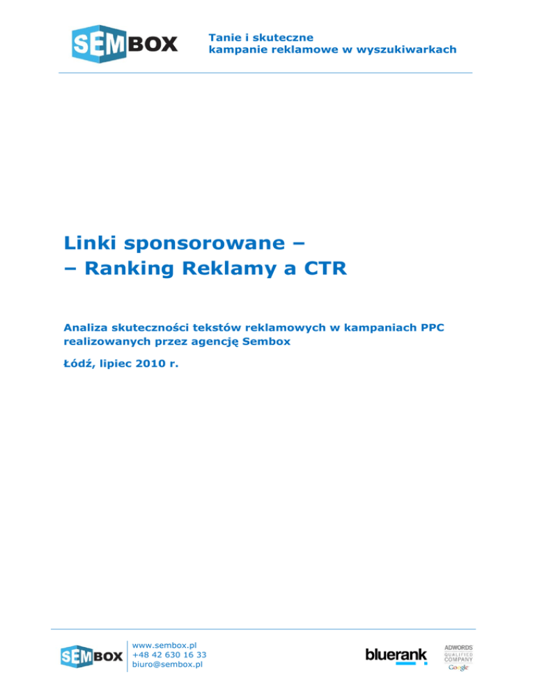 Tanie i skuteczne kampanie reklamowe w wyszukiwarkach Linki sponsorowane – – Ranking Reklamy a CTR Analiza skuteczności tekstów reklamowych w kampaniach PPC realizowanych przez agencję Sembox Łódź, lipiec 2010 r. www.sembox.pl +48 42 630 16 33 [email protected] Tanie i skuteczne kampanie reklamowe w wyszukiwarkach Zawartość dokumentu Najważniejsze wnioski ..................................................................................................... 3 Informacje o Sembox........................................................................................................ 6 Zależność CTR od rankingu reklamy .......................................................................... 7 Jak zmienia się CTR tekstu reklamowego?............................................................ 10 Jaki CTR może uzyskać link sponsorowany? ........................................................ 13 Metodologia badania ....................................................................................................... 15 www.sembox.pl +48 42 630 16 33 [email protected] Tanie i skuteczne kampanie reklamowe w wyszukiwarkach Najważniejsze wnioski Dokument zawiera podsumowanie wniosków płynących z analizy wyników osiąganych przez teksty reklamowe stosowane w kampaniach linków sponsorowanych klientów agencji Sembox. W szczególności, zbadana została zależność pomiędzy rankingiem reklamy a osiąganym współczynnikiem CTR, przy zachowaniu niezmienności innych parametrów kampanii. Szczegółowe informacje o metodologii badania zostały zaprezentowane na końcu niniejszego opracowania. Kluczowe wnioski płynące z przeprowadzonego badania: Istnieje znacząca zależność między współczynnikiem CTR a rankingiem reklamy dla tego samego tekstu reklamowego – średni współczynnik CTR dla pozycji 11 osiąga wartość ok. 1% i rośnie, by osiągnąć wartość maksymalną dla pozycji 1 równą ok. 8%. Skuteczność tekstu reklamowego na pozycjach 7 - 9 jest bardzo podobna (waha się w przedziale 1,5 – 2,2%), co można tłumaczyć jednakowo małą zauważalnością tekstu reklamowego na tle innych reklam. Skuteczność tekstu reklamowego w przedziale pozycji 1 - 6 silnie zależy od rankingu reklamy i widać wyraźne (od 0,5 do aż 2,5%) różnice w skuteczności między poszczególnymi pozycjami linku sponsorowanego. Rys.1. Zależność między średnim CTR a pozycją linku sponsorowanego. www.sembox.pl +48 42 630 16 33 [email protected] Tanie i skuteczne kampanie reklamowe w wyszukiwarkach Dla próby tekstów reklamowych o odpowiedniej ilości danych statystycznych dokonaliśmy bardziej szczegółowej analizy i stwierdziliśmy, że: Zmiana pozycji tekstu reklamowego z 111 na 10 (słupek nr 10 na wykresie poniżej) skutkuje relatywnym spadkiem skuteczności o 6,5% - jest to prawdopodobnie związane z przesunięciem tekstu reklamowego z ostatniej (a więc skrajnej) pozycji na miejsce środkowe – gorzej zauważalne. Zmiana pozycji na miejscach 8 i 9 (tj. z 9 na 8 i z 10 na 9) nie przynosi dużej zmiany CTR – z powodów wymienionych wcześniej. Zmiana pozycji tekstu reklamowego w przedziale 3 - 7 (tj. z 4 na 3, z 5 na 4, itd.) przynosi istotną zmianę współczynnika CTR – średnio o 33 39% - opłacalne może być konkurowanie o jak najwyższą pozycję w tym przedziale miejsc, co zaowocuje większą ilością kliknięć i wejść na stronę docelową kampanii. Zmiana pozycji tekstu reklamowego z 3 na 2 oraz z 2 na 1 (słupki nr 1 i 2 na wykresie poniżej) skutkuje stosunkowo małym wzrostem skuteczności – odpowiednio relatywnie o 17,3% i 8,2% - dowodzi to porównywalnej zauważalności reklam na czołowych miejscach. Rys.2. Względna procentowa zmiana CTR między sąsiednimi pozycjami dla tego samego tekstu reklamowego. 1 Analizie zostały poddane teksty reklamowe emitowane nad i po prawej stronie wyników wyszukiwania. Łączna maksymalna ilość emitowanych jednocześnie reklam wynosi zatem 11. www.sembox.pl +48 42 630 16 33 [email protected] Tanie i skuteczne kampanie reklamowe w wyszukiwarkach Odwracając ujęcie wniosków zaprezentowanych powyżej możemy stwierdzić, że: Przykładowy tekst reklamowy, osiągający skuteczność CTR = 1% na miejscu 11, może osiągnąć 7-krotnie większą skuteczność, gdy jest emitowany na miejscu 1 dla tych samych słów kluczowych – średni wzrost skuteczności dla wszystkich tekstów z badanej próby wyniósł 707,6%. Wzrost skuteczności może być tym większy, im bardziej skuteczne są teksty reklamowe – dla reklam o CTR znacznie większym od 1% na miejscu 11 stwierdzono możliwy nawet 9-krotny wzrost skuteczności dla emisji na miejscu 1. Rys.3. Symulacja CTR linku sponsorowanego dla tego samego tekstu reklamowego osiągającego CTR=1% na miejscu 11. www.sembox.pl +48 42 630 16 33 [email protected] Tanie i skuteczne kampanie reklamowe w wyszukiwarkach Informacje o Sembox Sembox Sp z o.o. to agencja SEM oferująca linki sponsorowane, która powstała w 2009 r. z inicjatywy Bluerank Sp. z o.o. – jednej z pierwszych polskich agencji search engine marketing, realizującej od 2005 r. projekty SEO i PPC dla znanych i cenionych marek w kraju i na świecie. Sembox specjalizuje się w planowaniu i prowadzeniu kampanii linków sponsorowanych dla mikro- i małych przedsiębiorstw w Polsce. Wsparcie merytoryczne zapewnia Bluerank. Informacje kontaktowe Sembox Sp. z o.o. ul. Wólczańska 53, 90-608 Łódź telefon: e-mail: WWW: (42) 630 16 33 [email protected] http://www.sembox.pl www.sembox.pl +48 42 630 16 33 [email protected] Tanie i skuteczne kampanie reklamowe w wyszukiwarkach Zależność CTR od rankingu reklamy Właściwie każdy, kto zajmuje się zarządzaniem kampaniami linków sponsorowanych wie doskonale, że pozycja tekstu reklamowego na stronie wyników wyszukiwania wpływa na skuteczność reklamy. Współczynnik CTR jest tym większy, im bardziej wyeksponowany (tj. im bliżej początku strony) jest link