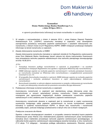Komunikat Domu Maklerskiego Banku Handlowego S.A. z dnia 28 lipca 2014 r. w sprawie przedstawienia informacji na temat rozrachunku w częściach 1. W związku z wprowadzeniem z dniem 4 sierpnia 2014 r. przez Krajowy Depozyt Papierów Wartościowych S.A. („KDPW”) rozrachunku transakcji w częściach, oraz obowiązkiem zaznajomienia posiadaczy rachunków papierów wartościowych z zasadami dokonywania ww. rozrachunku, o którym mowa w § 57 Regulaminu KDPW. DMBH niniejszym przekazuje niezbędne informacje na temat rozrachunku w częściach. 2. Zasady dokonywania rozrachunku w DMBH Zasady dokonywania rozrachunku transakcji w częściach określa § 31a Regulaminu wykonywania przez Dom Maklerski Banku Handlowego zleceń nabycia lub zbycia instrumentów finansowych oraz prowadzenia rachunku papierów wartościowych oraz rachunku pieniężnego obowiązującego od dnia 18.08.2014. „§ 31a 1. Transakcja Inwestora podlega rozrachunkowi w częściach, w przypadkach i na zasadach określonych w niniejszym Regulaminie oraz zgodnie z regulacjami Właściwej izby rozrachunkowej. 2. DMBH dokonuje zapisów na rachunku papierów wartościowych i rachunku pieniężnym Inwestora po rozrachunku transakcji we Właściwej izbie rozrachunkowej z uwzględnieniem postanowień zawartych w ust. 3-4. 3. W przypadku Rozrachunku transakcji w częściach, DMBH dokonuje zapisów na rachunku papierów wartościowych i rachunku pieniężnym Inwestora w części odpowiadającej dokonanemu rozrachunkowi. 4. Rozrachunek transakcji, w zakresie objętym zawieszeniem w związku z dokonaniem jej rozrachunku w części, jest dokonywany niezwłocznie po powstaniu warunków dla jego dokonania.” 3. Podstawowe informacje na temat rozrachunku w częściach Automatyczny rozrachunek w częściach jest standardową usługą oferowaną przez izby rozrachunkowe w ramach optymalizacji procesu rozrachunku. Celem wprowadzonego rozwiązania jest ograniczenie negatywnych skutków zawieszenia rozrachunku papierów wartościowych w dniu ustalenia praw do pożytków z papierów wartościowych. Automatyczny rozrachunek zlecenia w częściach jest to rozrachunek w części wyznaczonej wysokością dostępnego salda papierów wartościowych na koncie kontrpartnera zawartej transakcji w systemie rozrachunkowym KDPW, w danym dniu rozrachunku i rozrachunek pozostałej części, podczas kolejnego przetwarzania w danym dniu lub w dniach następnych. Praktyczne znaczenie dla Klienta Zgodnie z obecnie obowiązującymi zasadami, w przypadku zawarcia transakcji kupna papierów wartościowych przez Klienta oraz niedostarczenia papierów wartościowych przez kontrpartnera transakcji (biuro maklerskie prowadzące rachunek papierów wartościowych sprzedającego), w całkowitej liczbie papierów wartościowych odpowiadającej zawartej transakcji, w dniu rozrachunku (T+3 akcje; T+2 obligacje) - transakcja podlega całkowitemu zawieszeniu. Również, pomimo posiadania częściowego pokrycia w papierach wartościowych na koncie ewidencyjnym kontrpartnera w KDPW. W takim przypadku, nie dochodzi do przejścia prawa własności, a klient nie nabywa prawa do pożytków z papierów wartościowych (np. do dywidendy z nabytych akcji o ile dzień rozrachunku jest dniem ustalenia praw do dywidendy). Nowe rozwiązanie wprowadza automatyzm rozrachunku, dopuszczając możliwość rozrachunku częściowego, do wysokości dostępnego salda papierów wartościowych na koncie ewidencyjnym kontrpartnera transakcji, pozostawiając pozostała część zawieszoną. W tym przypadku Klient nabywa prawa do pożytków z papierów wartościowych z takiej liczby papierów wartościowych jaka była przedmiotem rozrachunku. 4. Treść § 57 Regulaminu KDPW „§ 57 1. Rozrachunek transakcji w części polega na: 1) przeniesieniu pomiędzy kontami ewidencyjnymi prowadzonymi w Krajowym Depozycie dla uczestników będących stronami rozrachunku, papierów wartościowych oznaczonych kodem wskazanym w zleceniu rozrachunku tej transakcji, w liczbie odpowiadającej liczbie tych papierów wartościowych dostępnych na koncie, na którym wystąpił brak pokrycia uniemożliwiający dokonanie jej rozrachunku, odpowiednio, w całości albo w części objętej uprzednim jego zawieszeniem, oraz, o ile jest on przeprowadzany także w zakresie świadczenia pieniężnego, 2) obciążeniu rachunku pieniężnego uczestnika będącego jedną stroną rozrachunku i uznaniu rachunku pieniężnego uczestnika będącego drugą stroną rozrachunku, kwotą równą, odpowiednio: a) tej części świadczenia pieniężnego określonego w zleceniu rozrachunku tej transakcji, która proporcjonalnie odpowiada liczbie papierów wartościowych przenoszonych pomiędzy kontami ewidencyjnymi tych uczestników w ramach danej części rozrachunku transakcji – jeżeli rozrachunek jest dokonywany na podstawie zlecenia rozrachunku, o którym mowa w § 51f, albo b) tej części świadczenia pieniężnego wynikającego z tej transakcji, która proporcjonalnie odpowiada liczbie papierów wartościowych przenoszonych pomiędzy kontami ewidencyjnymi tych uczestników w ramach danej części rozrachunku transakcji – jeżeli rozrachunek nie jest dokonywany na podstawie zlecenia rozrachunku, o którym mowa w § 51f, zaokrągloną do jednej, najniższej jednostki pieniężnej waluty, w której wyrażone jest to świadczenie, przy czym suma kwot ustalonych dla wszystkich części rozrachunku danej transakcji musi być równa wysokości świadczenia pieniężnego wynikającego z tej transakcji. 2. Rozrachunek transakcji, w zakresie objętym zawieszeniem w związku z dokonaniem jej rozrachunku w części, jest dokonywany niezwłocznie po powstaniu warunków dla jego dokonania. 3. Zarząd Krajowego Depozytu określa w drodze uchwały transakcje, które podlegają rozrachunkowi w częściach, oraz może określić w drodze uchwały minimalną wartość świadczenia pieniężnego określonego w zleceniu rozrachunku zawierającym dyspozyc