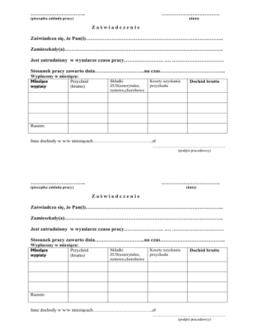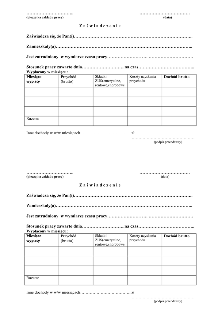 ………………………….. ……………………………. (pieczątka zakładu pracy) (data) Zaświadczenie Zaświadcza się, że Pan(i)…………………………………………………………………….. Zamieszkały(a)……………………………………………………………………………….. Jest zatrudniony w wymiarze czasu pracy………………….. …. ………………………… Stosunek pracy zawarto dnia………………………..na czas……………………………….. Wypłacony w miesiącu: Miesiące Przychód wypłaty (brutto) Składki ZUS(emerytalne, rentowe,chorobowe Koszty uzyskania przychodu Dochód brutto Razem: Inne dochody w w/w miesiącach………………………………..zł .……………………………………… (podpis pracodawcy) ………………………….. ……………………………. (pieczątka zakładu pracy) (data) Zaświadczenie Zaświadcza się, że Pan(i)…………………………………………………………………….. Zamieszkały(a)……………………………………………………………………………….. Jest zatrudniony w wymiarze czasu pracy………………….. …. ………………………… Stosunek pracy zawarto dnia………………………..na czas……………………………….. Wypłacony w miesiącu: Miesiące Przychód wypłaty (brutto) Składki ZUS(emerytalne, rentowe,chorobowe Koszty uzyskania przychodu Dochód brutto Razem: Inne dochody w w/w miesiącach………………………………..zł .……………………………………… (podpis pracodawcy)
