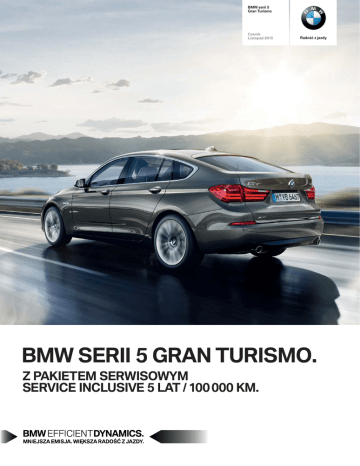 BMW serii Gran Turismo Cennik Listopad Radość z jazdy BMW SERII GRAN TURISMO. Z PAKIETEM SERWISOWYM SERVICE INCLUSIVE LAT / KM. SPIS TREŚCI Ceny BMW serii 5 Gran Turismo . . . . . . . . . . . . . . . . . . . . . . . . . . . . . . . 3 Wyposażenie standardowe . . . . . . . . . . . . . . . . . . . . . . . . . . . . . . . . . . . 4 Wyposażenie dodatkowe . . . . . . . . . . . . . . . . . . . . . . . . . . . . . . . . . . . . . 7 Bezpieczeństwo 7 Lakier 7 Stylistyka zewnętrzna 7 Pakiety wyposażenia dodatkowego 8 Koła / opony 10 Tapicerki 11 Stylistyka wnętrza 12 Zawieszenie 13 Skrzynia biegów 13 Systemy asystujące 14 Światła i oświetlenie 15 Fotele / komfort siedzeń Kierownice Kontrola klimatu Funkcjonalne wyposażenie zewnętrzne i wewnętrzne Radio / nawigacja Komunikacja oraz informacja Systemy HiFi oraz zestawy rozrywki Serwis 16 17 17 18 18 19 20 20 BMW ConnectedDrive . . . . . . . . . . . . . . . . . . . . . . . . . . . . . . . . . . . . . . 21 Service Inclusive . . . . . . . . . . . . . . . . . . . . . . . . . . . . . . . . . . . . . . . . . . 22 BMW Financial Services . . . . . . . . . . . . . . . . . . . . . . . . . . . . . . . . . . . . 23 2 wyposażenie standardowe wyposażenie dodatkowe za dopłatą CENY BMW SERII 5 GRAN TURISMO Model Układ skrzyni biegów Silnik Moc Układ /cylindry Pojemność Zużycie paliwa Emisja CO2** Cena netto wg normy ECE** (bez VAT) Cena brutto cm3 kW (KM) l / 100km g/km w PLN w PLN* 535i Gran Turismo 8-aut R6 / 2979 225 (306) 8,4 196 238 455 293 300 535i xDrive Gran Turismo 8-aut R6 / 2979 225 (306) 8,5 203 248 212 305 300 550i Gran Turismo 8-aut V8 / 4395 330 (450) 9,2 214 305 529 375 800 550i xDrive Gran Turismo 8-aut V8 / 4395 330 (450) 9,6 224 315 285 387 800 520d Gran Turismo 8-aut R4 / 1995 135 (184) 5,6 148 188 537 231 900 530d Gran Turismo 8-aut R6 / 2993 190 (258) 6,0 157 239 350 294 400 530d xDrive Gran Turismo 8-aut R6 / 2993 190 (258) 6,3 167 247 805 304 800 535d Gran Turismo 8-aut R6 / 2993 230 (313) 6,0 158 252 114 310 100 535d xDrive Gran Turismo 8-aut R6 / 2993 230 (313) 6,5 172 261 870 322 100 Data wydania cennika: 01.11.2015. * Powyższe ceny zawierają pakiet serwisowy Service Inclusive 5 lat / 100 000 km pokrywający koszty serwisowania samochodu oraz przeglądów, wliczając w to oryginalne części BMW, olej oraz robociznę. Pakiet obejmuje następujące czynności: wymiana oleju (bez uzupełniania), serwis/wymiana filtra powietrza, filtra przeciwpyłkowego, świec zapłonowych, płynu hamulcowego, kontrola pojazdu i przegląd standardowy zgodnie z książką serwisową. Więciej informacji na temat Service Inclusive oraz dodatkowych pakietów znajdą Państwo u Dealera BMW. W przypadku rezygnacji z pakietu cena samochodu będzie niższa o 1 744 PLN brutto dla modelu 520d Gran Turismo lub o 2 006 PLN brutto dla pozostałych wersji silnikowych. **Podstawą pomiaru zużycia paliwa jest cykl testowy wg normy ECE. Cykl ten składa się w ok. 1/3 z jazdy w mieście, a w 2/3 z jazdy poza terenem zabudowanym (w odniesieniu do pokonywanej odległości). Oprócz zużycia paliwa mierzona jest emisja CO2. Wyposażenie dodatkowe może zwiększyć tę wartość. Zużycie paliwa, emisja CO2 i klasa energetyczna zależą od wybranego rozmiaru kół i opon. Podane ceny są zalecanymi cenami detalicznymi, zawierającymi podatek VAT oraz podatek akcyzowy. Zalecane ceny detaliczne dotyczące wyposażenia dodatkowego są ważne jedynie, jeśli wyposażenie to zostanie zamówione jednocześnie z danym modelem pojazdu. Podane ceny samochodów obowiązują dla modeli w kolorach podstawowych, a lakiery metalizowane są dostępne za dopłatą. Powyższe ceny mogą ulec zmianom bez uprzedzenia w zależności od zmiany cen wprowadzonych przez producenta, jak również zmian w podatkach, opłatach i przepisach celnych. Przedstawione informacje są aktualne w chwili ukazania się niniejszej publikacji. BMW Vertriebs GmbH zastrzega sobie prawo do zmian w ofercie w każdej chwili i to zarówno w zakresie oferowanych modeli jak i ich budowy oraz wyposażenia. Niniejszy cennik nie stanowi oferty w rozumieniu prawa i publikowany jest jedynie dla celów informacyjnych bez żadnej odpowiedzialności. Informacji dotyczących dostępności prezentowanych modeli i wyposażenia, jak również aktualnych cen detalicznych prosimy zasięgnąć u Dealera BMW. 3 535i 535i xDrive 550i 550i xDrive 520d 530d 530d xDrive 535d 535d xDrive WYPOSAŻENIE STANDARDOWE Pakiet serwisowy Service Inclusive Pakiet serwisowy Service Inclusive 5 lat / 100 000 km, pokrywa koszty serwisowania oraz robociznę Bezpieczeństwo Intelligent Emergency Calling (Inteligentne Połączenie Alarmowe) Poduszki powietrzne dla kierowcy i pasażera System zapobiegający blokowaniu się kół podczas hamowania (ABS) Asystent hamowania Czujnik kolizji Dwutonowy klakson Układ dynamicznej stabilizacji toru jazdy (DSC) Tryb dynamicznej kontroli trakcji (DTC) Poduszki powietrzne chroniące głowę z przodu i z tyłu Boczne poduszki powietrzne dla kierowcy i pasażera z przodu Czujnik ciśnienia powietrza w oponach Wzmocnienia boczne Trójkąt ostrzegawczy Lakier i stylistyka zewnętrzna Lakier niemetalizowany (Czarny) Lusterka zewnętrzne, podgrzewane, asferyczne, elektrycznie regulowane Elementy zewnętrzne w kolorze karoserii Chromowane obramowania szyb bocznych Atrapa chłodnicy z chromowanym obramowaniem Oznaczenie modelu: emblemat GT z lewej strony klapy bagażnika, oznaczenie modelu z prawej Dwuczęściowa klapa bagażnika Koła / opony Obręcze kół ze stopu lekkiego Double Spoke 234, 18 cali Obręcze kół ze stopu lekkiego Star Spoke 272 z ogumieniem mieszanym, 19 cali Opony z funkcją jazdy awaryjnej Runflat Śruby zabezpieczające przed kradzieżą Tapicerka i stylistyka wnętrza Skóra Dakota Listwy ozdobne drewno szlachetne jesion słojowany 4 Listwy ozdobne satynowo srebrne mat Progi drzwiowe 535i 535i xDrive 550i 550i xDrive 520d 530d 530d xDrive 535d 535d xDrive Technologia TeleSer