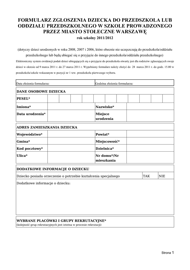 FORMULARZ ZGŁOSZENIA DZIECKA DO PRZEDSZKOLA LUB ODDZIAŁU PRZEDSZKOLNEGO W SZKOLE PROWADZONEGO PRZEZ MIASTO STOŁECZNE WARSZAWĘ rok szkolny 2011/2012 (dotyczy dzieci urodzonych w roku 2008, 2007 i 2006, które obecnie nie uczęszczają do przedszkola/oddziału przedszkolnego lub będą ubiegać się o przyjęcie do innego przedszkola/oddziału przedszkolnego) Elektroniczny system ewidencji podań dzieci ubiegających się o przyjęcie do przedszkola otwarty jest dla rodziców zgłaszających swoje dzieci w okresie od 9 marca 2011 r. do 27 marca 2011 r. Wypełniony formularz należy złożyć do 28 marca 2011 r. do godz. 15.00 w przedszkolu/szkole wskazanym w pozycji nr 1 tzw. przedszkolu pierwszego wyboru. Data złożenia formularza: Godzina złożenia formularza: DANE OSOBOWE DZIECKA PESEL* Imiona* Nazwisko* Data urodzenia* Miejsce urodzenia ADRES ZAMIESZKANIA DZIECKA Województwo* Powiat* Gmina* Miejscowość* Kod pocztowy* Dzielnica* Ulica* Nr domu*/Nr mieszkania DODATKOWE INFORMACJE O DZIECKU Dziecko posiada orzeczenie o potrzebie kształcenia specjalnego TAK NIE Dodatkowe informacje o dziecku: WYBRANE PLACÓWKI I GRUPY REKRUTACYJNE* (kolejność grup rekrutacyjnych jest istotna w procesie rekrutacji) Strona 1 LP Placówka Grupa rekrutacyjna 1. 2. 3. 4. 5. 6. 7. 8. 9. 10. DANE OSOBOWE MATKI/OPIEKUNKI PRAWNEJ Opiekun Jest rodzicem (niepotrzebne skreślić) Jest opiekunem prawnym Imiona* Nie udzielił informacji Nie żyje Nieznany Nie żyje Nieznany Nazwisko* ADRES ZAMIESZKANIA MATKI/OPIEKUNKI PRAWNEJ Województwo* Powiat* Gmina* Miejscowość* Kod pocztowy* Ulica* Nr domu*/Nr mieszkania DANE KONTAKTOWE MATKI/OPIEKUNKI PRAWNEJ Telefon* Adres e-mail** DANE OSOBOWE OJCA/OPIEKUNA PRAWNEGO Opiekun (niepotrzebne skreślić) Imiona* Jest rodzicem Jest opiekunem prawnym Nie udzielił informacji Nazwisko* Strona 2 ADRES ZAMIESZKANIA OJCA/OPIEKUNA PRAWNEGO Województwo* Powiat* Gmina* Miejscowość* Kod pocztowy* Ulica* Nr domu*/Nr mieszkania DANE KONTAKTOWE OJCA/OPIEKUNA PRAWNEGO Telefon* Adres e-mail** KRYTERIA PRZYJĘĆ (proszę zakreślić odpowiednio TAK lub NIE) Kryteria podstawowe 1 Dzieci matek lub ojców samotnie je wychowujących TAK NIE 2 Dzieci matek lub ojców, wobec których orzeczono znaczny lub umiarkowany stopień niepełnosprawności bądź całkowitą niezdolność do pracy oraz niezdolność do samodzielnej egzystencji TAK NIE 3 Dzieci umieszczone w rodzinach zastępczych TAK NIE TAK NIE Kryteria lokalne 4 Dziecko, u którego stwierdzono alergię pokarmową potwierdzoną zaświadczeniem lekarza specjalisty - dotyczy przedszkoli przygotowujących żywienie dzieci w oparciu o indywidualne zalecenia lekarskie Kryteria dodatkowe 5 Status rodziców Dziecko, którego oboje rodzice/prawni opiekunowie pracują lub studiują w trybie dziennym Należy wybrać jedną opcję TAK NIE Dziecko wychowywane przez samotnego, pracującego rodzica lub TAK opiekuna prawnego NIE Dziecko, którego jedno z dwojga rodziców/prawnych opiekunów pracuje TAK NIE 6 Dziecko z placówki opiekuńczo-wychowawczej oraz dzieci wychowujące TAK się w rodzinach objętych nadzorem kuratorskim NIE 7 Dziecko, które ma rodzeństwo z orzeczonym średnim lub znacznym stopniem niepełnosprawności NIE TAK Strona 3 8 Dziecko, którego rodzeństwo ubiega się jednocześnie po raz pierwszy o TAK przyjęcie do tego samego przedszkola NIE 9 Dziecko posiadające dwoje i więcej rodzeństwa poniżej 14 roku życia TAK NIE TAK NIE 1. Kryteria dodatkowe 1 Dziecko, którego rodzeństwo kontynuuje w roku szkolnym 2011/2012 edukację w przedszkolu pierwszego wyboru * oznaczone pola wymagane** adres email jest wykorzystywany do przesłania nowego hasła w przypadku zgubienia Sposób dokumentowania spełniania kryteriów podstawowych: Za osobę samotnie wychowującą dziecko uważa się jednego z rodziców albo opiekuna prawnego stanu wolnego, osobę pozostającą w separacji orzeczonej prawomocnym wyrokiem sądu, osobę rozwiedzioną, chyba że wychowuje wspólnie co najmniej jedno dziecko z jego rodzicem. Za osobę samotnie wychowującą dziecko uważa się także osobę pozostającą w związku małżeńskim, jeżeli jej małżonek został pozbawiony praw rodzicielskich lub odbywa karę pozbawienia wolności. Dla "dziecka samotnej matki lub ojca" potwierdzeniem jest jeden z dokumentów: - zaświadczenie z Urzędu Stanu Cywilnego potwierdzające aktualny stan cywilny (np. zupełny odpis aktu urodzenia dziecka, skrócony odpis aktu małżeństwa z adnotacją o rozwodzie) lub inne dokumenty potwierdzające stan cywilny, - wyrok sądu rodzinnego o pozbawieniu praw rodzicielskich lub separacji, - zaświadczenie z Zakładu Karnego o odbywaniu kary pozbawienia wolności. - oświadczenie rodzica o samotnym wychowywaniu dziecka. Dla "dziecka rodzica, wobec którego orzeczono znaczny lub umiarkowany stopień niepełnosprawności bądź całkowitą niezdolność do pracy oraz niezdolność do samodzielnej egzystencji" potwierdzeniem jest jeden z dokumentów: - orzeczenie o znacznym lub umiarkowanym stopniu niepełnosprawności wydane przez Miejski Zespół do Spraw Orzekania o Niepełnosprawności, - orzeczenie o całkowitej niezdolności do pracy lub orzeczenie o niezdolności do samodzielnej egzystencji wydane przez Zakład Ubezpieczeń Społecznych. - orzeczenie o uznaniu I lub II grupy inwalidzkiej wydane przez Komisję Lekarską do Spraw Inwalidztwa i Zatrudnienia ZUS przed dniem 1 września 1997 r. - orzeczenie o całkowitej niezdolność do pracy w gospodarstwie rolnym i niezdolności do samodzielnej egzystencji wydane przez Kasę Rolniczego Ubezpieczenia Społecznego, - orzeczenie o uznaniu I lub II grupy inwalidzkiej wydane przez Wojskową Komisję Lekarską (żołnierze) albo komisję lekarską podległą ministrowi właściwemu do spraw wewnętrznych. Dla "dziecka umieszczonego w rodzinie zastępczej" potwierdzeniem jest jeden z dokumentów: - postanowienie sądu o umieszczeniu dziecka w rodzinie zastępczej, - zaświadczeni