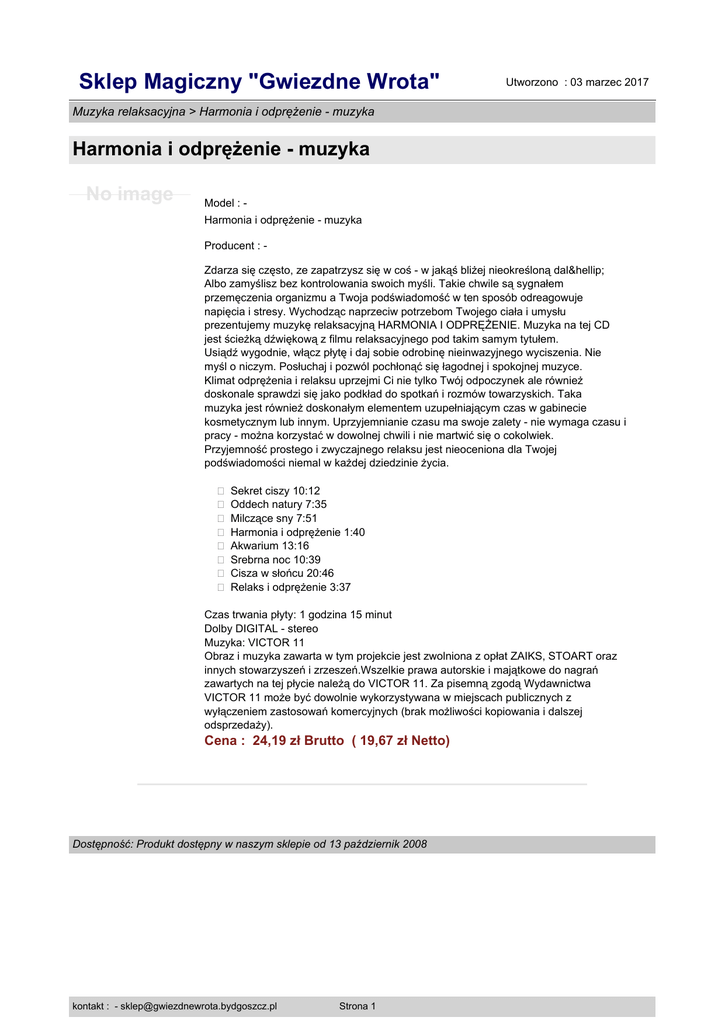 Sklep Magiczny "Gwiezdne Wrota" Utworzono : 03 marzec 2017 Muzyka relaksacyjna > Harmonia i odprężenie - muzyka Harmonia i odprężenie - muzyka No image Model : Harmonia i odprężenie - muzyka Producent : Zdarza się często, ze zapatrzysz się w coś - w jakąś bliżej nieokreśloną dal… Albo zamyślisz bez kontrolowania swoich myśli. Takie chwile są sygnałem przemęczenia organizmu a Twoja podświadomość w ten sposób odreagowuje napięcia i stresy. Wychodząc naprzeciw potrzebom Twojego ciała i umysłu prezentujemy muzykę relaksacyjną HARMONIA I ODPRĘŻENIE. Muzyka na tej CD jest ścieżką dźwiękową z filmu relaksacyjnego pod takim samym tytułem. Usiądź wygodnie, włącz płytę i daj sobie odrobinę nieinwazyjnego wyciszenia. Nie myśl o niczym. Posłuchaj i pozwól pochłonąć się łagodnej i spokojnej muzyce. Klimat odprężenia i relaksu uprzejmi Ci nie tylko Twój odpoczynek ale również doskonale sprawdzi się jako podkład do spotkań i rozmów towarzyskich. Taka muzyka jest również doskonałym elementem uzupełniającym czas w gabinecie kosmetycznym lub innym. Uprzyjemnianie czasu ma swoje zalety - nie wymaga czasu i pracy - można korzystać w dowolnej chwili i nie martwić się o cokolwiek. Przyjemność prostego i zwyczajnego relaksu jest nieoceniona dla Twojej podświadomości niemal w każdej dziedzinie życia. � Sekret ciszy 10:12 � Oddech natury 7:35 � Milczące sny 7:51 � Harmonia i odprężenie 1:40 � Akwarium 13:16 � Srebrna noc 10:39 � Cisza w słońcu 20:46 � Relaks i odprężenie 3:37 Czas trwania płyty: 1 godzina 15 minut Dolby DIGITAL - stereo Muzyka: VICTOR 11 Obraz i muzyka zawarta w tym projekcie jest zwolniona z opłat ZAIKS, STOART oraz innych stowarzyszeń i zrzeszeń.Wszelkie prawa autorskie i majątkowe do nagrań zawartych na tej płycie należą do VICTOR 11. Za pisemną zgodą Wydawnictwa VICTOR 11 może być dowolnie wykorzystywana w miejscach publicznych z wyłączeniem zastosowań komercyjnych (brak możliwości kopiowania i dalszej odsprzedaży). Cena : 24,19 zł Brutto ( 19,67 zł Netto) Dostępność: Produkt dostępny w naszym sklepie od 13 październik 2008 kontakt : - [email protected] Strona 1