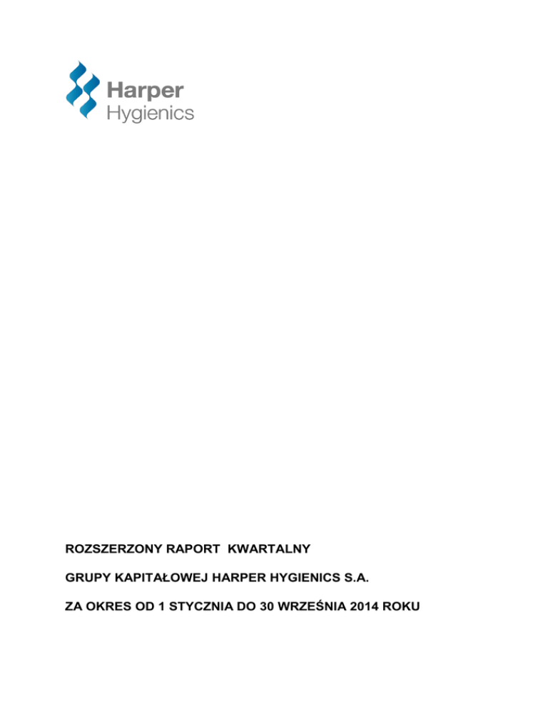 ROZSZERZONY RAPORT KWARTALNY GRUPY KAPITAŁOWEJ HARPER HYGIENICS S.A. ZA OKRES OD 1 STYCZNIA DO 30 WRZEŚNIA 2014 ROKU SPIS TREŚCI 1. OPIS ISTOTNYCH DOKONAŃ LUB NIEPOWODZEŃ GRUPY KAPITAŁOWEJ HARPER HYGIENICS S.A. WRAZ ZE WSKAZANIEM NAJWAŻNIEJSZYCH ZDARZEŃ W OKRESIE 1.01.–30.09.2014 .....................................................................................................3 2. PODSUMOWANIE SYTUACJI FINANSOWEJ GRUPY KAPITAŁOWEJ HARPER HYGIENICS S.A. ......................................................................................................................4 2.1. Wybrane dane finansowe, zawierające podstawowe pozycje skróconego skonsolidowanego i jednostkowego sprawozdania finansowego (również przeliczone na euro) przedstawiające dane narastająco za trzy kwartały danego i poprzedniego roku obrotowego, a w przypadku sprawozdania z sytuacji finansowej – na koniec bieżącego kwartału i koniec poprzedniego roku obrotowego .....................................................................4 3. POZOSTAŁE INFORMACJE ...................................................................................................6 3.1. Opis organizacji Grupy Kapitałowej Harper Hygienics ze wskazaniem jednostek podlegających konsolidacji........................................................................................................6 3.2. Wskazanie skutków zmian w strukturze Grupy Kapitałowej Harper Hygienics w wyniku połączenia, przejęcia lub sprzedaży jednostek Grupy, inwestycji długoterminowych, podziału, restrukturyzacji i zaniechania działalności .................................................................6 3.3. Stanowisko Zarządu odnośnie możliwości zrealizowania wcześniej publikowanych prognoz wyników na 2014 rok ..................................................................................................7 3.4. Wskazanie akcjonariuszy posiadających bezpośrednio lub pośrednio przez podmioty zależne co najmniej 5% ogólnej liczby głosów na walnym zgromadzeniu Spółki na dzień przekazania raportu kwartalnego wraz ze wskazaniem liczby posiadanych przez te podmioty akcji, ich procentowego udziału w kapitale zakładowym, liczby głosów z nich wynikających i ich procentowego udziału w ogólnej liczbie głosów na walnym zgromadzeniu oraz wskazanie zmian w strukturze własności znacznych pakietów akcji Spółki w okresie od przekazania poprzedniego raportu kwartalnego .......................................7 3.5. Zestawienie stanu posiadania akcji Harper Hygienics S.A. lub uprawnień do nich przez osoby zarządzające i nadzorujące Spółkę na dzień przekazania raportu, wraz ze wskazaniem zmian w stanie posiadania, w okresie od przekazania ostatniego raportu okresowego ...............................................................................................................................7 3.6. Wskazanie postępowań toczących się przed sądem, organem właściwym dla postępowania arbitrażowego lub organem administracji publicznej .........................................7 3.7. Informacje o zawarciu przez emitenta lub jednostkę od niego zależną jednej lub wielu transakcji z podmiotami powiązanymi, jeżeli pojedynczo lub łącznie są one istotne i zostały zawarte na innych warunkach niż rynkowe ...............................................................................9 3.8. Informacje o udzielonych poręczeniach kredytu lub pożyczki oraz udzielonych gwarancjach ..................................................................................................................................................9 3.9. Inne informacje, które zdaniem Harper Hygienics S.A. są istotne dla oceny sytuacji kadrowej, majątkowej, finansowej, wyniku finansowego i ich zmian, oraz informacje, które są istotne dla oceny możliwości realizacji zobowiązań przez Grupę Kapitałową Harper Hygienics S.A. ...........................................................................................................................9 3.10. Wskazanie czynników, które w ocenie Harper Hygienics S.A. oraz jej Grupy Kapitałowej będą miały wpływ na osiągnięte przez nich wyniki w perspektywie co najmniej kolejnego kwartału .................................................................................................................................. 11 Rozszerzony raport kwartalny Grupy Kapitałowej Harper Hygienics S.A. za okres1.01.-30.09.2014 2/12 1. OPIS ISTOTNYCH DOKONAŃ LUB NIEPOWODZEŃ GRUPY KAPITAŁOWEJ HARPER HYGIENICS S.A. WRAZ ZE WSKAZANIEM NAJWAŻNIEJSZYCH ZDARZEŃ W OKRESIE 1.01.–30.09.2014 Grupa Kapitałowa zamknęła trzeci kwartał wynikiem ogólnie lepszym niż trzeci kwartał ubiegłego roku oraz znacząco lepszym w porównaniu do wcześniejszych kwartałów bieżącego roku. W szczególności należy zwrócić uwagę na dynamikę przychodów, które w trzecim kwartale były jedynie nieznacznie niższe (-3,5%) niż przed rokiem oraz znacząco lepsze w porównaniu do rocznej dynamiki przychodów w pierwszym półroczu (-7,5%). Na poziomie zysku operacyjnego Grupa wypracowała 15% dynamiki w stosunku do ubiegłego roku. Ważna w wynikach trzeciego kwartału była również dynamika sprzedaży eksportowej, która osiągnęła 40% całości sprzedaży, co jest historycznie najwyższym wynikiem. Wysoka dynamika eksportu jest dla Grupy Kapitałowej istotnym czynnikiem wzrostu, zwłaszcza w odniesieniu do bardzo wysokiej oraz stale umacniającej się pozycji na rynku polskim. Warto w tym miejscu zwrócić uwagę, że udziały rynkowe Grupy w Polsce w okresie trzeciego kwartału, również osiągnęły jedne z najwyższych notowań w ostatnich latach. W obszarze zagadnień komercyjnych należy zwrócić uwagę na trudna sytuację na rynkach Ukrainy i Rosji. Grupa stara się równoważyć trudności wynikające z ogólnej sytuacji politycznej na tych rynkach, które szczególnie odbijają się na stronie p
