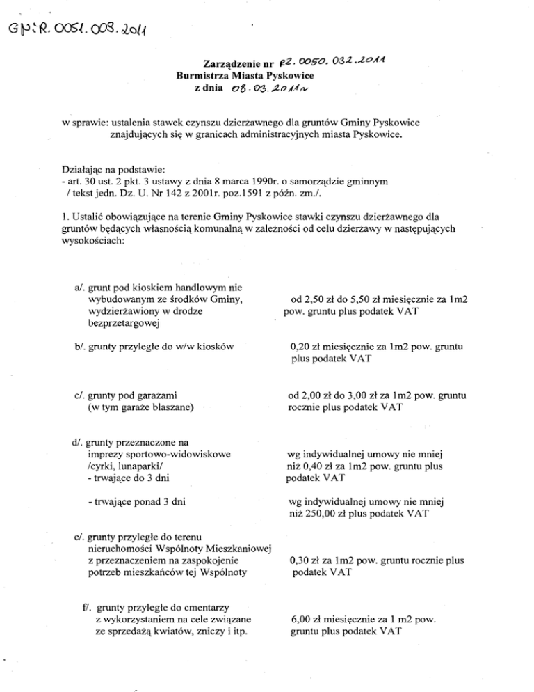 Zarzqdzenie nr e Z . ~ 5 0s2 0 *LoAA ~ Burmistrza Miasta Pyskowice z dnia 0 8 . 0 3 .;Zn//.Ap w sprawie: ustalenia stawek czynszu dzierzawnego dla gruntow Gminy Pyskowice znajdujqcych siq w granicach administracyjnych miasta Pyskowice. Dzialajqc na podstawie: - art. 30 ust. 2 pkt. 3 ustawy z dnia 8 marca 1990r. o samorzqdzie gminnym I tekst jedn. Dz. U. Nr 142 z 200 1r. poz. 1591 z poin. zm.1. 1. UstaliC obowiqujqce na terenie Gminy Pyskowice stawki czynszu dzierzawnego dla gruntow bqdqcych wlasnoSciq komunalnq w zaleznoSci od celu dzierzawy w nastqpujqcych wysokoSciach: a/. grunt pod kioskiem handlowym nie wybudowanym ze Srodkow Gminy, wydzierzawiony w drodze bezprzetargowej od 2,50 zl do 5,50 zl miesiqcznie za lm2 pow. gruntu plus podatek VAT bl. grunty przylegle do wlw kioskow 0,20 zl miesiqcznie za lm2 pow. gruntu plus podatek VAT cl. grunty pod garazami (w tym garaze blaszane) od 2,00 zl do 3,00 zl za lm2 pow. gruntu rocznie plus podatek VAT dl. grunty przeznaczone na imprezy sportowo-widowiskowe Icyrki, lunaparkil - tnvajqce do 3 dni wg indywidualnej umowy nie rnniej niz 0,40 zl za lm2 pow. gruntu plus podatek VAT - tnvajqce ponad 3 dni el. grunty przylegle do terenu nieruchomoSci Wspolnoty Mieszkaniowej z przeznaczeniem na zaspokojenie potrzeb mieszkancow tej Wspolnoty fl. grunty przylegle do cmentarzy z wykorzystaniem na cele zwiqzane ze sprzedazq kwiatow, zniczy i itp. wg indywidualnej umowy nie mniej niz 250,OO zl plus podatek VAT 0,30 zl za lm2 pow. gruntu rocznie plus podatek VAT 6,00 zl miesiqcznie za 1 m2 pow. gruntu plus podatek VAT - dzierzawa na okres do 3 dni w okresie ,,Wszystkich ~ w i ~ t ~ c h " g/. grunty pod letnie kawiarenki wg indywidualnej umowy nie mniej niz 100,OO zl plus podatek VAT. 7,00 zl miesiecznie za lm2 pow. gruntu plus podatek VAT h/. grunty pod lokalizacje tablic reklamowych 7,00 zl miesiecznie za lm2 pow. gruntu plus podatek VAT it. grunty pod parkingi 0,50 zl miesiecznie za lm2 pow. gruntu plus podatek VAT j/. grunty pod obiektami stacji transformatorowych 2,00 zl miesiecznie za lm2 pow. gruntu plus podatek VAT k/. grunty pod lokalizacjq kontener6w 5,00 zl rocznie za lm2 pow. gruntu plus podatek VAT na Smieci 11. grunty, na kt6rych usytuowane sq przyzagrodowe oczyszczalnie Sciek6w 0,50 zl rocznie za 1m2 pow. gruntu plus podatek VAT I/. grunty na poprawq zagospodarowania 1,00 zl rocznie za lm2 pow. gruntu nieruchomoSci przyleglej ( za wyjqtkiem plus podatek VAT grunt6w wykorzystywanych w zwiqzku z prowadzeniem dzialalnoSci gospodarczej). m/. grunty albo grunty i budynki wykorzystywane do prowadzenia dzialalnogci gospodarczej : - stawka 7,00 zl miesiqcznie za lm2 powierzchni uiytkowej budynku plus podatek VAT - stawka 1,00 zl miesiqcznie za lm2 powierzchni gruntu plus podatek VAT. n/. grunty i budynki gospodarcze, na ktorych nie jest prowadzona dzialalnoSC gospodarcza: - stawka 0,50 zl miesiqcznie za lm2 powierzchni uiytkowej budynku plus podatek VAT - stawka 0,10 zl miesiecznie za 1m2 powierzchni gruntu plus podatek VAT. o/.grunty zajete w celu wykonania prac budowlanych lub remontowych 1,00 zl miesiecznie za lm2 gruntu plus podatek VAT p/. grunty zabudowane obiektami sportowymi lub wykorzystywane na cele sportoworekreacyjne (hala widowiskowo-sportowa, stadion sportowy, boiska sportowe, korty tenisowe, itp.) - stawka 100,OO zl rocznie za danq nieruchomoSC plus podatek VAT r/. grunty, na ktorych polozone sq stawy rybne wykorzystywane do hodowli ryb w celu rekreacyjno-wypoczynkowym: - stawka 100,OO zl rocznie za kazdy 1 ha powierzchni lustra wody i 10,OO zl rocznie za kazde rozpoczete 10 arow powierzchni lustra wody plus podatek VAT oraz 0,10 zl rocznie za 1m2 gruntu przyleglego plus podatek VAT. 2. Roczny czynsz dzierzawny za grunty rolne uzytkowane na cele rolnicze: - do 200m2 - 0,15 zl za lm2 - powyzej 200 do 500 m2 - 0,lO zl za l,m2 - powyzej 500 do 1000 m2 - 0,05 zl za lm2 - powyzej 1000 do 2000 m2 - 0,03 zl za lm2 - powyzej 2000 do 5000 m2 - 0,01 zl za lm2 a/. dla gruntow rolnych powyzej 5000 m2 czynsz wynosi: dla strefj polnocnej - 90,OO zl za 1 ha (obreb Pyskowice) dla strefj poludniowej - 60,OO zl za 1 ha (obreb Dzierzno, Mikuszowina) b/. dla uzytk6w zielonych powyzej 5000 m2 czynsz wynosi: dla strefj polnocnej - 70 zl za 1 ha (obrqb Pyskowice) dla strefj poludniowej - 40 zl za 1 ha (obreb Dzierzno, Mikuszowina) 3. Czynsz dzieriawny okreSlony w dacie zawierania umowy obowiqzuje przez c a b okres na jaki zawarta jest umowa jednak nie dluzej niz 3 lata. 4. Za grunty rolne uwaza sic grunty wykorzystywane na cele rolne, niezaleznie od zapis6w w ewidencji gruntow. 5. W przypadku wylonienia dzierzawcy w drodze przetargu, czynsz dzierzawny ustalany jest w wysokoSci osiqgniqtej w przetargu, z tym ze czynsz ustalony wedlug niniejszego zarzqdzenia stanowi kwote wywolawcz% od kt6rej oferenci rozpoczynajq przetarg na dzierzawe. 6. W przypadku dzierzawy gruntow, gdy cel dzierzawy nie jest objety dyspozycjq punktu 1, stawke czynszu ustala Burmistrz Miasta. W szczeg6lnie uzasadnionych przypadkach Burmistrz Miasta ma prawo okreSliC stawkq czynszu dzierzawnego ponizej wartoSci wskazanych w pkt. 1. 7. UchyliC Zarzqdzenie Burmistrza Miasta Pyskowice Nr RZ015 1-GNiR/75/07 z dnia 11.04.2007r.w sprawie ustalenia stawek czynszu dzierzawnego dla gmntow Gminy Pyskowice znajdujqcych siq w granicach administracyjnych miasta Pyskowice, oraz Zarzqdzenie Burmistrza Miasta Pyskowice nr RZ0 151-GNiR/60/08 z dnia 24.04.2008r. w sprawie zmiany zarzqdzenia nr RZ0 15 1-GNiR/75/07 Burmistrza Miasta Pyskowice z dnia 11.04.2007r. w sprawie ustalenia stawek czynszu dzierzawnego dla gruntdw Gminy Pyskowice znajdujqcych siq w granicach administracyjnych miasta Pyskowice. 0 ,. 'i; 0 .. .s 8. Wykonanie Zarzqdzenia powierza siq Naczelnikowi Wydzialu Gospodarki 3 NieruchomoSciami i Rolnictwa. arzqdzenie wchodzi w zycie z dniem 1 czenvca 201 1r. jT.JP:,BII'lP.* I ' Z MIASTA