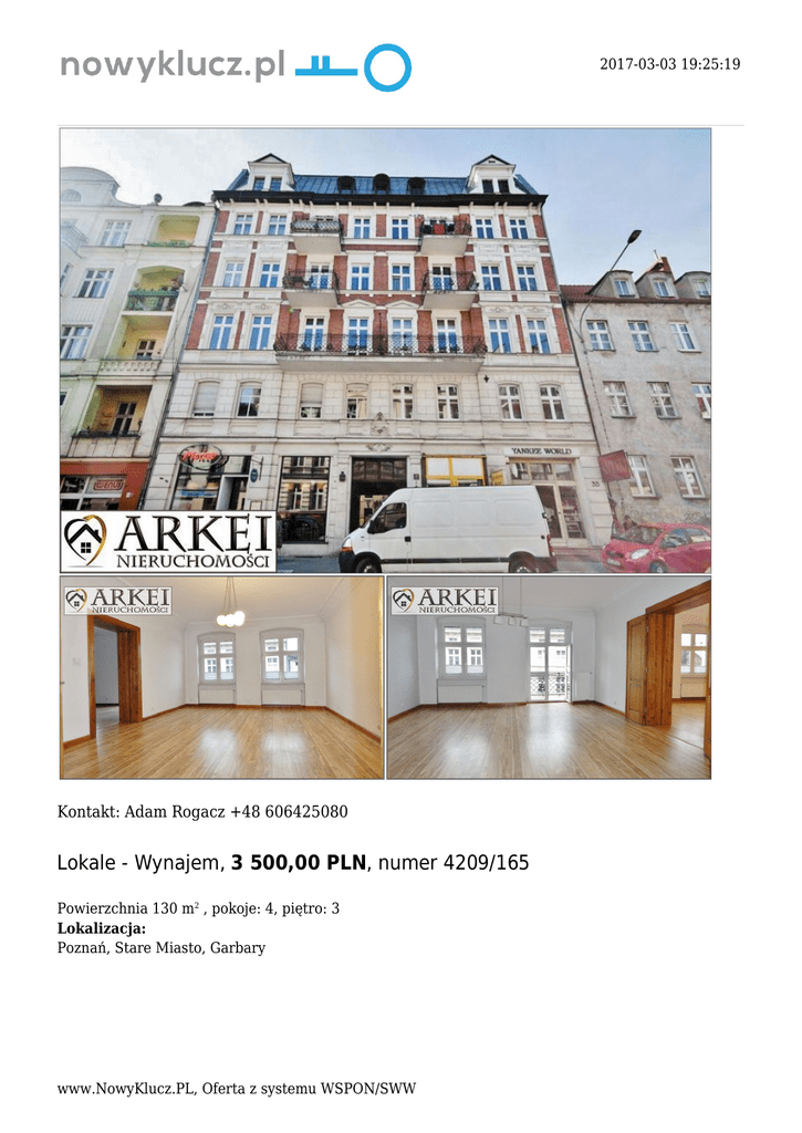 2017-03-03 19:25:19 Kontakt: Adam Rogacz +48 606425080 Lokale - Wynajem, 3 500,00 PLN, numer 4209/165 Powierzchnia 130 m2 , pokoje: 4, piętro: 3 Lokalizacja: Poznań, Stare Miasto, Garbary www.NowyKlucz.PL, Oferta z systemu WSPON/SWW 2017-03-03 19:25:19 Informacje o nieruchomości: Okazja! Duży lokal biurowy na ulicy Garbary w centrum Poznania. Wysoki standard. 27zł za m2. POLECAM NA WYNAJEM DUŻE(130m2), CZTEROPOKOJOWE, WYREMONTOWANE MIESZKANIE W ODRESTAUROWANEJ KAMIENICY W SAMYM CENTRUM POZNANIA, NIEDALEKO STAREGO RYNKU. IDEALNE NA BIURO, KANCELARIĘ PRAWNĄ, ITP. OFERTA DOSTĘPNA WYŁĄCZNIE W NASZYM BIURZE. OPIS MIESZKANIA: Mieszkanie położone na 3 piętrze, w czteropiętrowej, odrestaurowanej, zabytkowej kamienicy z 1902r. Kamienica położona jest przy ul.Garbary w samym centrum Poznania. Mieszkanie (pow. 130m2) składa się z 4 pokoi (ok: 28m2, 25m2, 25m2, 18m2), kuchni (20m2) ze skrytką, łazienki z wc i korytarza. Do mieszkania przynależy również piwnica (ok. 6m2) STANDARD WYKOŃCZENIA: Mieszkanie o powierzchni 130m2; po generalnym remoncie, jest bardzo zadbane. Wszystkie instalacje w mieszkaniu zostały wymienione. Na podłodze we wszystkich pokojach oraz kuchni położone są wysokogatunkowe panele o podwyższonej klasie ścieralności. Łazienka z toaletą w glazurze. Ściany i sufity we wszystkich pomieszczeniach: gładź. W jednym z pokoi jest wykonana zabudowa na długości całej ściany: ogromna szafa typu komandor. W salonie (26m2) jest nowy, w pełni sprawny, piękny piec kaflowy, który daje możliwość dodatkowego i taniego ogrzewania mieszkania. Wszystkie okna w mieszkaniu plastikowe. Jest możliwość podłączenia telewizji kablowej, telefonu i internetu (obecnie usługi te dostarcza firma INEA). Ogrzewanie i ciepła woda: nowoczesny piec dwufunkcyjny z programatorem. Budynek kamienicy jest ocieplony i odrestaurowany, a klatki schodowe są wyremontowane i odmalowane. Podwórze czyste i zadbane: wyłożone kostką brukową, posadzone krzewy ozdobne. Mieszkanie po remoncie, bardzo czyste i ładne. Do zamieszkania od zaraz bez wkładu finansowego. Idealne dla większej rodziny, na lokal biurowy, pod inwestycję. LOKALIZACJA: Mieszkanie w ścisłym centrum Poznania, nieopodal Starego Rynku. Mieszkanie bardzo dobrze skomunikowane z innymi częściami miasta, w pobliżu przystanki: tramwajowe (linie : 5,3,16) i autobusowe (linie: 76,74, 90). Wokoło znajduje się bardzo dużo sklepów i punktów usługowych. Bardzo blisko jest też stąd na AWF oraz na Politechnikę Poznańską. KOSZTY NAJMU: CZYNSZ dla właściciela 3500zł 23% VAT /mies. OPŁATY (czynsz do wspólnoty 500zł/mies. opłaty licznikowe) STAN PRAWNY: pełna własność z księgą wieczystą Gorąco polecam i zapraszam na prezentację. KONTAKT: ADAM ROGACZ doradca ds. nieruchomości TEL. 606 425 080 / [email protected] / www.nieruchomosci.arkei.pl OFERTA LICENCJONOWANEGO POŚREDNIKA GWARANCJĄ BEZPIECZNEJ TRANSAKCJI. Jeżeli interesuje Państwa bezpieczna, szybka i skuteczna SPRZEDAŻ lub KUPNO nieruchomości proszę o kontakt. Zapraszam również do odwiedzenia strony internetowej naszego biura ARKEI NIERUCHOMOŚCI pod adresem www.nieruchomosci.arkei.pl oraz do kontaktu telefonicznego. Oferta znajduje się pod opieką pośrednika nr licencji: 18407. Powyższy opis ma charakter informacyjny i nie stanowi oferty w rozumieniu przepisów Kodeksu Cywilnego. Kontakt: Adam Rogacz [email protected] www.NowyKlucz.PL, Oferta z systemu WSPON/SWW 2017-03-03 19:25:19 +48 606425080 www.NowyKlucz.PL, Oferta z systemu WSPON/SWW 2017-03-03 19:25:19 Numer 4209/165. Kontakt: Adam Rogacz +48 606425080 www.NowyKlucz.PL, Oferta z systemu WSPON/SWW 2017-03-03 19:25:19 Numer 4209/165. Kontakt: Adam Rogacz +48 606425080 www.NowyKlucz.PL, Oferta z systemu WSPON/SWW 2017-03-03 19:25:19 Numer 4209/165. Kontakt: Adam Rogacz +48 606425080 www.NowyKlucz.PL, Oferta z systemu WSPON/SWW 2017-03-03 19:25:19 Numer 4209/165. Kontakt: Adam Rogacz +48 606425080 www.NowyKlucz.PL, Oferta z systemu WSPON/SWW 2017-03-03 19:25:19 Numer 4209/165. Kontakt: Adam Rogacz +48 606425080 www.NowyKlucz.PL, Oferta z systemu WSPON/SWW
