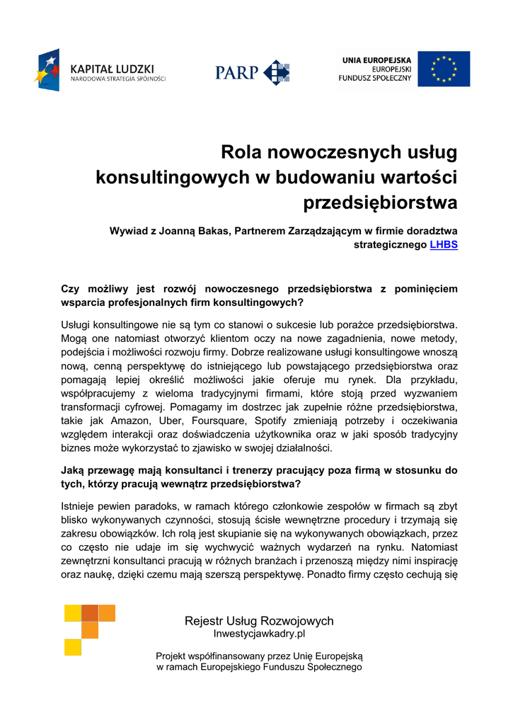 Rola nowoczesnych usług konsultingowych w budowaniu wartości przedsiębiorstwa Wywiad z Joanną Bakas, Partnerem Zarządzającym w firmie doradztwa strategicznego LHBS Czy możliwy jest rozwój nowoczesnego przedsiębiorstwa z pominięciem wsparcia profesjonalnych firm konsultingowych? Usługi konsultingowe nie są tym co stanowi o sukcesie lub porażce przedsiębiorstwa. Mogą one natomiast otworzyć klientom oczy na nowe zagadnienia, nowe metody, podejścia i możliwości rozwoju firmy. Dobrze realizowane usługi konsultingowe wnoszą nową, cenną perspektywę do istniejącego lub powstającego przedsiębiorstwa oraz pomagają lepiej określić możliwości jakie oferuje mu rynek. Dla przykładu, współpracujemy z wieloma tradycyjnymi firmami, które stoją przed wyzwaniem transformacji cyfrowej. Pomagamy im dostrzec jak zupełnie różne przedsiębiorstwa, takie jak Amazon, Uber, Foursquare, Spotify zmieniają potrzeby i oczekiwania względem interakcji oraz doświadczenia użytkownika oraz w jaki sposób tradycyjny biznes może wykorzystać to zjawisko w swojej działalności. Jaką przewagę mają konsultanci i trenerzy pracujący poza firmą w stosunku do tych, którzy pracują wewnątrz przedsiębiorstwa? Istnieje pewien paradoks, w ramach którego członkowie zespołów w firmach są zbyt blisko wykonywanych czynności, stosują ścisłe wewnętrzne procedury i trzymają się zakresu obowiązków. Ich rolą jest skupianie się na wykonywanych obowiązkach, przez co często nie udaje im się wychwycić ważnych wydarzeń na rynku. Natomiast zewnętrzni konsultanci pracują w różnych branżach i przenoszą między nimi inspirację oraz naukę, dzięki czemu mają szerszą perspektywę. Ponadto firmy często cechują się Rejestr Usług Rozwojowych Inwestycjawkadry.pl Projekt współfinansowany przez Unię Europejską w ramach Europejskiego Funduszu Społecznego tendencją do nadmiernego skupienia na aktualnych klientach, przez co zaniedbują potrzeby tych potencjalnych. Jaką najważniejszą wartość może uzyskać przedsiębiorstwo ze zewnętrznej firmy konsultingowej lub think tanku? strony Przedsiębiorstwa mają tendencję do nadmiernego skupiania się na własnej branży lub kategorii i zbyt często nie zdają sobie sprawy, że często to przełomowe innowacje w niepowiązanych branżach kształtują potrzeby i oczekiwania ich klientów. Współpracujemy z kilkoma markami samochodów. Żadna z nich nie zdawała sobie sprawy z istnienia potrzeby tak podstawowej jak możliwość zamówienia jazdy próbnej przez telefon komórkowy. W międzyczasie ich potencjalni klienci nie rozumieli dlaczego mogą zamówić transport Uber za pomocą jednego kliknięcia, ale nie są w stanie zamówić jazdy próbnej autem z sektora dóbr luksusowych w ten sam przystępny i szybki sposób. Właśnie to często dajemy naszym klientom w LHBS, otwieramy im oczy na to, jaki wpływ na potrzeby i pragnienia ich klientów mają doświadczenia w innych kategoriach. Definiujemy możliwości innowacji oraz poprawy odbioru wśród konsumentów. W jakich sytuacjach wsparcie zewnętrznych konsultantów jest absolutnie niezbędne dla firmy, a kiedy można się bez niego obejść? Przedsiębiorstwo zawsze może skorzystać na usługach konsultingowych jeśli tylko ma ekspozycję na wzrost rynkowy poza własną branżą. Natomiast nie będzie w stanie zyskać w sytuacji gdy wewnętrzna kultura oraz sposób działania nie są elastyczne i podatne na zmianę oraz integrację nowych idei. Usługi konsultingowe to również dobra platforma dla zarządu do omawiania możliwości, wyzwań i sposobów na to by im sprostać, zarówno wewnętrznie jak i zewnętrznie. Z punktu widzenia przedsiębiorcy: czy lepiej jest współpracować z jedną firmą konsultingową czy raczej różnicować podwykonawców i wybierać grupę tych, którzy są najlepsi w swojej konkretnej dziedzinie? Rejestr Usług Rozwojowych Inwestycjawkadry.pl Projekt współfinansowany przez Unię Europejską w ramach Europejskiego Funduszu Społecznego Jak już mówiłam wcześniej, firmy bardzo skupiają się na swoich kompetencjach i często nie dysponują wiedzą ekspercką poza podstawowymi kompetencjami swojej organizacji. Potrzeby w biznesie są różnią się wzajemnie pod względem innowacji, rozwoju organizacji czy kultury. Firmy konsultingowe również posiadają obszary specjalizacji, więc to czy przedsiębiorstwo będzie współpracować z jednym czy wieloma dostawcami zależy od jego potrzeb w danym momencie. Z mojego doświadczenia wynika, że firmy ciągle oscylują pomiędzy konsolidacją działalności we współpracy z ograniczoną liczbą firm konsultingowych, a poszerzaniem wachlarza usługodawców, na korzyść bardziej wyspecjalizowanych konsultantów. Nie istnieje idealne rozwiązanie, trzeba wybrać takie, które najlepiej sprawdzi się w danej sytuacji. Jak dalece konsultanci powinni ingerować w zasadniczy przedsiębiorstwa? Czy są granice, których nie powinni przekraczać? charakter To w dużej mierze zależy od działalności i zagadnień biznesowych. Kilkukrotnie współpracowaliśmy z firmami, których zasadniczą działalność niszczyły przełomowe innowacje innych graczy na rynku. W takich przypadkach, pracowaliśmy z klientami nad tym, żeby całkowicie przedefiniować podstawowy charakter przedsiębiorstwa. W innych przypadkach, firmy konsultingowe takie jak nasza współpracują z przedsiębiorstwami w dążeniu do optymalizacji ich podstawowej działalności, aby na tym polu mogły one zdobyć przewagę konkurencyjną. Joanna Bakas jest Parterem Zarządzającym w LHBS Consulting Berlin - firmie, którą założyła wraz z partnerem, Stefanem Erschwendnerem w 2010 r. LHBS specjalizuje się w innowacjach i marketingu. W szybko zmieniającym się świecie biznesu, LHBS jest zaangażowana w obserwowanie, wsłuchiwanie się i przekładanie oznak zmian na strategiczne możliwości i mocne pomysły w obszarze pro