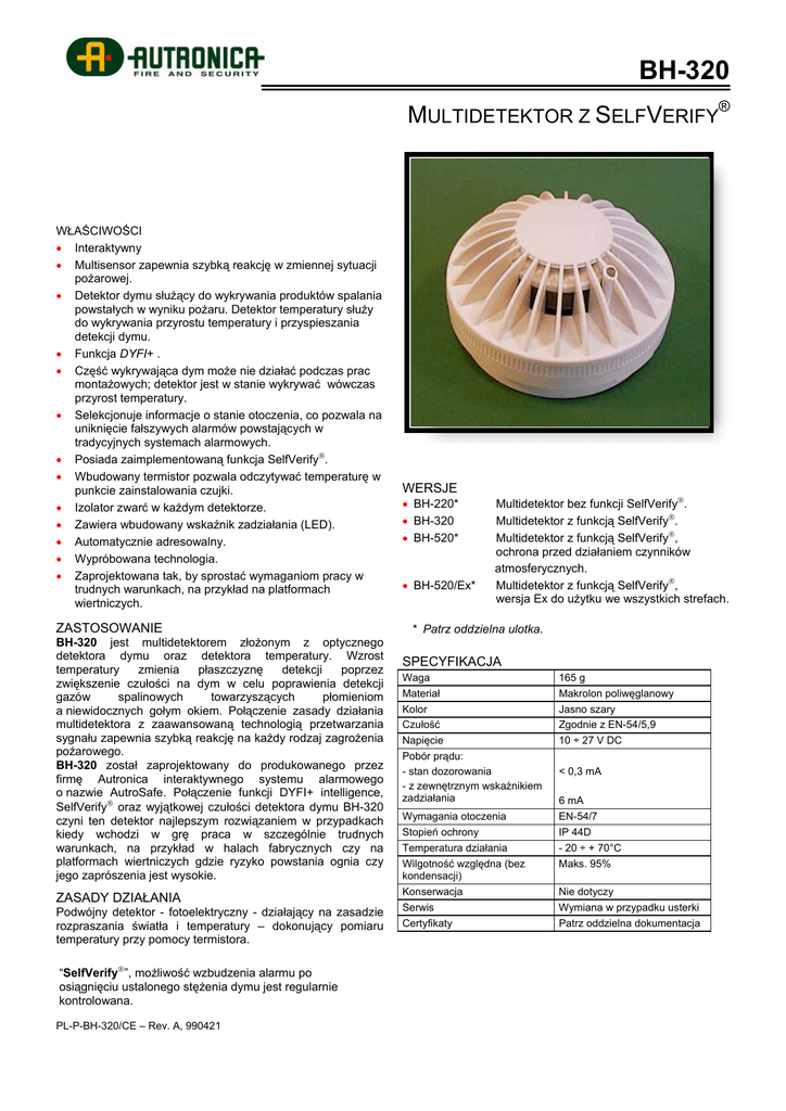 BH-320 MULTIDETEKTOR Z SELFVERIFY® WŁAŚCIWOŚCI • Interaktywny • Multisensor zapewnia szybką reakcję w zmiennej sytuacji pożarowej. • Detektor dymu służący do wykrywania produktów spalania powstałych w wyniku pożaru. Detektor temperatury służy do wykrywania przyrostu temperatury i przyspieszania detekcji dymu. • Funkcja DYFI+ . • Część wykrywająca dym może nie działać podczas prac montażowych; detektor jest w stanie wykrywać wówczas przyrost temperatury. • Selekcjonuje informacje o stanie otoczenia, co pozwala na uniknięcie fałszywych alarmów powstających w tradycyjnych systemach alarmowych. • Posiada zaimplementowaną funkcja SelfVerify. • Wbudowany termistor pozwala odczytywać temperaturę w punkcie zainstalowania czujki. • Izolator zwarć w każdym detektorze. • Zawiera wbudowany wskaźnik zadziałania (LED). • Automatycznie adresowalny. • Wypróbowana technologia. • Zaprojektowana tak, by sprostać wymaganiom pracy w trudnych warunkach, na przykład na platformach wiertniczych. ZASTOSOWANIE BH-320 jest multidetektorem złożonym z optycznego detektora dymu oraz detektora temperatury. Wzrost temperatury zmienia płaszczyznę detekcji poprzez zwiększenie czułości na dym w celu poprawienia detekcji gazów spalinowych towarzyszących płomieniom a niewidocznych gołym okiem. Połączenie zasady działania multidetektora z zaawansowaną technologią przetwarzania sygnału zapewnia szybką reakcję na każdy rodzaj zagrożenia pożarowego. BH-320 został zaprojektowany do produkowanego przez firmę Autronica interaktywnego systemu alarmowego o nazwie AutroSafe. Połączenie funkcji DYFI+ intelligence, SelfVerify oraz wyjątkowej czułości detektora dymu BH-320 czyni ten detektor najlepszym rozwiązaniem w przypadkach kiedy wchodzi w grę praca w szczególnie trudnych warunkach, na przykład w halach fabrycznych czy na platformach wiertniczych gdzie ryzyko powstania ognia czy jego zaprószenia jest wysokie. ZASADY DZIAŁANIA Podwójny detektor - fotoelektryczny - działający na zasadzie rozpraszania światła i temperatury – dokonujący pomiaru temperatury przy pomocy termistora. “SelfVerify”, możliwość wzbudzenia alarmu po osiągnięciu ustalonego stężenia dymu jest regularnie kontrolowana. PL-P-BH-320/CE – Rev. A, 990421 WERSJE • BH-220* • BH-320 • BH-520* • BH-520/Ex* Multidetektor bez funkcji SelfVerify. Multidetektor z funkcją SelfVerify. Multidetektor z funkcją SelfVerify, ochrona przed działaniem czynników atmosferycznych. Multidetektor z funkcją SelfVerify, wersja Ex do użytku we wszystkich strefach. * Patrz oddzielna ulotka. SPECYFIKACJA Waga Materiał Kolor Czułość 165 g Makrolon poliwęglanowy Jasno szary Zgodnie z EN-54/5,9 Napięcie Pobór prądu: - stan dozorowania - z zewnętrznym wskaźnikiem zadziałania 10 ÷ 27 V DC Wymagania otoczenia Stopień ochrony Temperatura działania Wilgotność względna (bez kondensacji) Konserwacja Serwis Certyfikaty < 0,3 mA 6 mA EN-54/7 IP 44D - 20 ÷ + 70°C Maks. 95% Nie dotyczy Wymiana w przypadku usterki Patrz oddzielna dokumentacja Multidetektor z SelfVerify, BH-320 Kod Produktu Opis BWA-100 Gniazdo BHH-320 Multidetektor BWP-100/20 BWP-100/25 POŁĄCZENIA W opcji Podstawa gniazda z dławikami M20 W opcji Podstawa gniazda z dławikami M25 1. – wejście 2. – wyjście 3. wspólny zacisk (+ wejście, + wyjście) 4. zewnętrzny wskaźnik LED WYMIARY Sposób użycie wyjścia LED: Kiedy dodatkowe urządzenie podłączone jest do wyjścia LED, między zaciskami 1 i 4 w gnieździe należy podłączyć warystor – Siemens S10WS07K25 (39V) – Autronica art. nr 8464-003.5039. Zewnętrzny wskaźnik LED jest podłączany do zacisków 3 i 4. Końcówka 3 jest zaciskiem dodatnim. SEALAB Sp. z o.o. ul. Koperkowa 57 81-589 Gdynia tel.: (58) 669 20 40, fax: (58) 669 20 49 www.sealab.com.pl