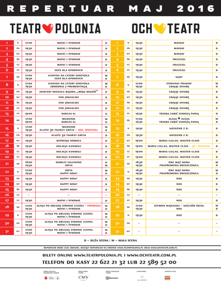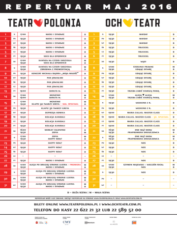 r e p e r t u a r 2016 m a j 1 n 17:00 matki i synowie d 1 n 19:30 mayday d 2 pn 19:30 matki i synowie d 2 pn 19:30 mayday d 3 wt 19:30 matki i synowie d 3 wt 19:30 mayday d 4 śr 19:30 matki i synowie d 4 śr 19:30 truciciel d 5 cz 19:30 matki i synowie d 5 cz 19:30 truciciel d 6 pt 19:30 seks dla opornych d 6 pt 19:30 truciciel d so 17:00 19:30 kantata na cztery skrzydła seks dla opornych m d 7 so 19:30 wąsy d 8 n 17:00 19:30 kantata na cztery skrzydła zbrodnia z premedytacją m d 8 n 17:00 19:30 stosunki prawne udając ofiarę m d 9 pn 19:30 koncert michała bajora „moja miłość” d 9 pn 19:30 udając ofiarę d 10 wt 19:30 pan jowialski d 10 wt 19:30 udając ofiarę d 11 śr 19:30 pan jowialski d 11 śr 19:30 udając ofiarę d 12 cz 19:30 pan jowialski d 12 cz 19:30 udając ofiarę d 13 pt 19:00 danuta w. d 13 pt 19:30 trzeba zabić starszą panią d 14 so 17:00 19:00 mgnienie danuta w. m d 14 so 17:00 19:30 alicja ♥ alicja trzeba zabić starszą panią m d 15 n 17:00 19:30 mgnienie klaps! 50 twarzy greya – 100. spektakl m d 15 n 19:30 weekend z r. d 16 pn 19:30 klaps! 50 twarzy greya d 16 pn 19:30 weekend z r. d 17 wt 19:30 depresja komika d 17 wt 19:00 maria callas. master class d 18 śr 19:30 kolacja kanibali d 18 śr 19:00 maria callas. master class – 50. spektakl d 19 cz 19:30 kolacja kanibali d 19 cz 19:00 maria callas. master class d 20 pt 19:30 kolacja kanibali d 20 pt 19:00 maria callas. master class d so 16:00 19:30 shirley valentine zofia d m so 16:30 19:30 one mąż show prapremiera dreszczowca m d 22 n 17:00 19:30 zofia happy now? m d 22 n 16:30 19:30 one mąż show prapremiera dreszczowca m d 23 pn 19:30 happy now? d 23 pn 19:30 nos d 24 wt 19:30 happy now? d 24 wt 19:30 nos d 25 śr 19:30 happy now? d 25 śr 19:30 nos d 26 cz – – – 26 cz – – – 27 pt 19:30 matki i synowie d 27 pt 19:30 nos d 28 so 12:00 19:30 alicja po drugiej stronie lustra – premiera matki i synowie m d 28 so 17:00 19:30 szymon majewski – wieczór f ochu nos m d 29 n 12:00 19:30 alicja po drugiej stronie lustra matki i synowie m d 29 n 19:30 nos d 30 pn 12:00 19:30 alicja po drugiej stronie lustra matki i synowie m d 30 pn – – – 31 wt 12:00 19:30 alicja po drugiej stronie lustra matki i synowie m d 31 wt – – – 7 21 21 d – duża scena | m – mała scena repertuar może ulec zmianie. bieżący repertuar na stronie www.teatrpolonia.pl oraz www.ochteatr.com.pl bilety online www.teatrpolonia.pl i www.ochteatr.com.pl telefon do kasy 22 622 21 32 lub 22 589 52 00 PREMIERY W ROKU 2016 DOFINANSOWANO ZE ŚRODKÓW: DORADCA PRAWNY TEATRÓW: MECENAS TECHNOLOGICZNY TEATRÓW: PARTNER PREMIER: PARTNER OCH-TEATRU: