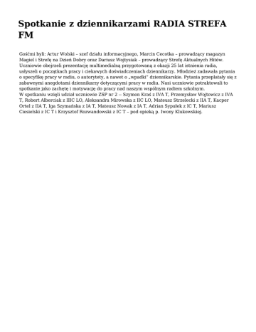 Spotkanie z dziennikarzami RADIA STREFA FM Gośćmi byli: Artur Wolski – szef działu informacyjnego, Marcin Cecotka – prowadzący magazyn Magiel i Strefę na Dzień Dobry oraz Dariusz Wojtysiak – prowadzący Strefę Aktualnych Hitów. Uczniowie obejrzeli prezentację multimedialną przygotowaną z okazji 25 lat istnienia radia, usłyszeli o początkach pracy i ciekawych doświadczeniach dziennikarzy. Młodzież zadawała pytania o specyfikę pracy w radiu, o autorytety, a nawet o „wpadki” dziennikarskie. Pytania przeplatały się z zabawnymi anegdotami dziennikarzy dotyczącymi pracy w radiu. Nasi uczniowie potraktowali to spotkanie jako zachętę i motywację do pracy nad naszym wspólnym radiem szkolnym. W spotkaniu wzięli udział uczniowie ZSP nr 2 -- Szymon Kraś z IVA T, Przemysław Wojtowicz z IVA T, Robert Alberciak z IIIC LO, Aleksandra Mirowska z IIC LO, Mateusz Strzelecki z IIA T, Kacper Ortel z IIA T, Iga Szymańska z IA T, Mateusz Nowak z IA T, Adrian Sypułek z IC T, Mariusz Ciesielski z IC T i Krzysztof Rozwandowski z IC T – pod opieką p. Iwony Klukowskiej.