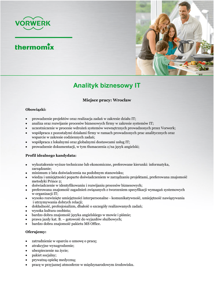Analityk biznesowy IT Miejsce pracy: Wrocław Obowiązki: prowadzenie projektów oraz realizacja zadań w zakresie działu IT; analiza oraz rozwijanie procesów biznesowych firmy w zakresie systemów IT; uczestniczenie w procesie wdrożeń systemów wewnętrznych prowadzonych przez Vorwerk; współpraca z pozostałymi działami firmy w ramach prowadzonych prac analitycznych oraz wsparcie w zakresie codziennych zadań; współpraca z lokalnymi oraz globalnymi dostawcami usług IT; prowadzenie dokumentacji, w tym tłumaczenia z/na język angielski; Profil idealnego kandydata: wykształcenie wyższe techniczne lub ekonomiczne, preferowane kierunki: informatyka, zarządzanie; minimum 2 lata doświadczenia na podobnym stanowisku; wiedza i umiejętności poparte doświadczeniem w zarządzaniu projektami, preferowana znajomość metodyki Prince 2; doświadczenie w identyfikowaniu i rozwijaniu procesów biznesowych; preferowana znajomość zagadnień związanych z tworzeniem specyfikacji wymagań systemowych w organizacji IT; wysoko rozwinięte umiejętności interpersonalne - komunikatywność, umiejętność nawiązywania i utrzymywania dobrych relacji; dokładność, profesjonalizm, dbałość o szczegóły realizowanych zadań; wysoka kultura osobista; bardzo dobra znajomość języka angielskiego w mowie i piśmie; prawa jazdy kat. B. – gotowość do wyjazdów służbowych; bardzo dobra znajomość pakietu MS Office. Oferujemy: zatrudnienie w oparciu o umowę o pracę; atrakcyjne wynagrodzenie; ubezpieczenie na życie; pakiet socjalny; prywatną opiekę medyczną; pracę w przyjaznej atmosferze w międzynarodowym środowisku.