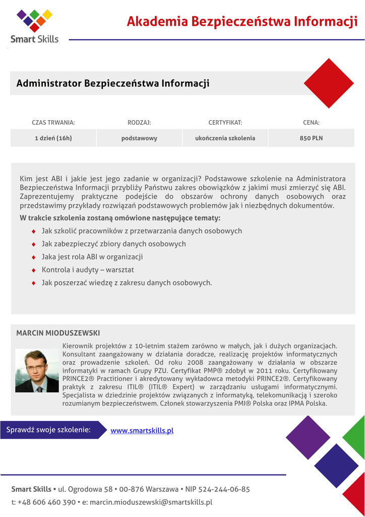 Akademia Bezpieczeństwa Informacji «Tytuł» Administrator Bezpieczeństwa Informacji CZAS TRWANIA: RODZAJ: CERTYFIKAT: CENA: 1 dzień (16h) podstawowy ukończenia szkolenia 850 PLN Kim jest ABI i jakie jest jego zadanie w organizacji? Podstawowe szkolenie na Administratora Bezpieczeństwa Informacji przybliży Państwu zakres obowiązków z jakimi musi zmierzyć się ABI. Zaprezentujemy praktyczne podejście do obszarów ochrony danych osobowych oraz przedstawimy przykłady rozwiązań podstawowych problemów jak i niezbędnych dokumentów. W trakcie szkolenia zostaną omówione następujące tematy: Jak szkolić pracowników z przetwarzania danych osobowych Jak zabezpieczyć zbiory danych osobowych Jaka jest rola ABI w organizacji Kontrola i audyty – warsztat Jak poszerzać wiedzę z zakresu danych osobowych. MARCIN MIODUSZEWSKI Kierownik projektów z 10-letnim stażem zarówno w małych, jak i dużych organizacjach. Konsultant zaangażowany w działania doradcze, realizację projektów informatycznych oraz prowadzenie szkoleń. Od roku 2008 zaangażowany w działania w obszarze informatyki w ramach Grupy PZU. Certyfikat PMP® zdobył w 2011 roku. Certyfikowany PRINCE2® Practitioner i akredytowany wykładowca metodyki PRINCE2®. Certyfikowany praktyk z zakresu ITIL® (ITIL® Expert) w zarządzaniu usługami informatycznymi. Specjalista w dziedzinie projektów związanych z informatyką, telekomunikacją i szeroko rozumianym bezpieczeństwem. Członek stowarzyszenia PMI® Polska oraz IPMA Polska. Sprawdź swoje szkolenie: www.smartskills.pl Smart Skills • ul. Ogrodowa 58 • 00-876 Warszawa • NIP 524-244-06-85 t: +48 606 460 390 • e: [email protected]