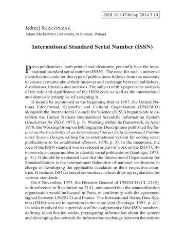 DOI 10.14746/ssp.2014.3.10 Jêdrzej SKRZYPCZAK Adam Mickiewicz University in Poznañ, Poland International Standard Serial Number (ISSN) P ress publications, both printed and electronic, generally bear the international standard serial number (ISSN). The need for such a universal identification code for this type of publications follows from the necessity to ensure certainty about their turnover and exchange between publishers, distributors, libraries and archives. The subject of this paper is the analysis of the role and significance of the ISSN code as well as the international and domestic principles of assigning it. It should be mentioned at the beginning that in 1967, the United Nations Educational, Scientific and Cultural Organization (UNESCO) alongside the International Council for Science (ICSU) began work to establish the United Nations International Scientific Information System (Guidelines for ISDS, 1973, p. 3). Working within its framework, in April 1970, the Working Group on Bibliographic Descriptions published the Report on the Feasibility of an International Series Data System and Preliminary System Design, calling for an international system for coding serial publications to be established (Report, 1970, p. 3). In the meantime, the idea of the ISSN standard was developed as part of work on the ISO/TC 46 to provide a unique number to identify serial publications (Santiago, 1973, p. 41). It should be explained here that the International Organization for Standardization is the international federation of national institutions in charge of developing the applicable standards in their respective countries. It features ISO technical committees, which draw up regulations for various standards. On 6 November, 1973, the Director-General of UNESCO (CL 2245), with reference to Resolution no 2141, announced that the standardisation organisation would be located in Paris, in conformity with the agreement signed between UNESCO and France. The International Series Data System (ISDS) was set in operation in the same year (Santiago, 1993, p. 41). Its tasks involved the supervision of the assignment of the ISSN numbers, defining identification codes, propagating information about the system and developing the network for information exchange between the entities 186 Jêdrzej Skrzypczak SP 3 ’14 involved (UNESCO, 1973, p. 1–3). A two-tier system of entities was set up to manage the data that identifies serial publications. Tier one is the International Centre, seated in Paris, operating within the French National Library, whereas tier two consists of national and regional centres. The ISDS network was officially established in 1975, followed one year later by the above-mentioned ISSN International Centre in Paris. The ISDS later became the ISSN. At present, the ISSN network consists of eighty-eight states (List of the Member Countries). By virtue of the Law of 27 June, 1997, Article 17, section 1, item 5 on libraries (Ustawa, 1997), the International Standard Serial Number is assigned in Poland by the National Library (Biblioteka Narodowa) in Warsaw, or, to be more precise, by the ISSN National Centre. Initially, the code was assigned according to the principles of the Polish Standard (Polska Norma) PN-76/N-01207, later replaced by PN-ISO 3297:2001 and, currently, by PN-ISO 3297:2010 (Polska Norma, 2010, p. 2–3). It implements the currently binding English version of the International Standard ISO 3297:2007, which replaced its predecessor, ISO 3297:1998. The main change involved the adaptation of the standard to a digitalised environment. A principle was adopted of assigning different media offering a given continuing resource different ISSN codes. It should be mentioned here that the International Standards are designed by technical committees operating in a given area, and later consulted with member organisations. To be approved, the International Standards need to be accepted by at least 75% of national organisations involved in the consultation procedure. The ISO 3297 standard was developed by the ISO/TG/46 technical committee, Information and Documentation, SC 9 Subcommittee, Identification and Description of Information Resources. The Polish Standard, which is a literal translation of the international document, was drawn up by the team KT 242 for Information and Documentation, and approved by the President of the Polish Committee for Standardisation on 28 December, 2009 (Polska Norma, 2010, p. 4). This document contains the definitions of terms that are of crucial importance for the issue discussed in this paper. The terms applied in this standard are different from those defined by the Law on the press. For instance, in conformity with item 2.1 a “continuous resource” (zasób ci¹g³y)1 is 1 Terminology applied herein conforms to that established by the National Library (S³ownik terminologiczny z zakresu bibliografii i katalogowania – http://sternik.bn.org.pl/vocab/index.php) (translator‘s note). SP 3 ’14 International Standard Serial Number (ISSN) 187 “a publicly accessible publication on any medium, published successively without a predetermined end” (Polska Norma, 2010, p. 6). It is additionally explained that “[s]uch a publication is usually published in successive or updated sets, usually coded numerically and/or chronologically. Continuous resources include such serial publications as newspapers, periodicals, journals, magazines, etc. and integrating resources such as ongoing updated loose-leaf publications and ongoing updated websites” (Polska Norma, 2010, p. 6). The term “serial publication” (wydawnictwo ci¹g³e) is defined as “a continuous resource published in successive, separate sets or parts, usually bearing numerical designations without a predetermined end” (Polska Norma, 2010, p. 6). They are exemplified by “[j]ournals, magazines, electronic journals, updated rosters, annual reports, newspapers, book series, as well as those jour